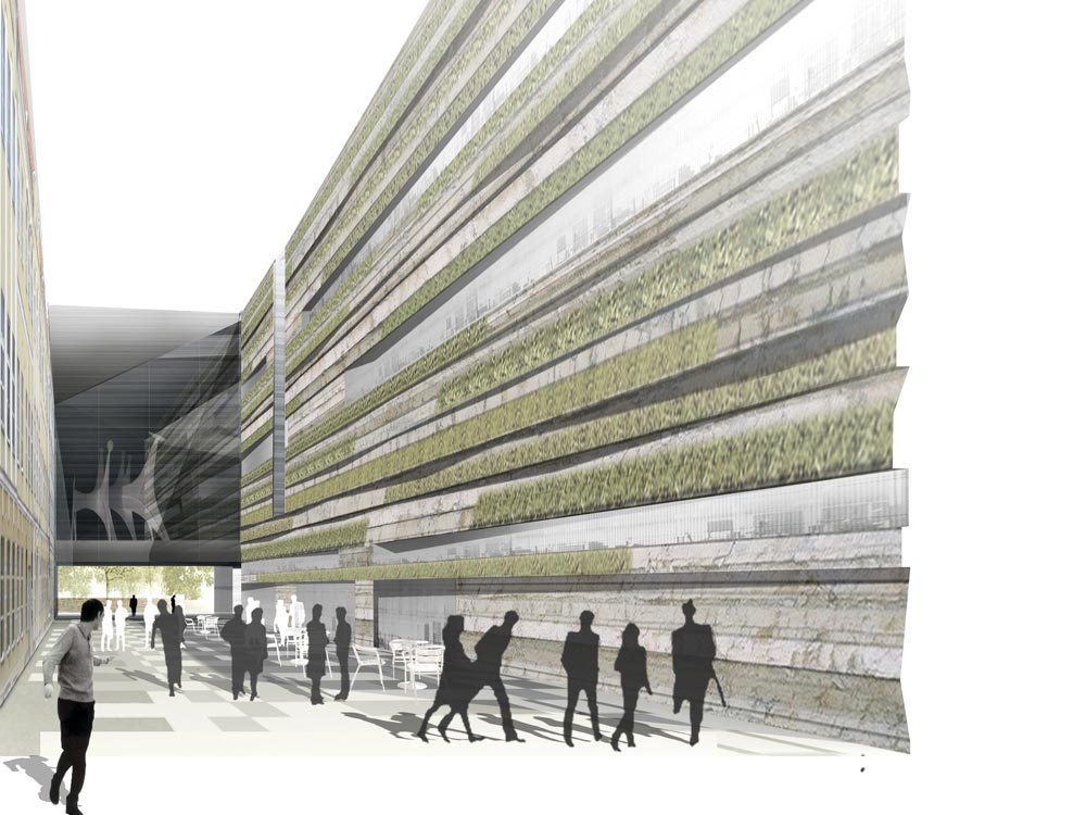New building should integrate in historical context and at the same time to be unique, representative and contemporary. This formal conflict is resolved in one hand by respecting the historical shape of the block and using mineral soft-tone facade materials, but on the other hand, applying the formally contemporary gesture of a funnel incisions to resolve urban and functional aspects.