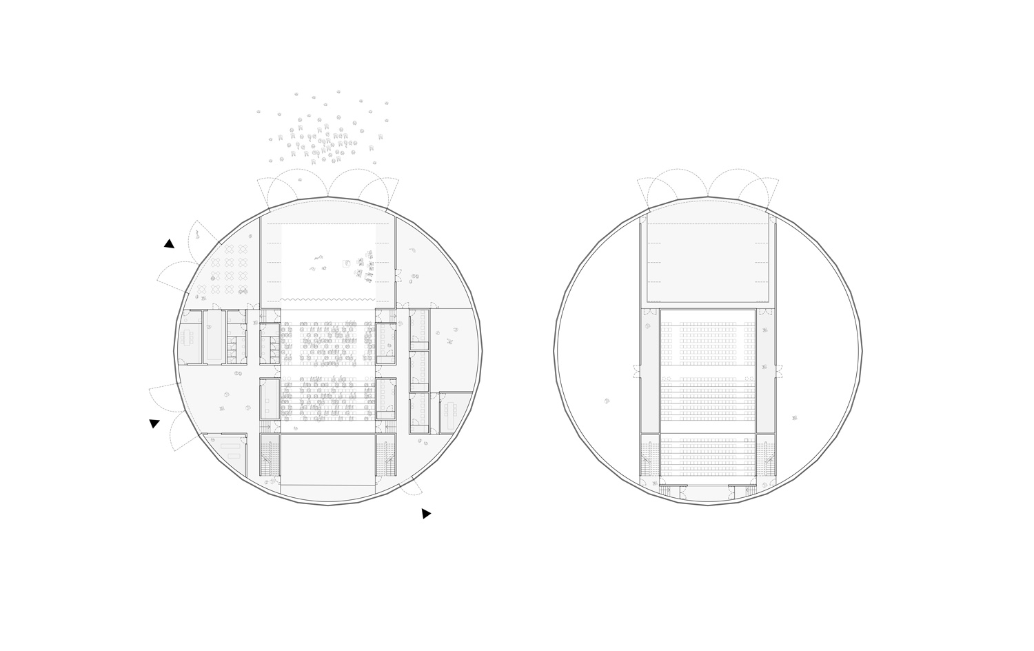 – La radura centrale e la platea sono entrambe aperte e la rappresentazione avviene contemporaneamente su due lati. In questo caso le due platee sono una la scenografia dell’altra e il palcoscenico è al centro.