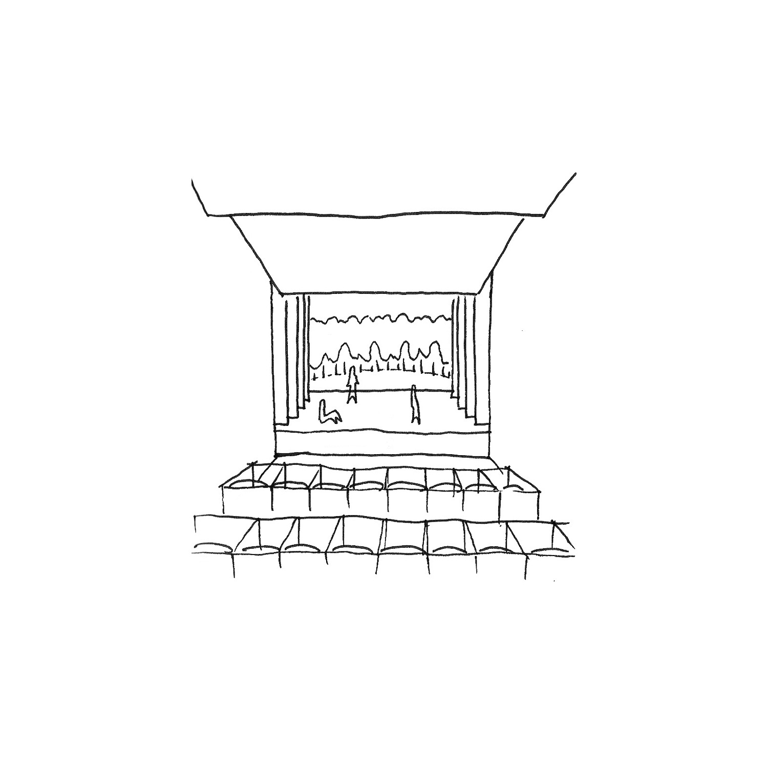 Seppure in pianta il teatro assuma la sequenza tradizionale di galleriaplateascena, la rappresentazione può essere completamente rivoluzionata dall’ apertura del portale che collega la scena alla radura centrale dando vita a nuove configurazioni: