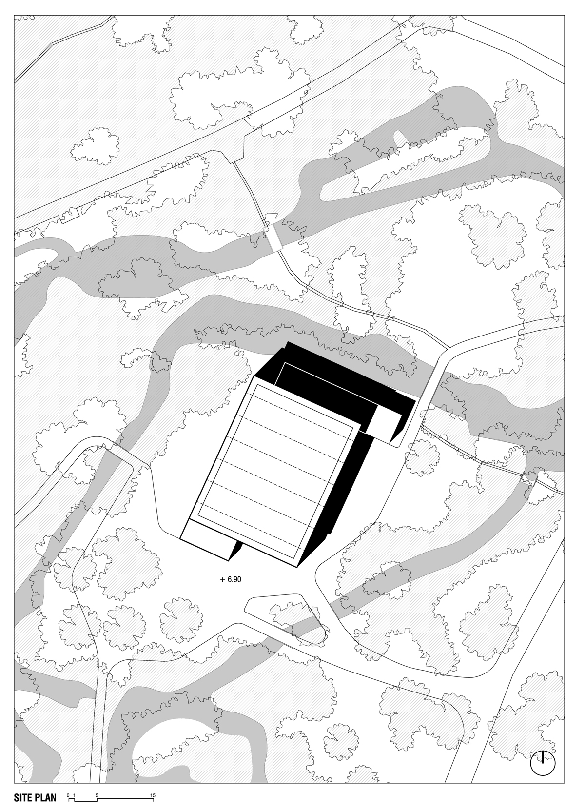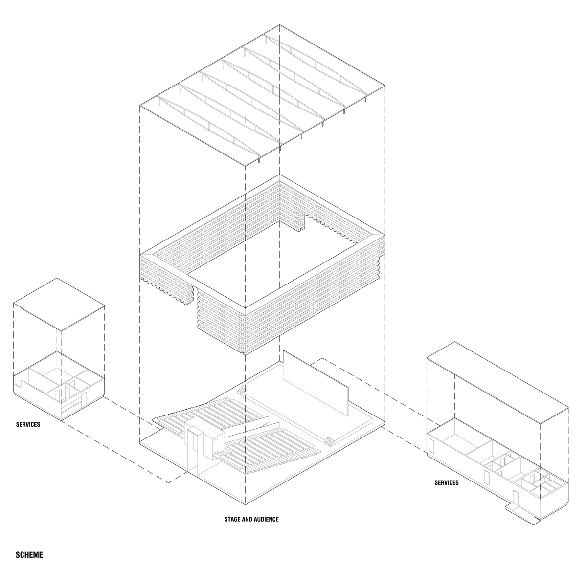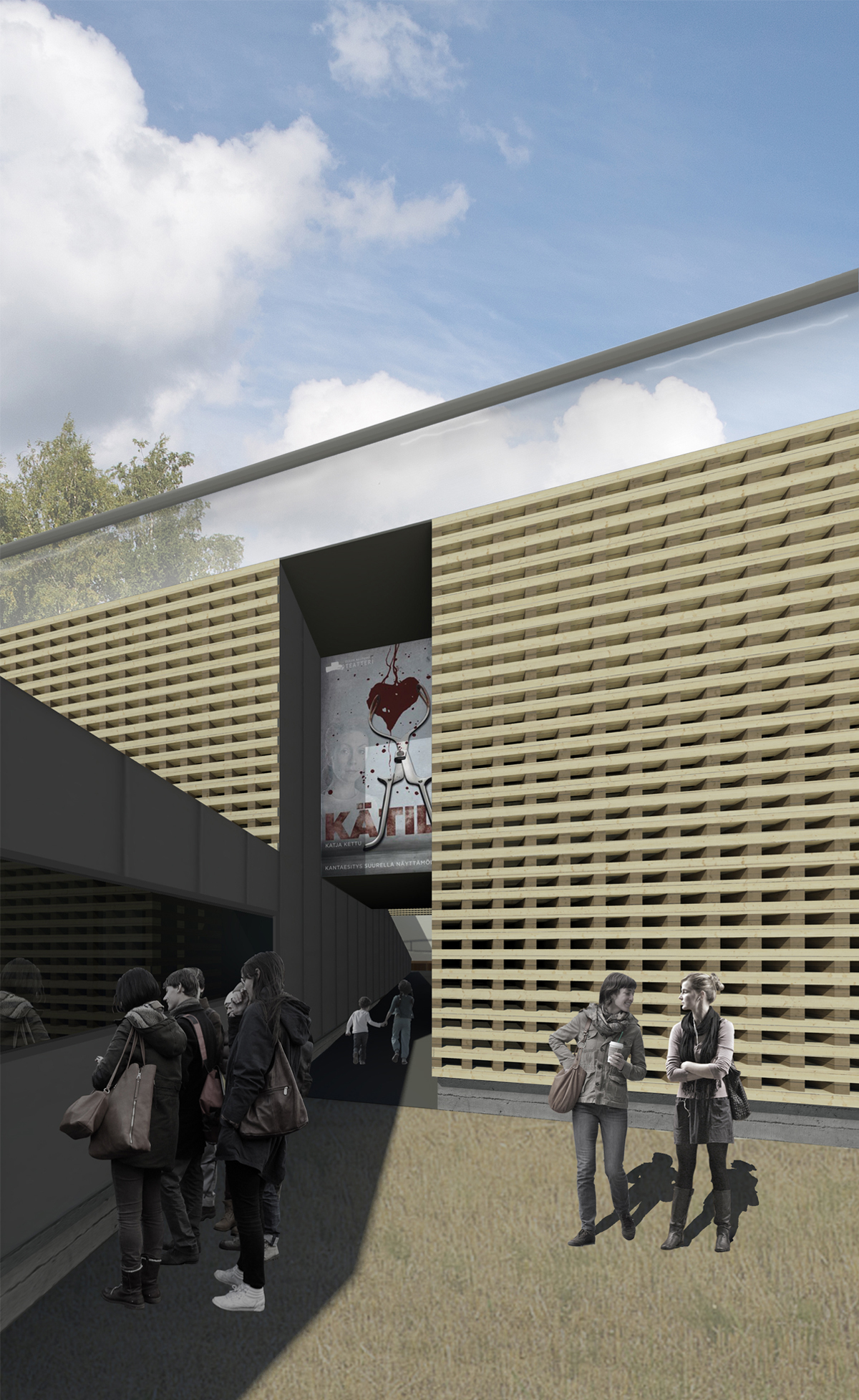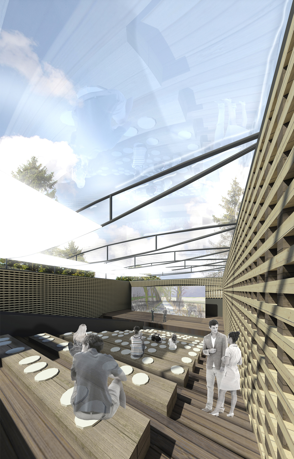 El proyecto plantea un espacio cerrado, a cubierto y con todos los requerimientos para el correcto funcionamiento de un teatro de verano, pero que a la vez permita disfrutar del paisaje y de la naturaleza del lugar donde se encuentra. Para ello, planteamos un espacio a la manera de un claro en el bosque, realizado por una estructura de piezas apiladas de madera que recuerdan un “Taapeli”, una construcción tradicional finlandesa para el secado de la madera. Dentro, el aire circula, las visiones perpendiculares a los muros permiten la visión a través, y todo bajo una visión del cielo posible gracias a una cubierta transparente de ETFE tensado que protege de la lluvia. Un interior que es exterior.