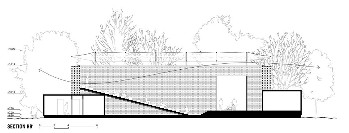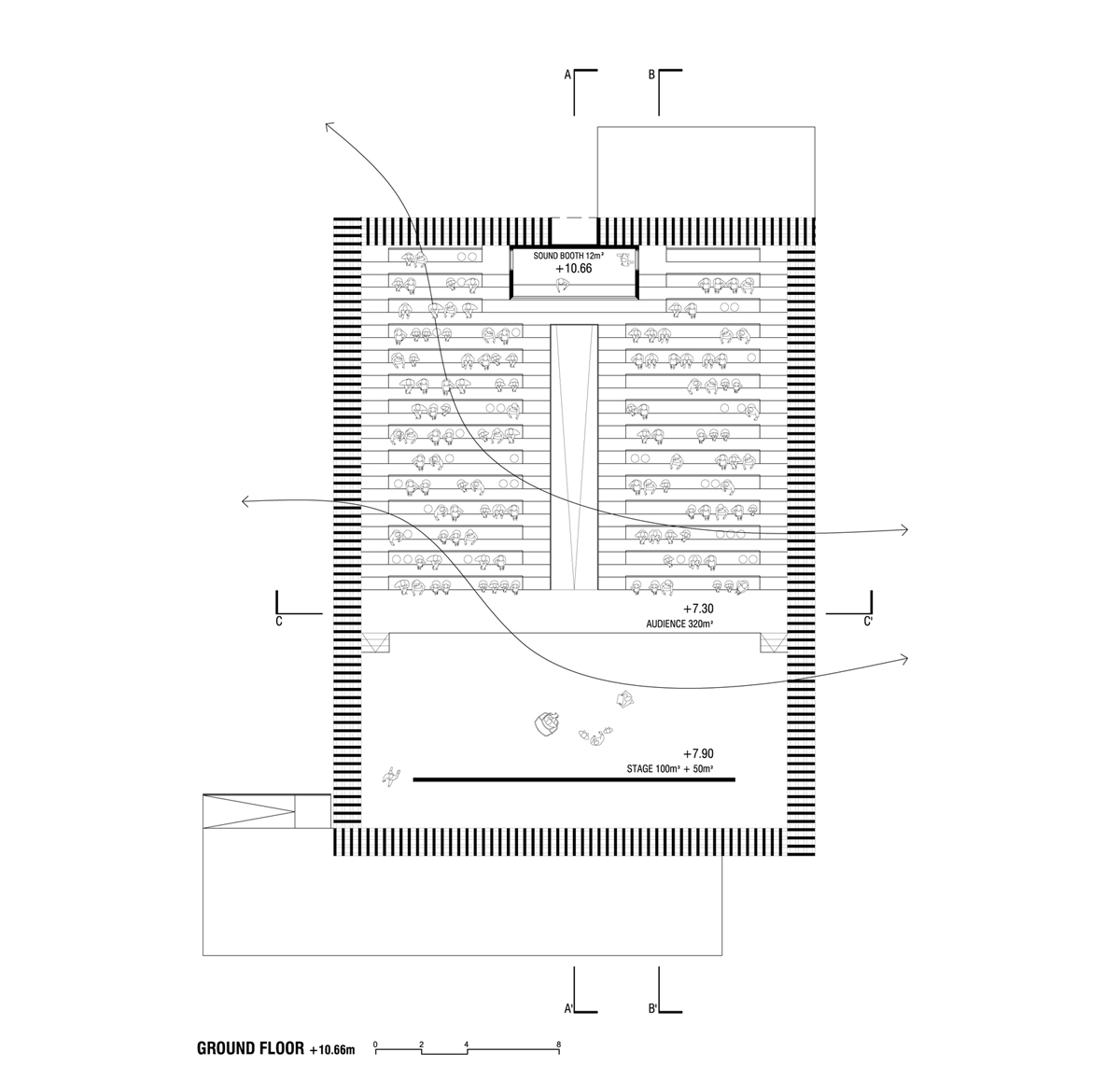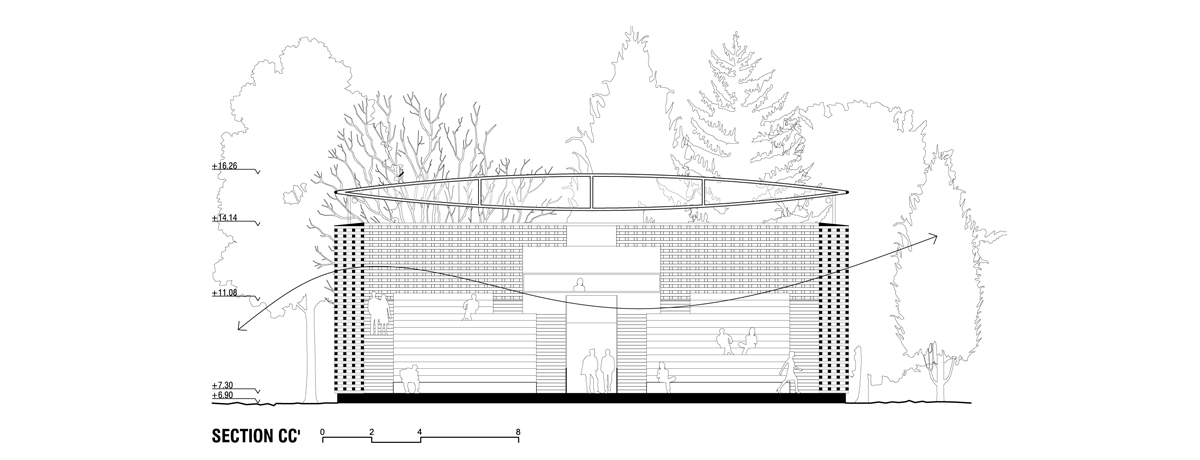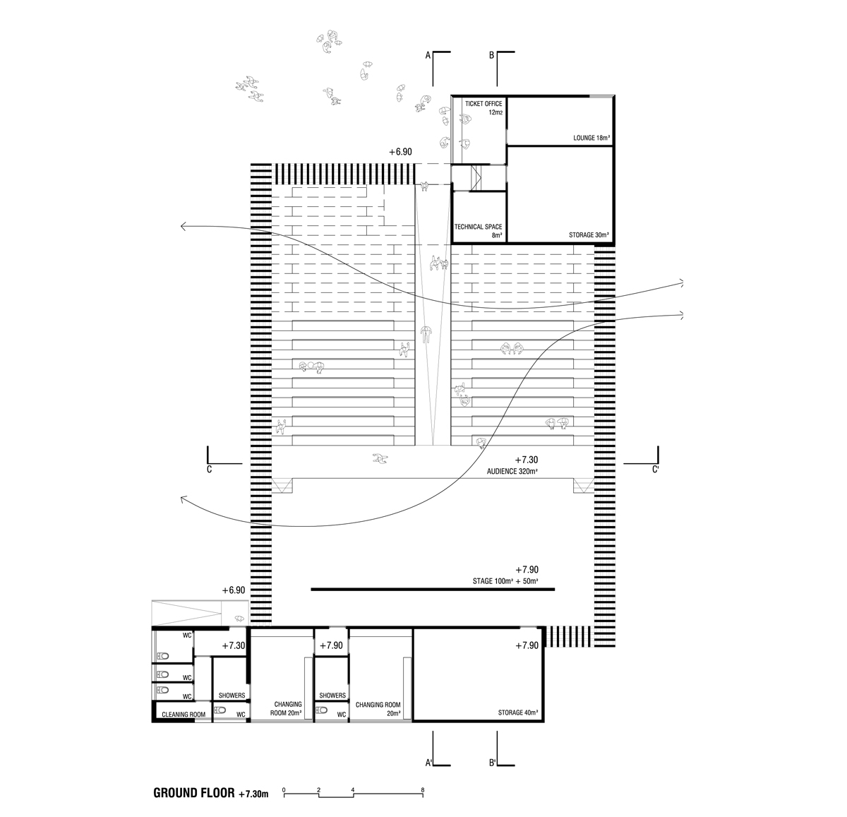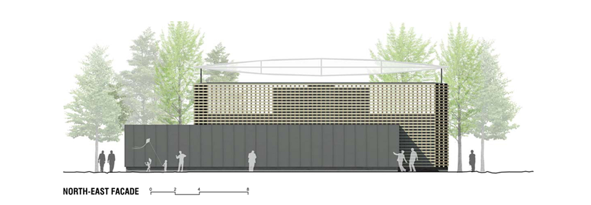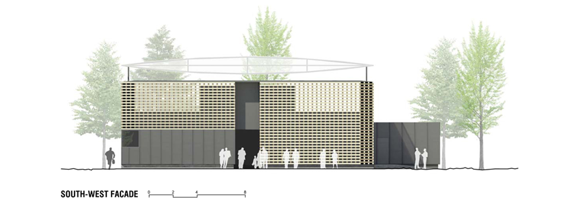 El proyecto plantea un espacio cerrado, a cubierto y con todos los requerimientos para el correcto funcionamiento de un teatro de verano, pero que a la vez permita disfrutar del paisaje y de la naturaleza del lugar donde se encuentra. Para ello, planteamos un espacio a la manera de un claro en el bosque, realizado por una estructura de piezas apiladas de madera que recuerdan un “Taapeli”, una construcción tradicional finlandesa para el secado de la madera. Dentro, el aire circula, las visiones perpendiculares a los muros permiten la visión a través, y todo bajo una visión del cielo posible gracias a una cubierta transparente de ETFE tensado que protege de la lluvia. Un interior que es exterior.