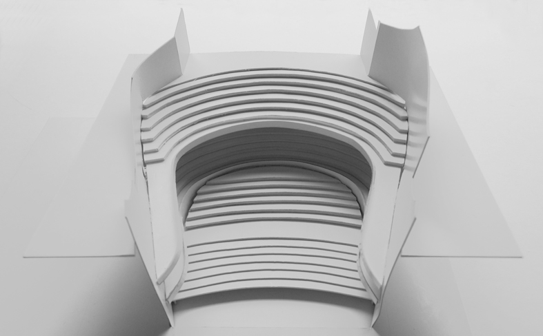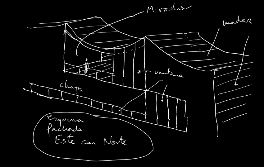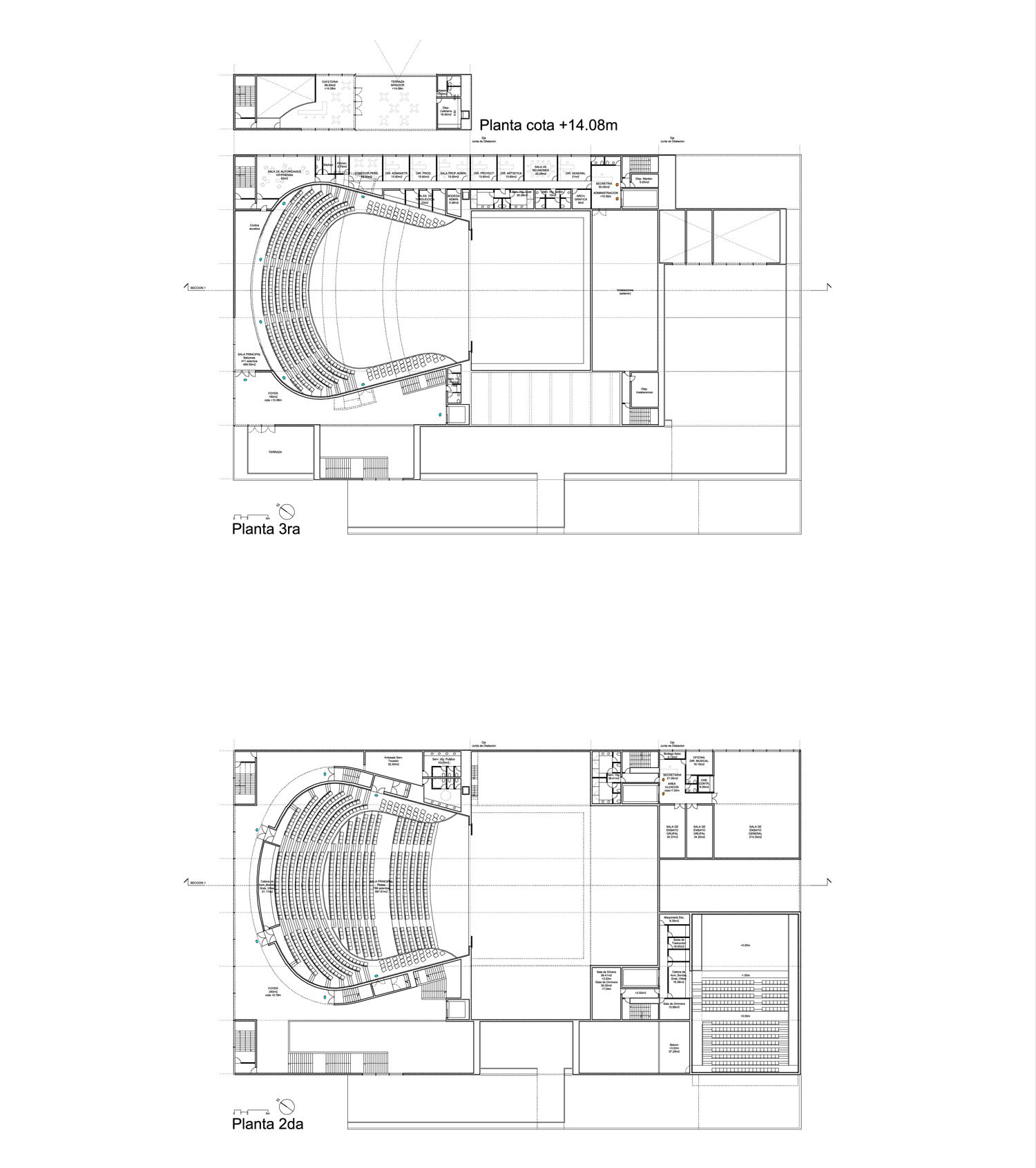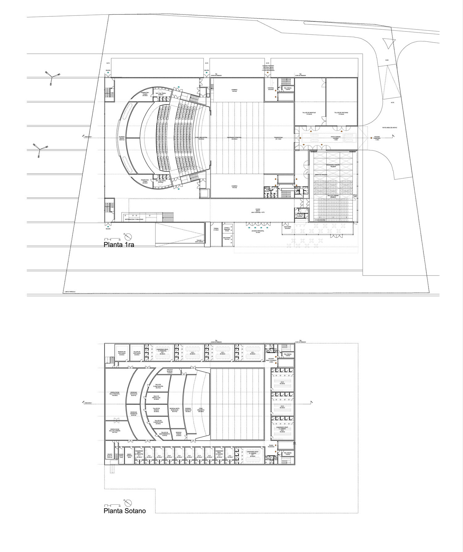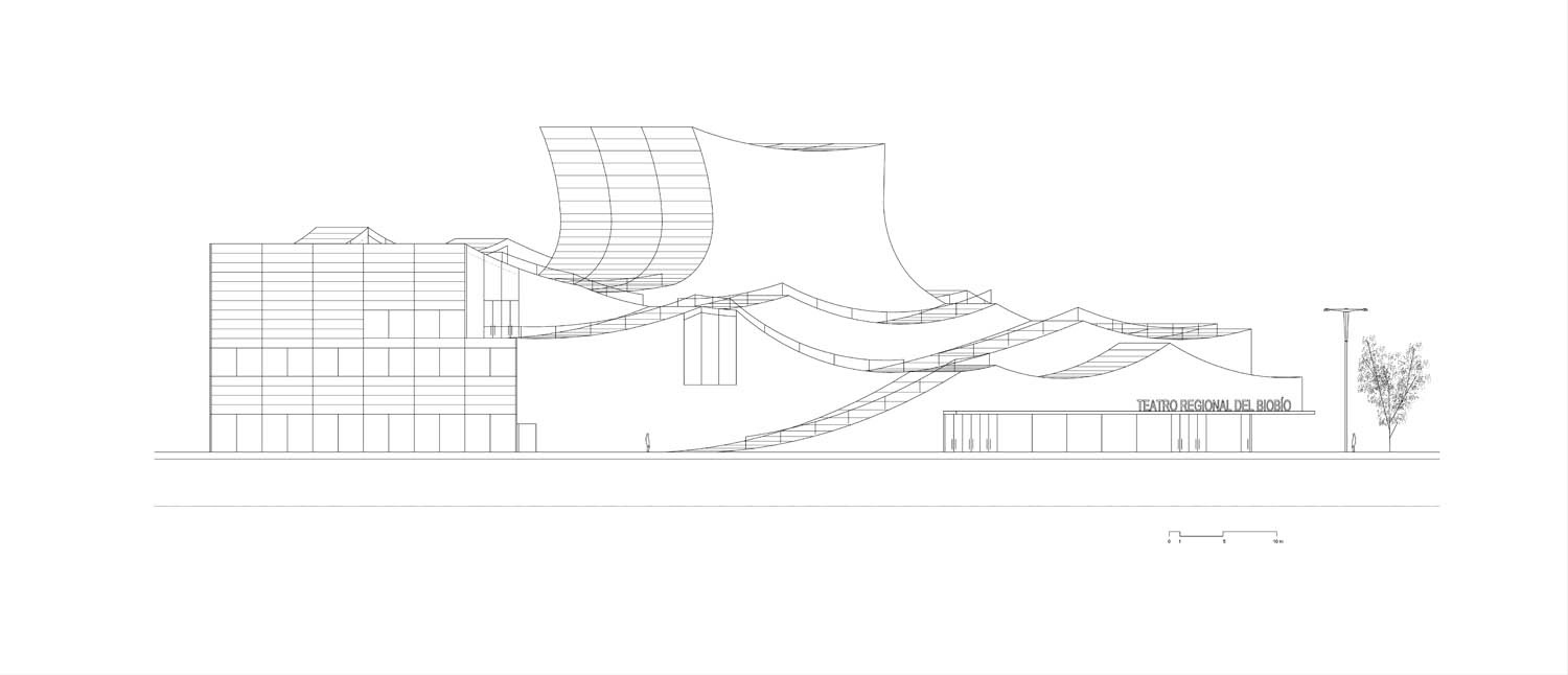 La propuesta concreta desarrollada, dotada de una geometría ondulada y estratificada no sólo permite esta unificación conformando una quinta fachada singular, sino que está abierta a una interpretación polisémica, a la vez referenciable al teatral mundo de las bambalinas y al paisaje acuático al que sirve de atalaya; también, al universo oscuro de la actividad sísmica. Todas estas y otras interpretaciones tienen su peso icónico que se suma conscientemente a la voluntad de abrirse al parque y al diálogo con el memorial 27F para dotar de sentido y variedad al conjunto paisajístico. Esta idea se hace extensible a la forma dada a la playa de estacionamientos demandada en la convocatoria, cuya geometría de hipódromo, casi arqueológica, y su tratamiento semiblando permitirán completar la oferta entendiéndola más como un equipamiento deportivo ocasionalmente ocupado por vehículos que como un estacionamiento ocasionalmente útil para la práctica deportiva. De esta forma la cultura, el deporte, la memoria y el paisaje se ordenan en una sucesión de organismos espaciales característicos, ensartados linealmente por el paseo junto a los márgenes del Bío-Bío, como un conjunto programático lineal que da sentido y refuerza esta localización única.