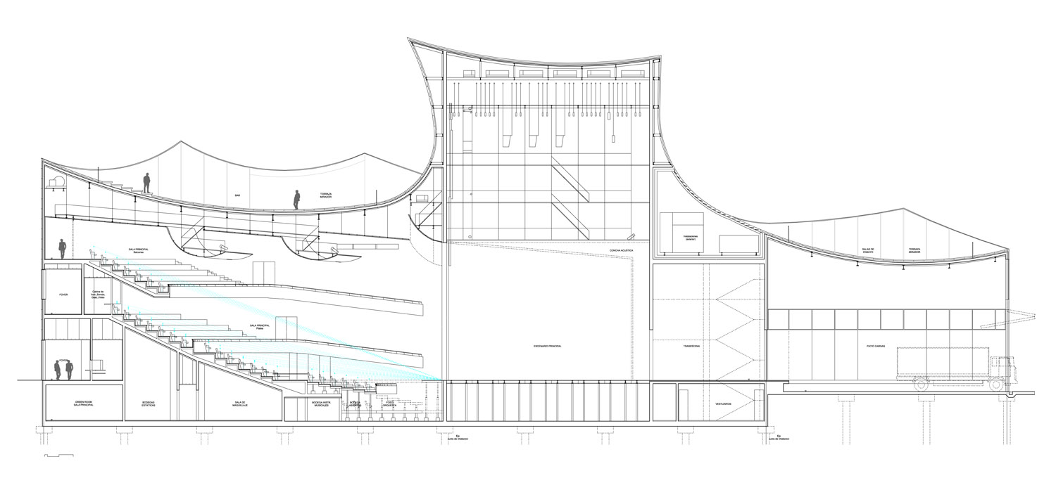 La convocatoria del concurso contiene dos grandes temas de arquitectura. Por una parte resolver de forma prototípica y económica (en términos espaciales y funcionales) un programa que pretende implantarse en el país, dedicado a las artes escénicas. Del mismo debe resaltarse la dificultad técnica que implica la Sala Principal, que debe atender a requerimientos acústicos y espaciales diferenciados (teatro, música sinfónica, ópera). Se trata de un tema que demanda la máxima racionalidad y a la vez sensibilidad para atender a cada una de las actividades de forma apropiada. Por otra parte, el edificio debe dar una respuesta espacial a un lugar ambivalente: a la vez que dotado de una belleza singular, de especial intensidad paisajística y simbólica, el lugar queda aislado de la vida urbana por su localización cruzada por infraestructuras (que a su vez lo hacen accesible desde la región). Curiosamente, lo más valioso de su ubicación, las vistas escenográficas, se corresponde escasamente con el carácter introvertido implícito a un centro de artes escénicas por lo que de poner ambos en relación se transforma en un aspecto proyectual decisivo.
