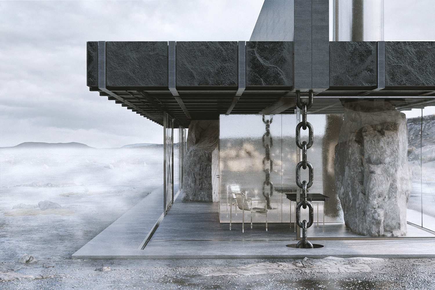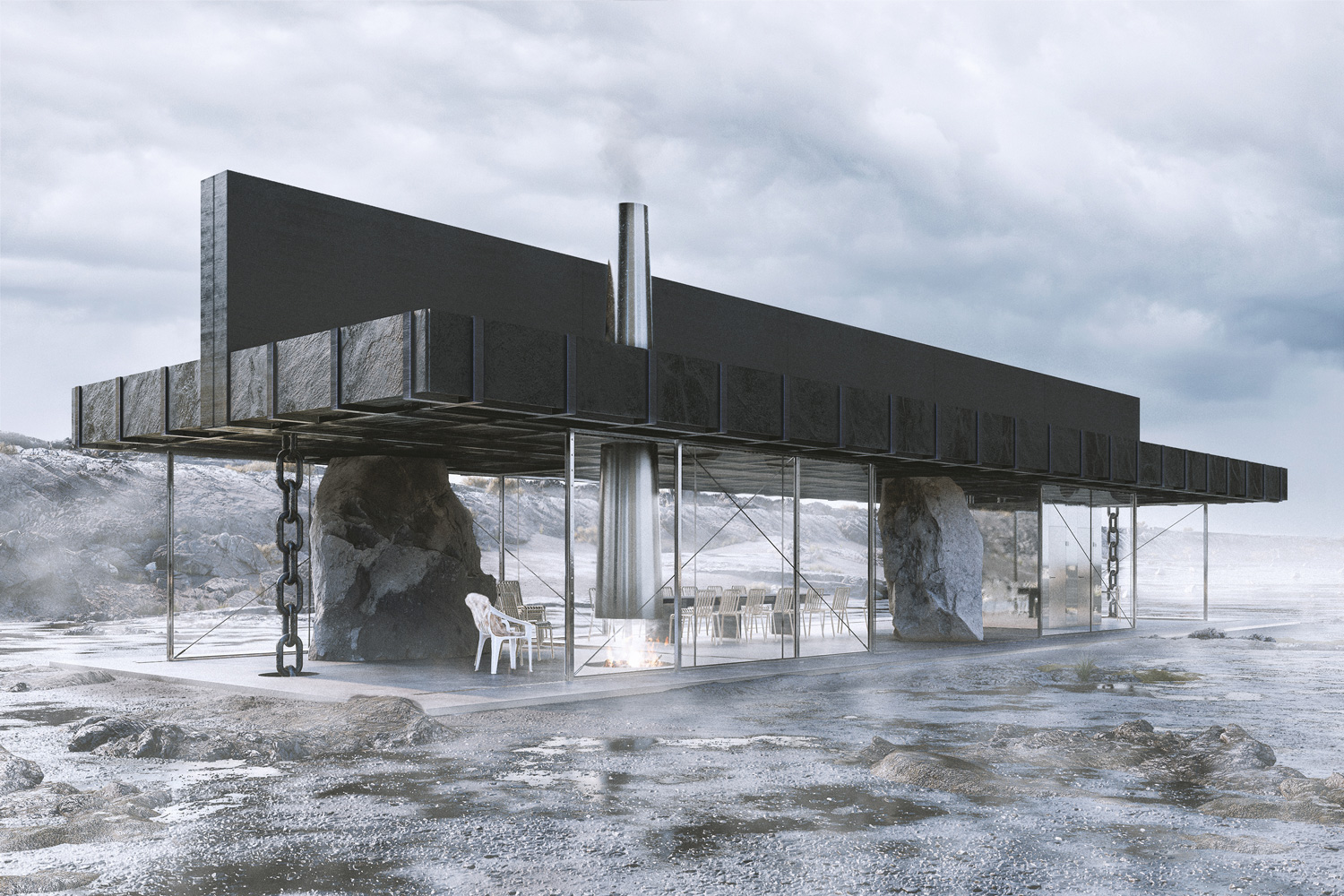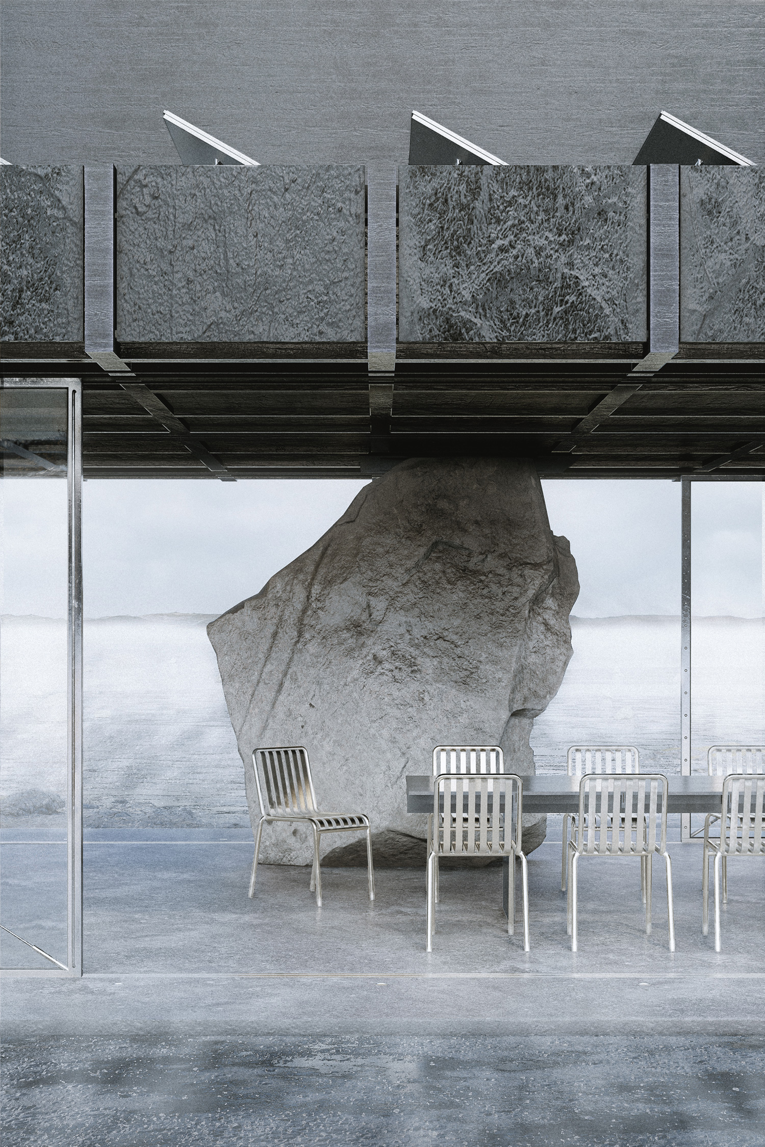 The massive roof in its unconventional form rests on three stones that were quarried on site. Two seemingly oversized chains hold it to the ground. The forces of nature are brought into balance by the power of architecture. In this way, a freely accessible space is spanned that accommodates all the necessary functions. This fusion of the natural and the man-made leads to an artificially altered perception of nature. The stones suddenly become the central component of the design, thus an object and a reflection of themselves.