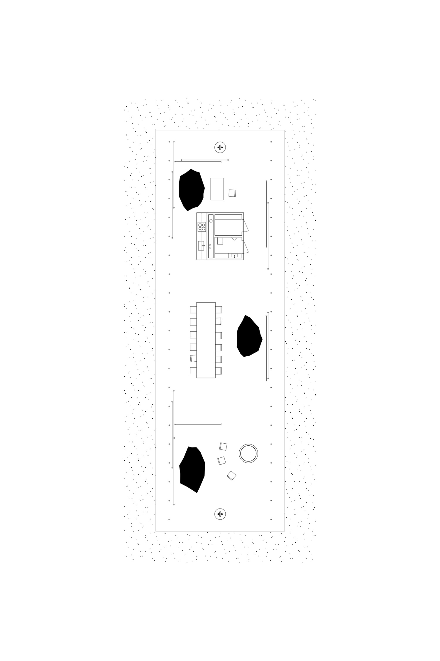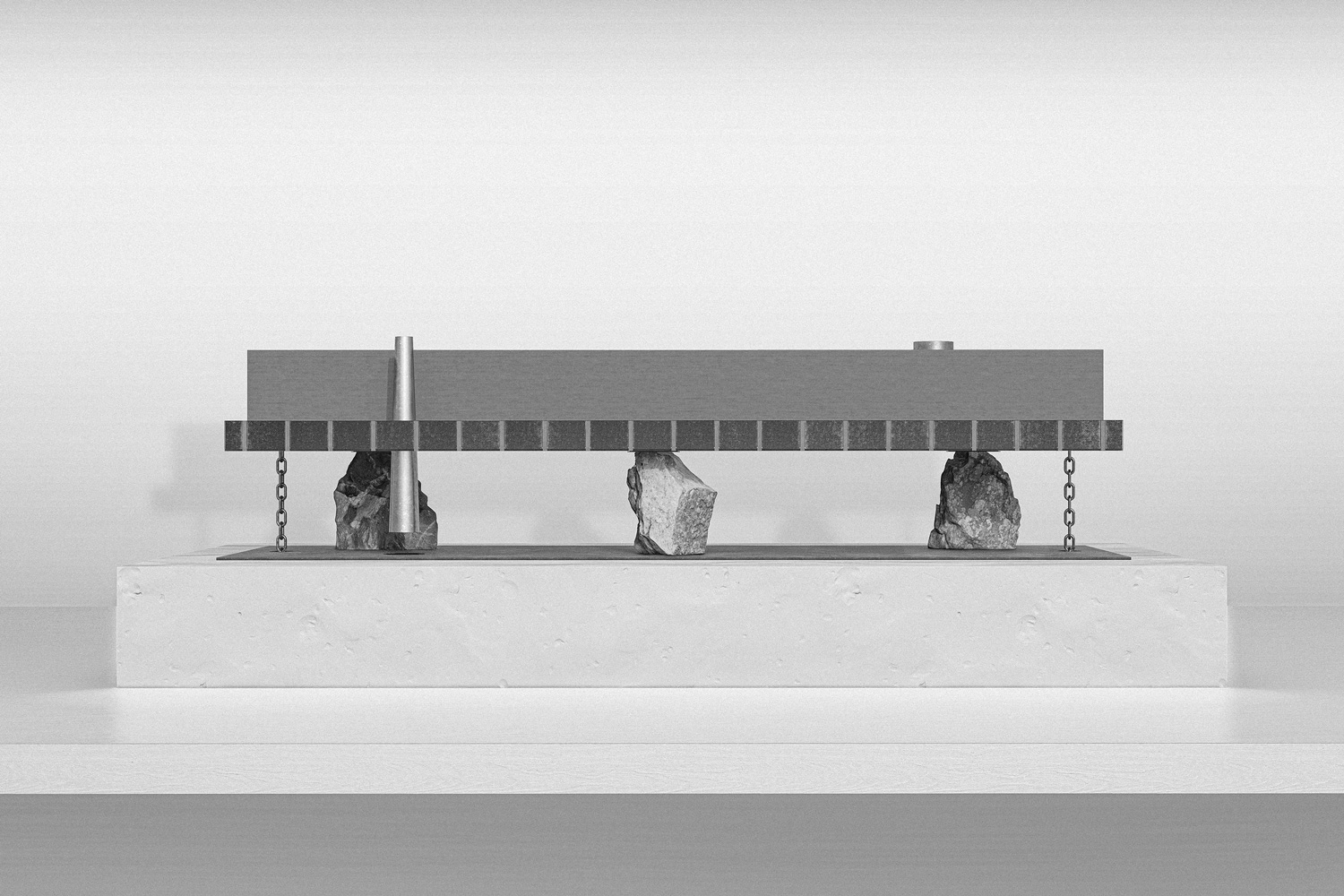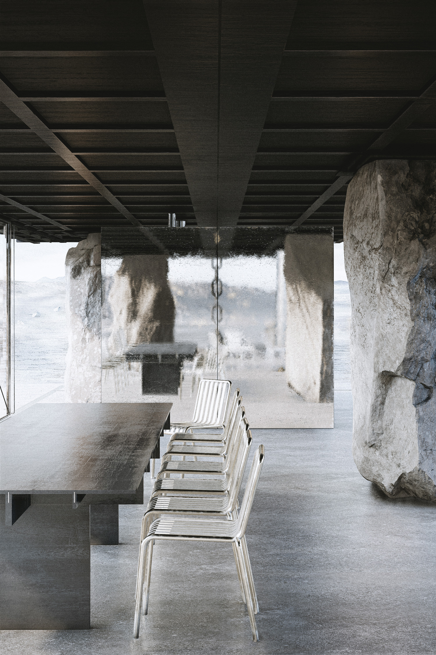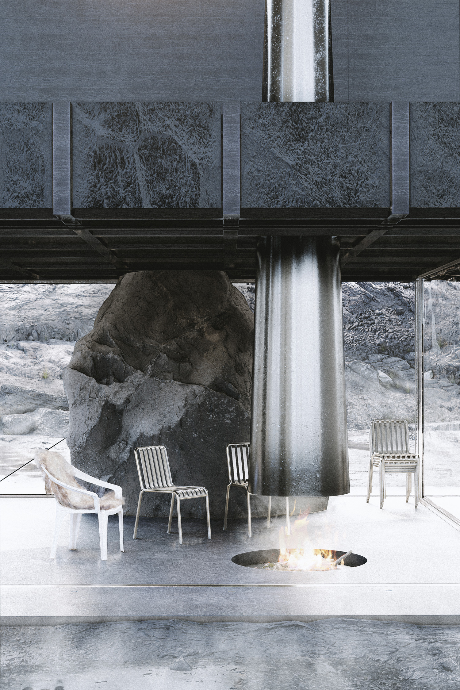 The massive roof in its unconventional form rests on three stones that were quarried on site. Two seemingly oversized chains hold it to the ground. The forces of nature are brought into balance by the power of architecture. In this way, a freely accessible space is spanned that accommodates all the necessary functions. This fusion of the natural and the man-made leads to an artificially altered perception of nature. The stones suddenly become the central component of the design, thus an object and a reflection of themselves.