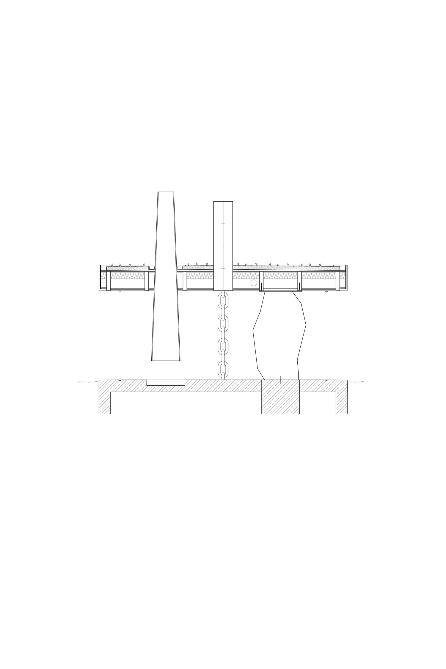 The chains are not only spatial envelopes, but also have their constructive necessity. The primary horizontal loads, such as wind loads, are balanced via the chains, which are braced on all sides, as a kind of inverted support. As elements reacting to tension, they thus keep the tower in loose balance.