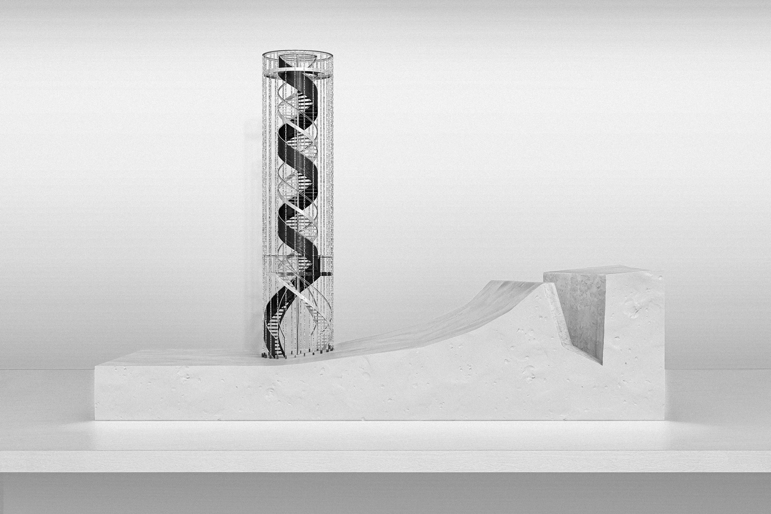 The tower strives upwards in its entire form and appears almost weightless. In its unique way, it creates its own aesthetics, which still fits into the expanse as a point of orientation. Similar to the human perception of the landscape, the presence of the tower changes depending on the distance of the viewer. From a distance, the monolithic staircase catches the eye; up close, various details and references become perceptible and the tower dissolves into a filigree volume. Similar to the observation of nature, sculptural and filigree at the same time.