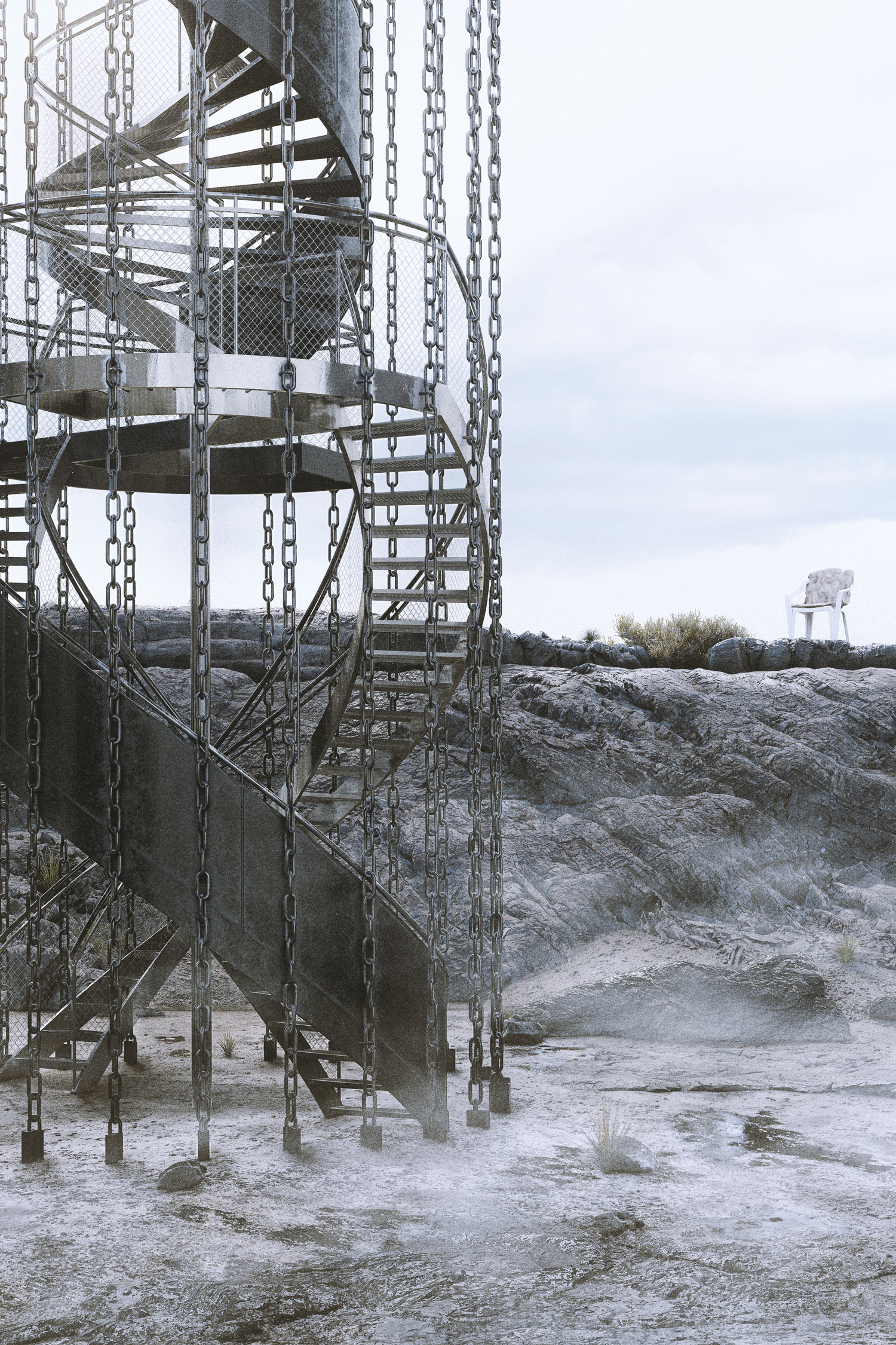 The external staircase in the lower section creates a structural base that supports the free-standing staircase above. The ascending stairs serve here as diagonal bracing.