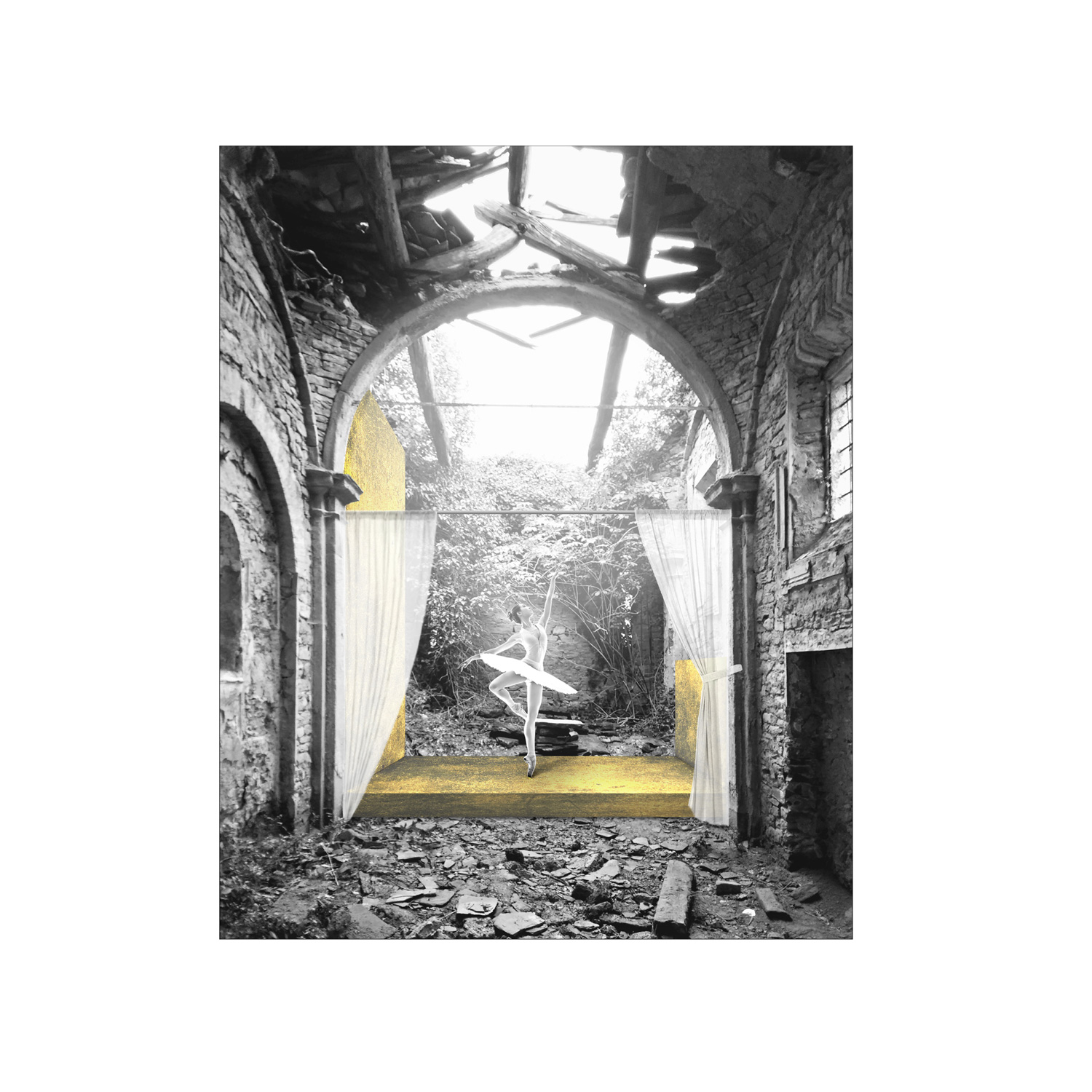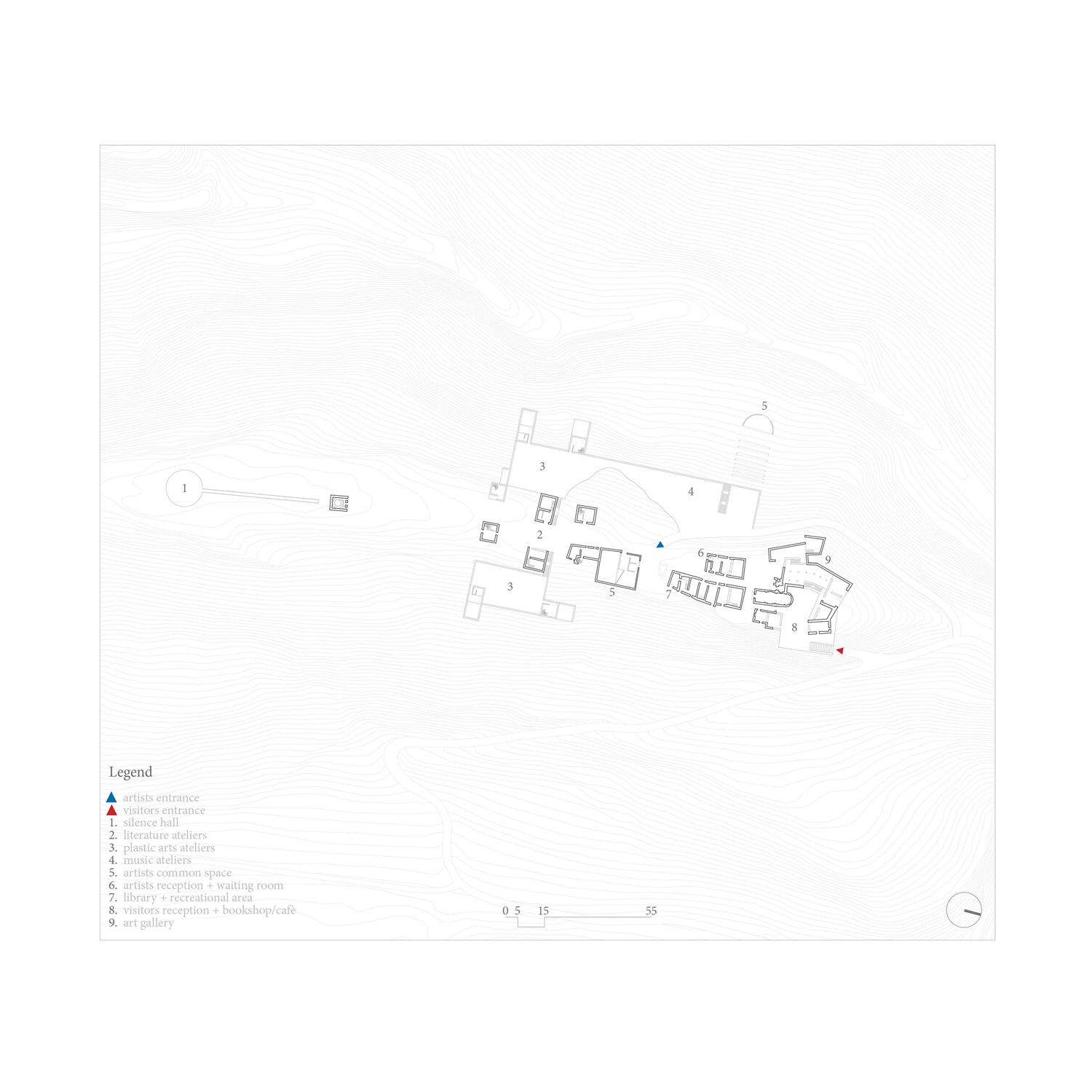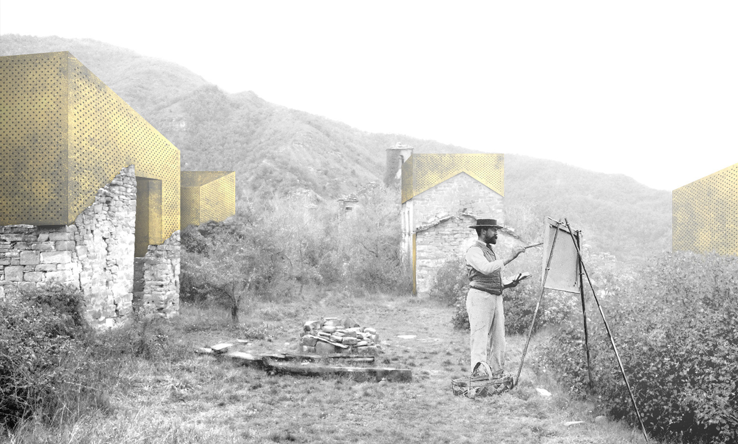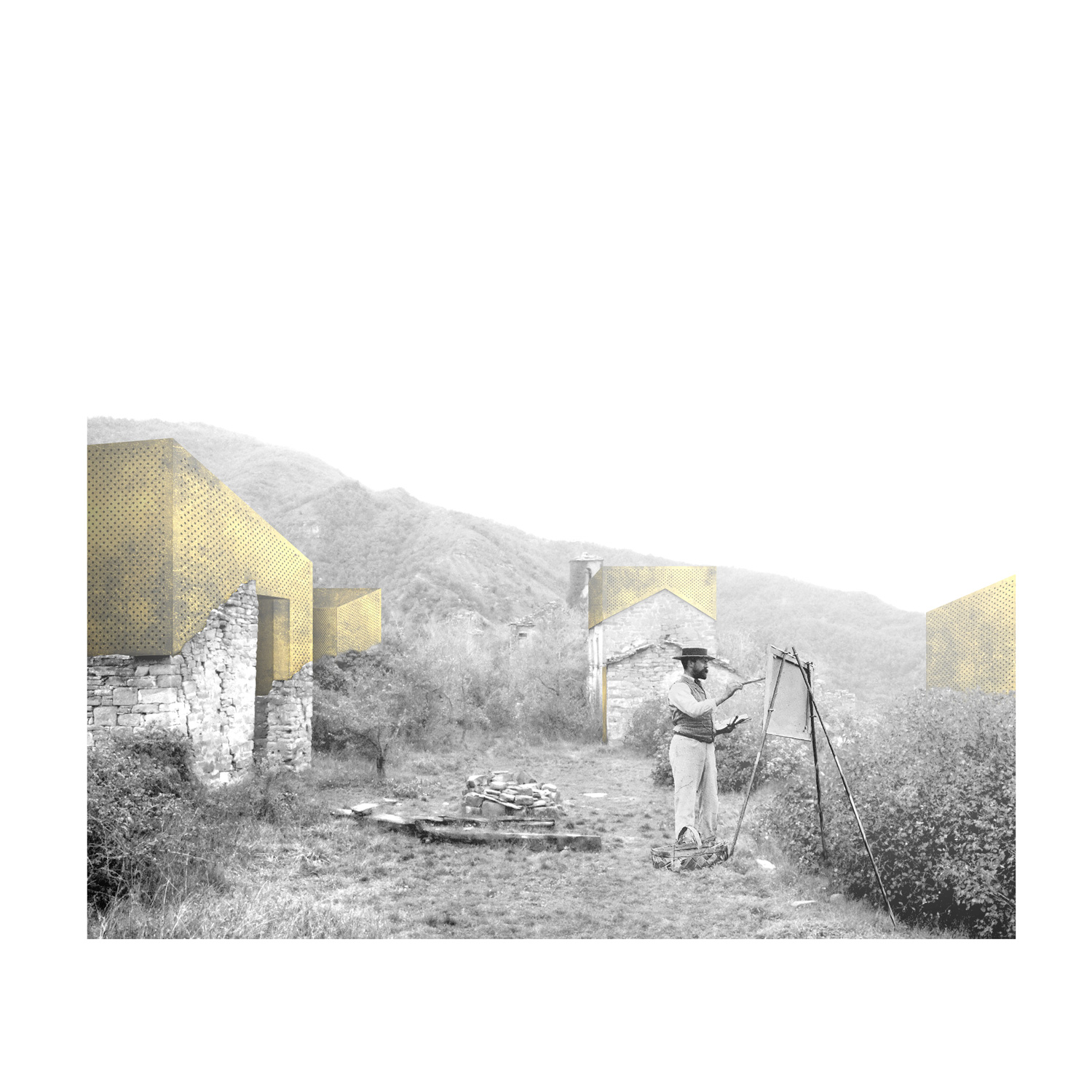 The geometries and the axiality of the elements that compose the existing village become the guideline for adding the volumes needed to accomplish all the functions of the project. The new volumes, in fact, are dimensioned on the existing buildings and the openings in the walls allow to frame the landscape. The village, through the new project, is divided into public parts and in more private parts and useful in searching for inspiration for the artists: the two extremes of the village are characterized by one completely public and the other one completely isolated. The design additions include ateliers for the artists, an exhibition gallery created among the ruins through the addition of a big but essential common roof, the squares for cultural and social exchange and, finally, a large circular void excavated into the ground that constitutes the silence hall in which anyone can isolate himself concentrating only on himself and on the surrounding nature.