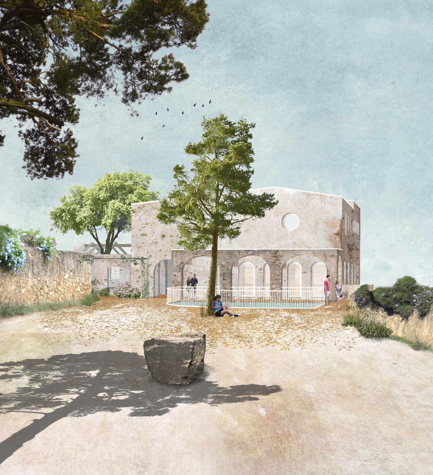 Through time, the local neighbourhood has become motionless and inactive after the arrival of large industries and mass production. In order to re-create its identity, the use of the areas around the old house and the reactivation of the fields would create a circular movement of production-consumption- exchange. In a social perspective the relocation of modern activities (such as a theatre, a library and a plaza) inside the old house would create a gathering point in the village. As a result, the watercourse is full of life and movement again, as it used to be in the old days. Using small interventions on a physical level along the water path and adding new purposes to the old house of Can Mora will revive the space once more.