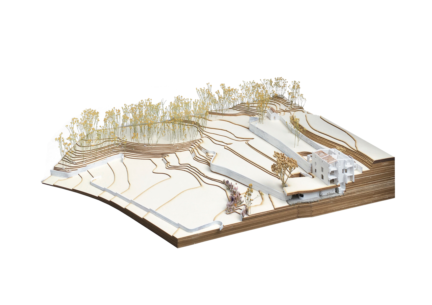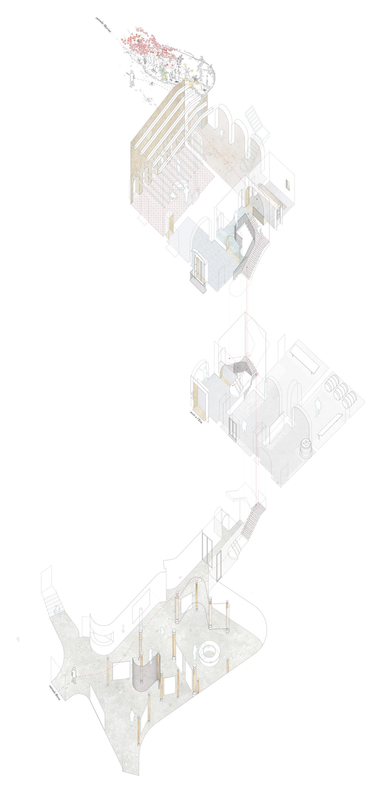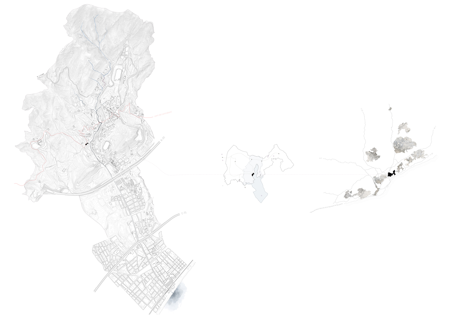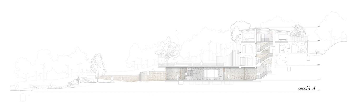 In the center of Canyet there is Can Mora, an old traditional house. It’s located on the crossroad between the water course path and one of the main paths of the park, also known as“the smuggler’s path”. Long ago, this path was used to smuggle tobacco and other goods to the city through the mountain. This project aims to give the city a space to comprehend the park’s natural riches. Therefore, this place is thought as the doorway to all the path-roads within the park.