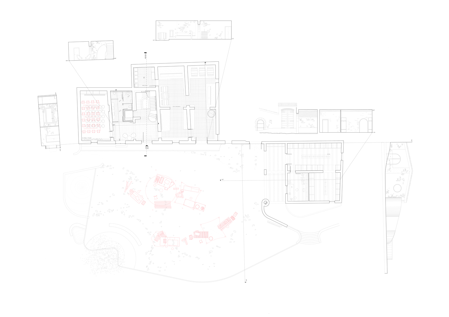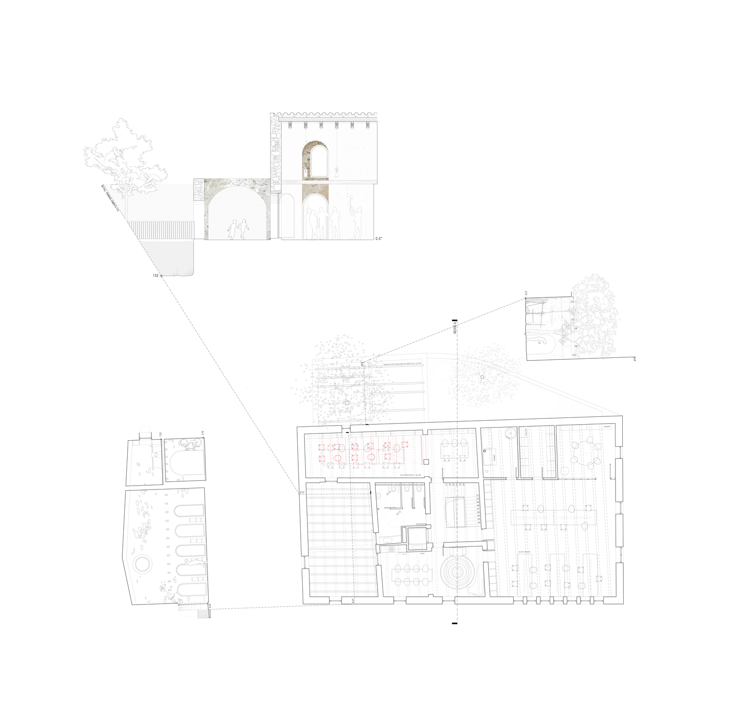 The building itself is recognised as part of the path, from the watercourse to the park. These consecutive spaces have a two-way road function, allowing different purposes, and also, at different scales. These different purposes would be organised according to two program levels: a park level and a village level.