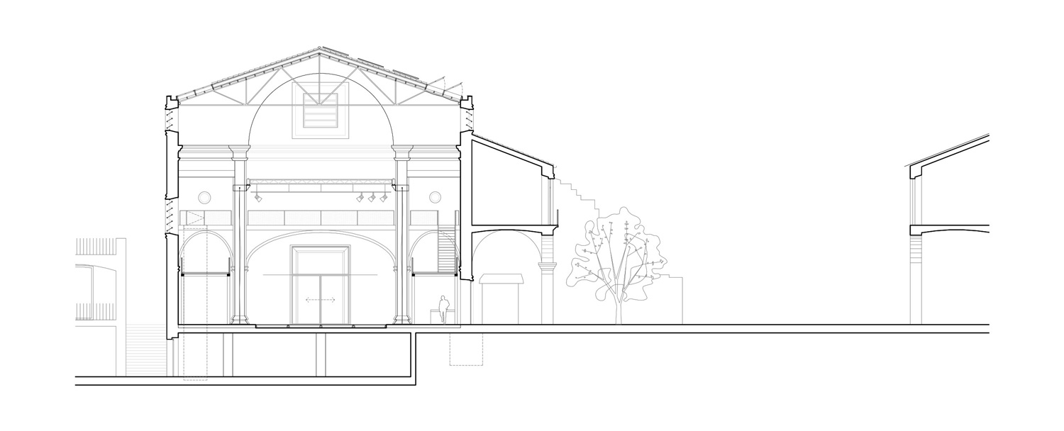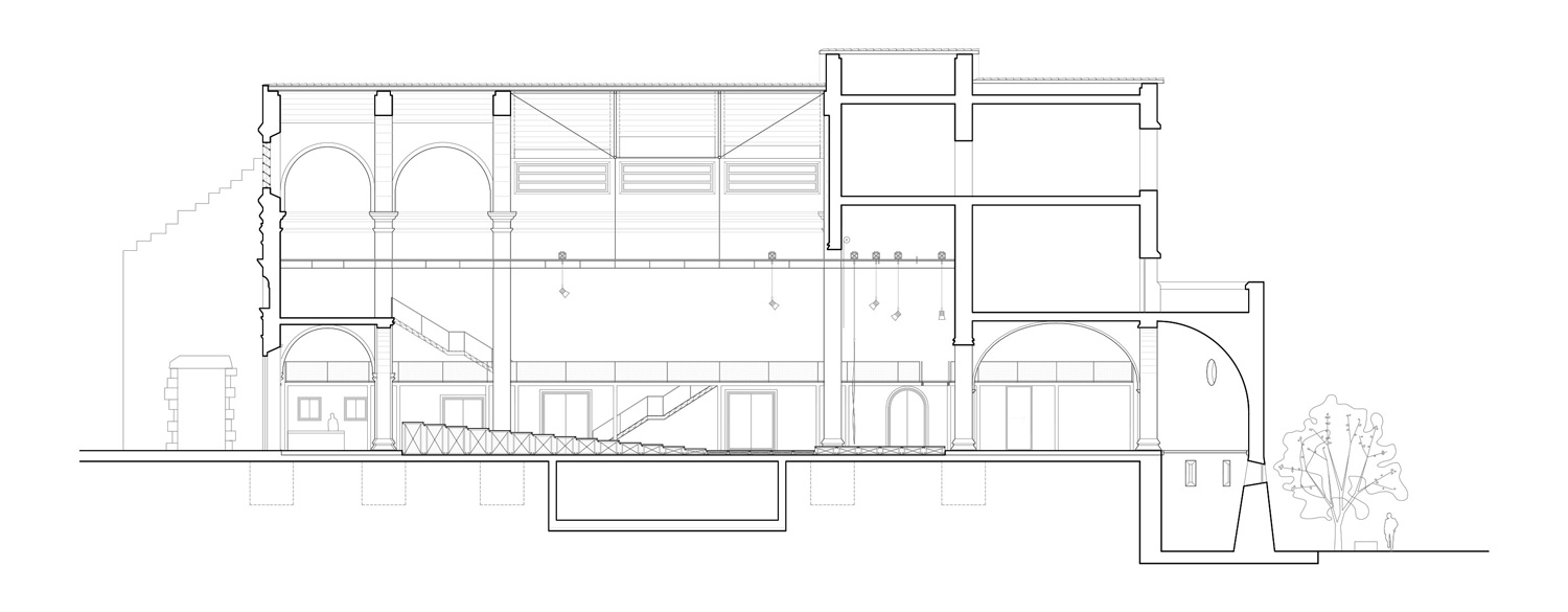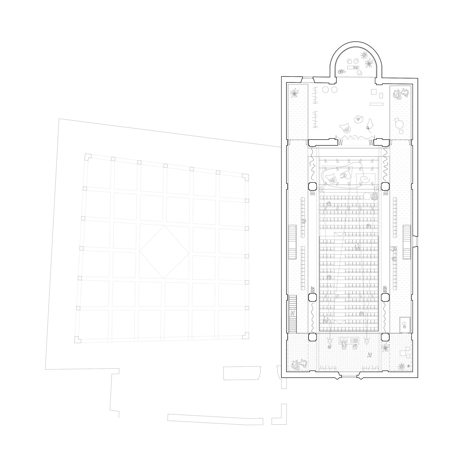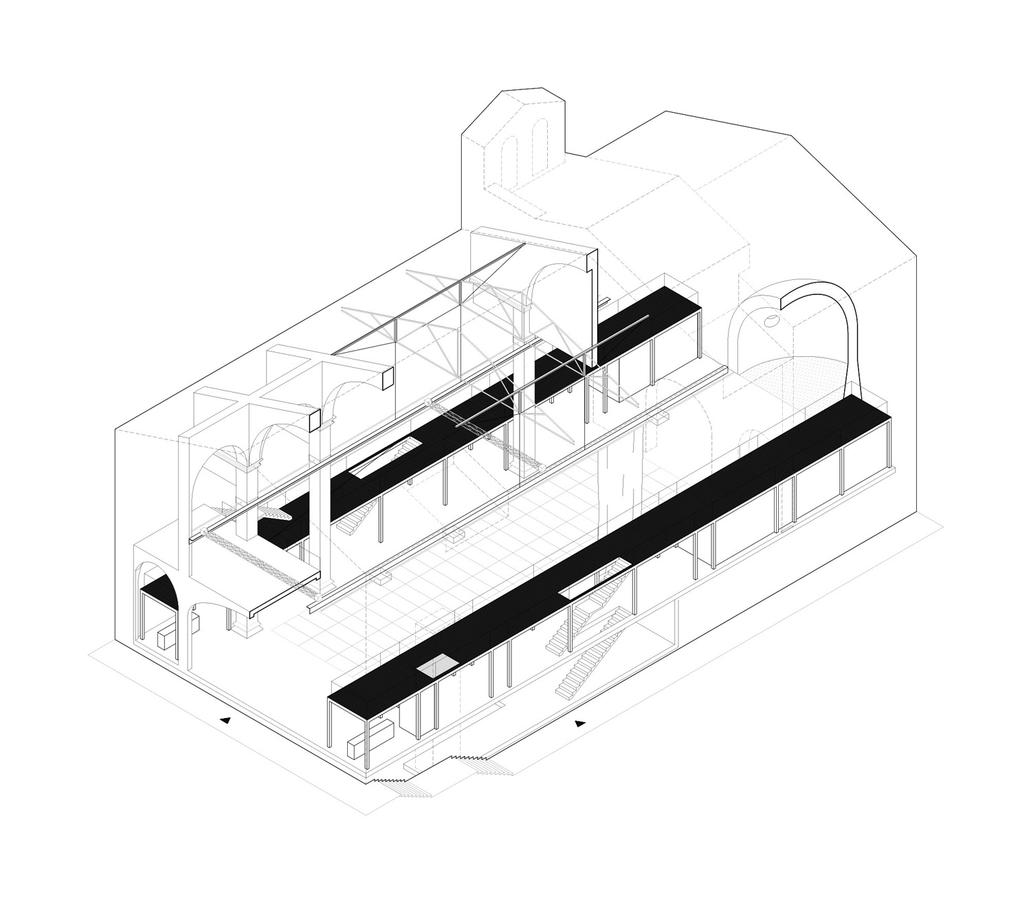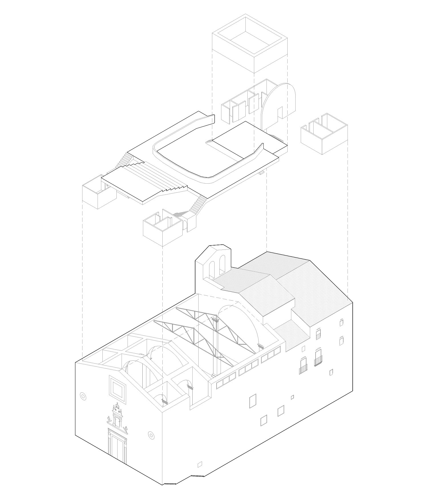 Se trata de una propuesta capaz de acoger distintas actividades y transformarse en el tiempo, tanto para absorber nuevas demandas como para re-definir los usos inicialmente implementados. Funciona más como espacio de oportunidades antes que una arquitectura cerrada. Se restituyen las naves laterales desdibujadas con la última reforma mediante dos altillos ligeros que siguen el ritmo de las crujías y se colocan siempre en segundo plano respecto a la preexistencia. Complementarios a la nave principal, incorporan todo el grano pequeño de programa, liberando el espacio central y potenciando la lectura longitudinal del acceso hasta el ábside.