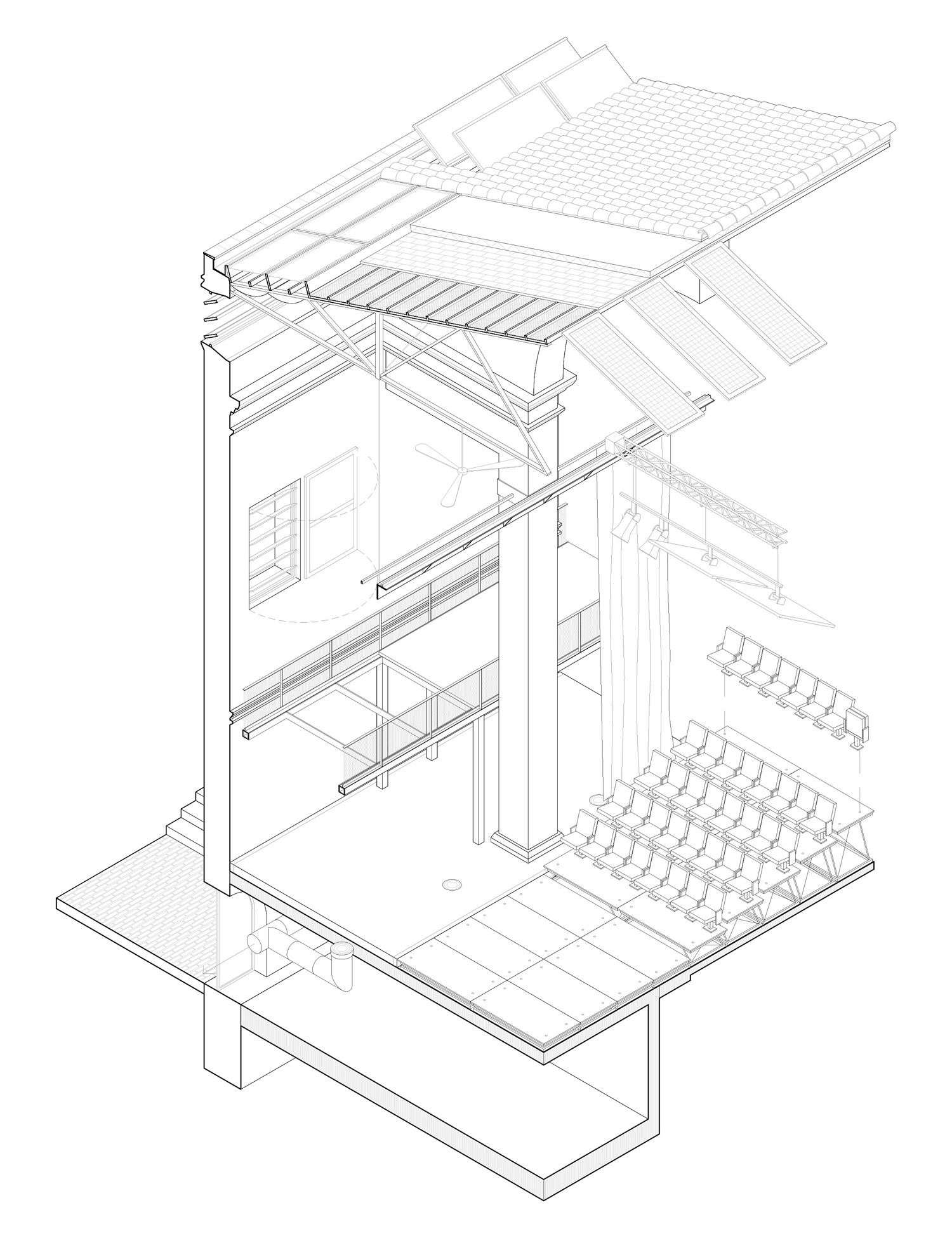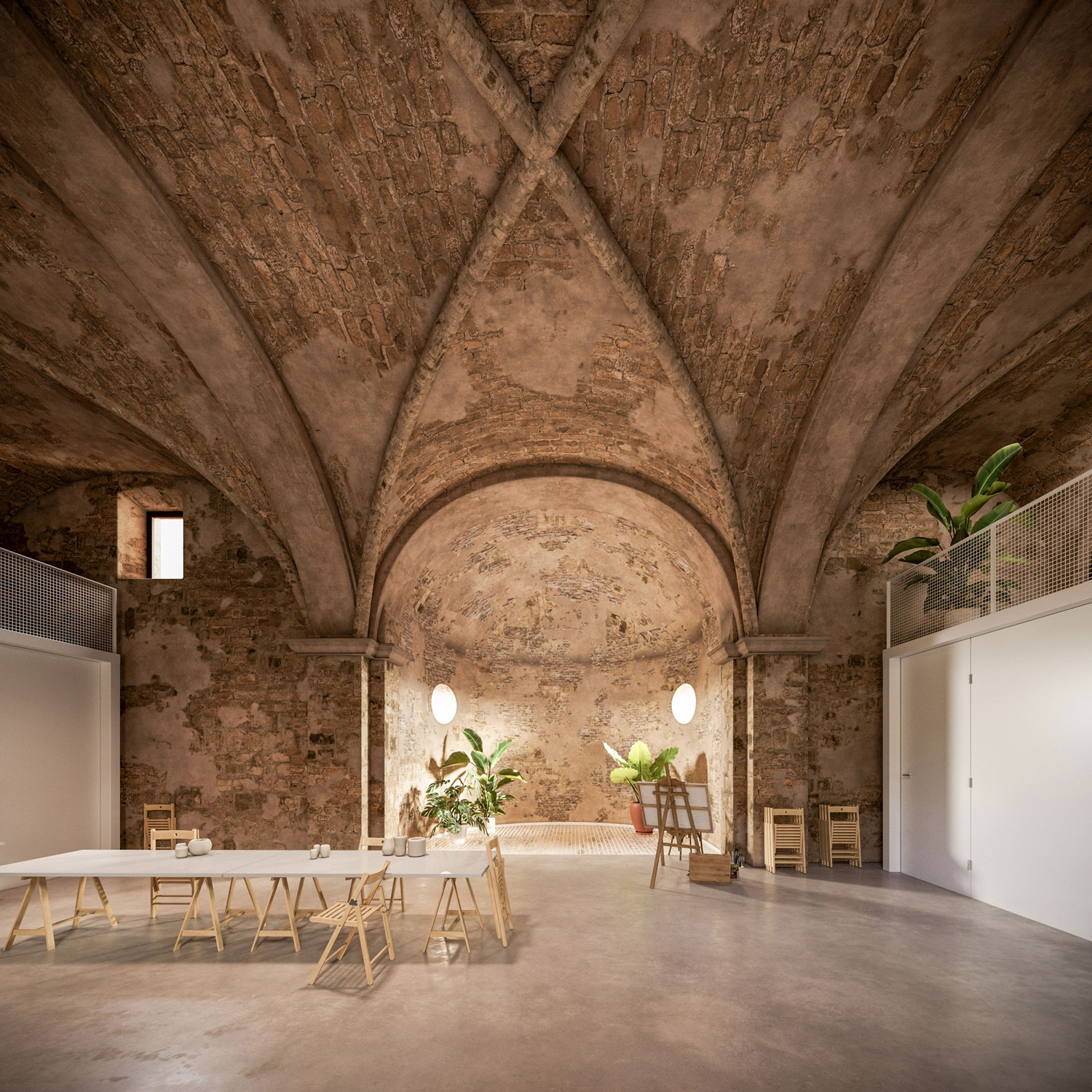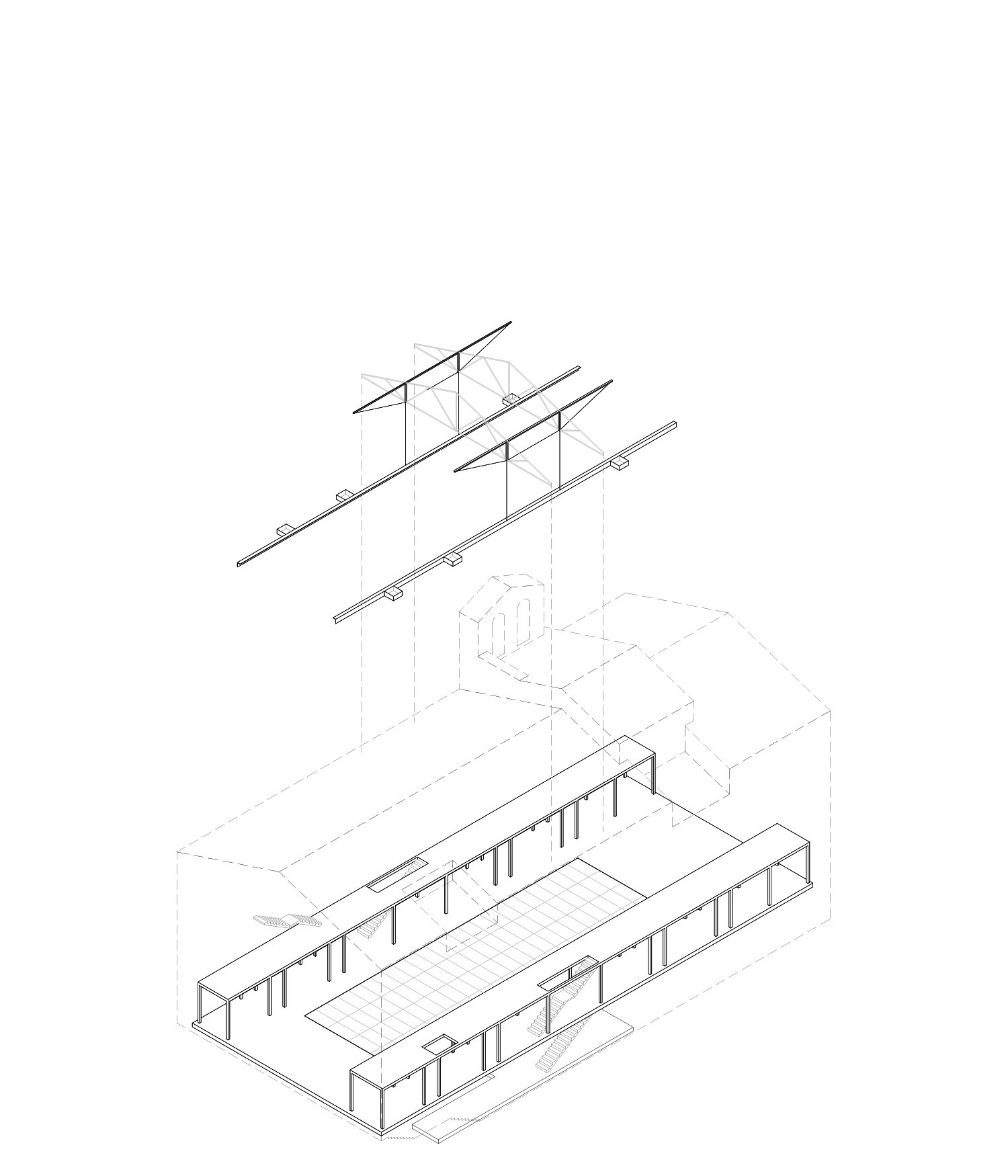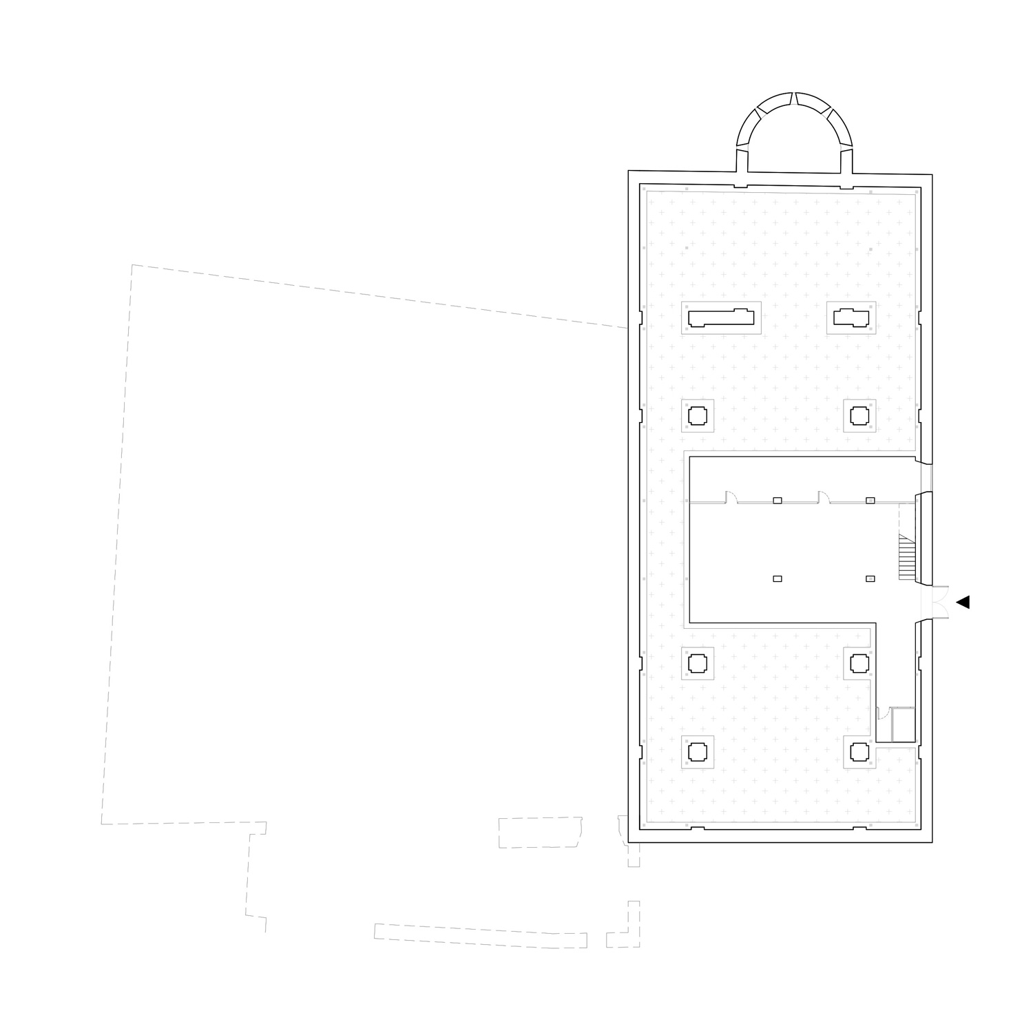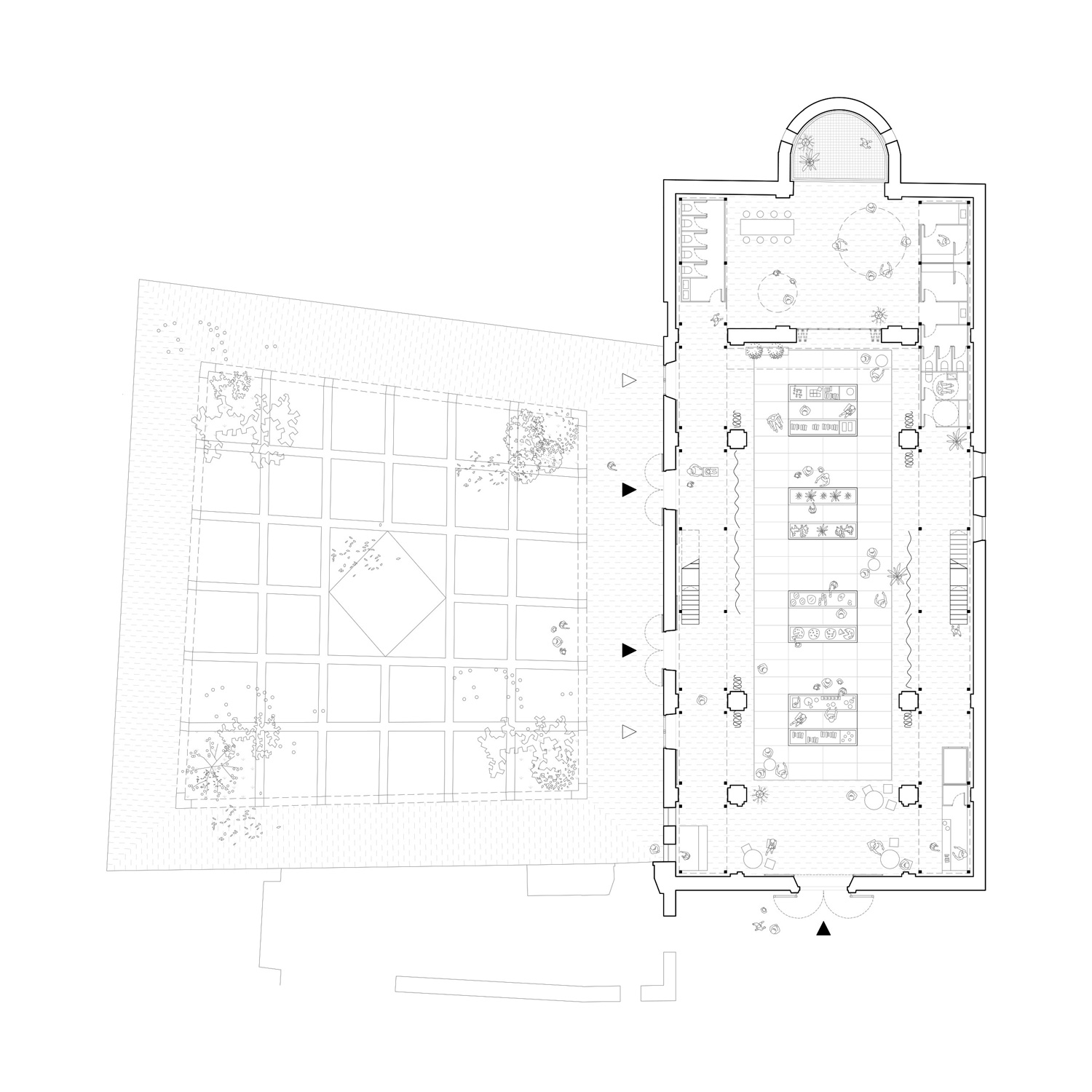 Se trata de una propuesta capaz de acoger distintas actividades y transformarse en el tiempo, tanto para absorber nuevas demandas como para re-definir los usos inicialmente implementados. Funciona más como espacio de oportunidades antes que una arquitectura cerrada. Se restituyen las naves laterales desdibujadas con la última reforma mediante dos altillos ligeros que siguen el ritmo de las crujías y se colocan siempre en segundo plano respecto a la preexistencia. Complementarios a la nave principal, incorporan todo el grano pequeño de programa, liberando el espacio central y potenciando la lectura longitudinal del acceso hasta el ábside.