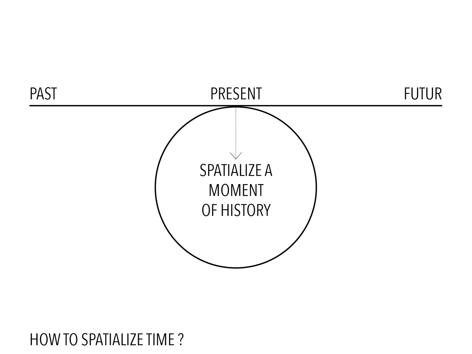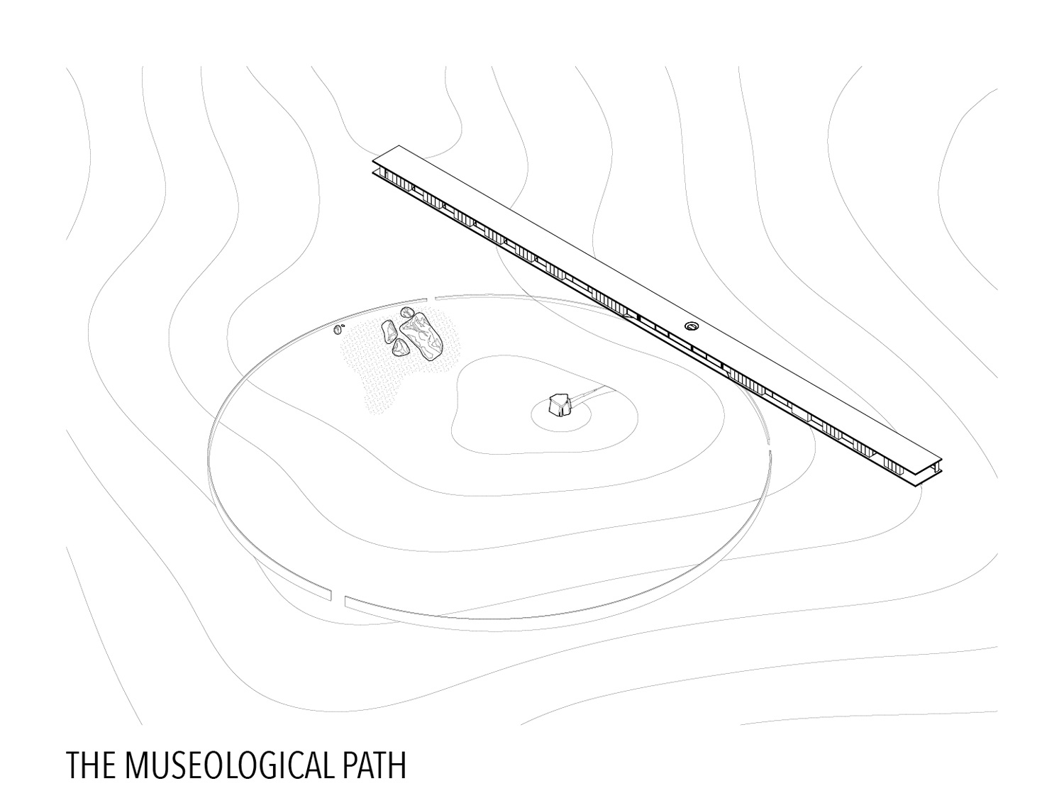 The museography is define by a line; the current representation of time. It emerges from the site to enter in tangency with the circle, to spatialize this historic moment. The line, symbol of temporality, guides the visitor toward the enclosed circle and the horizon.