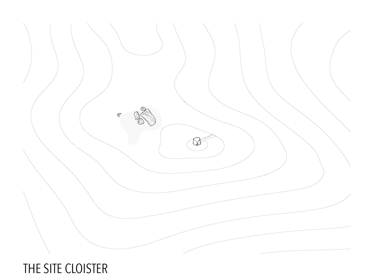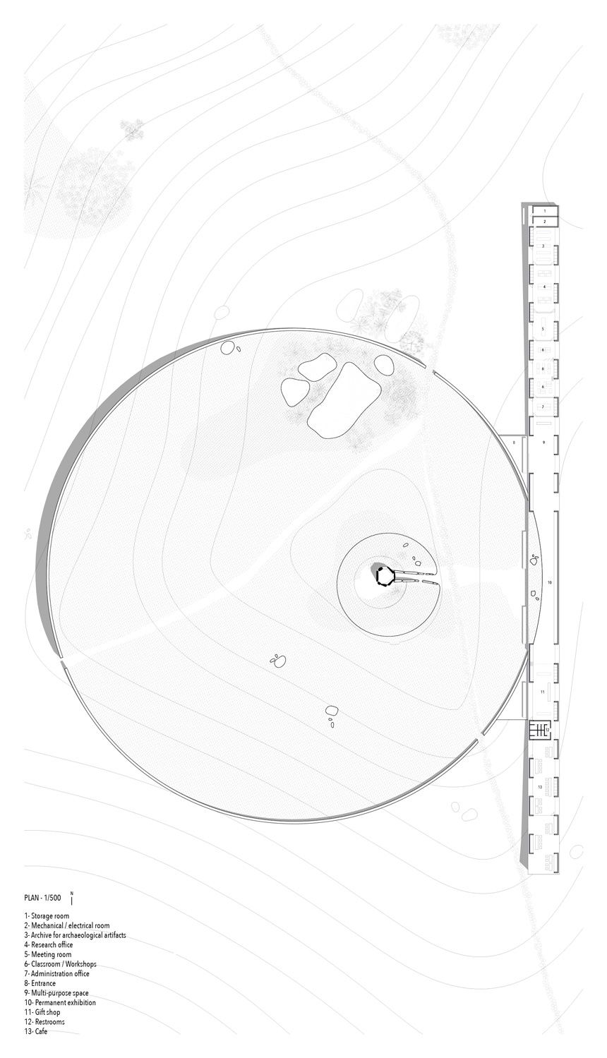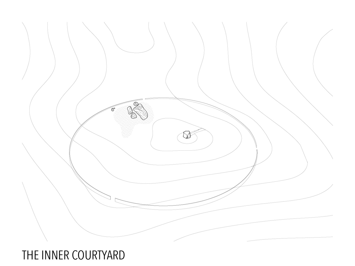 Universal representation of the cosmos, symbol of identity, the circle constitutes the most spatial element of our civilization. Its introspection’s quality allows us to erect a delicate wall gravitating around the stone monument, playing with the topography.