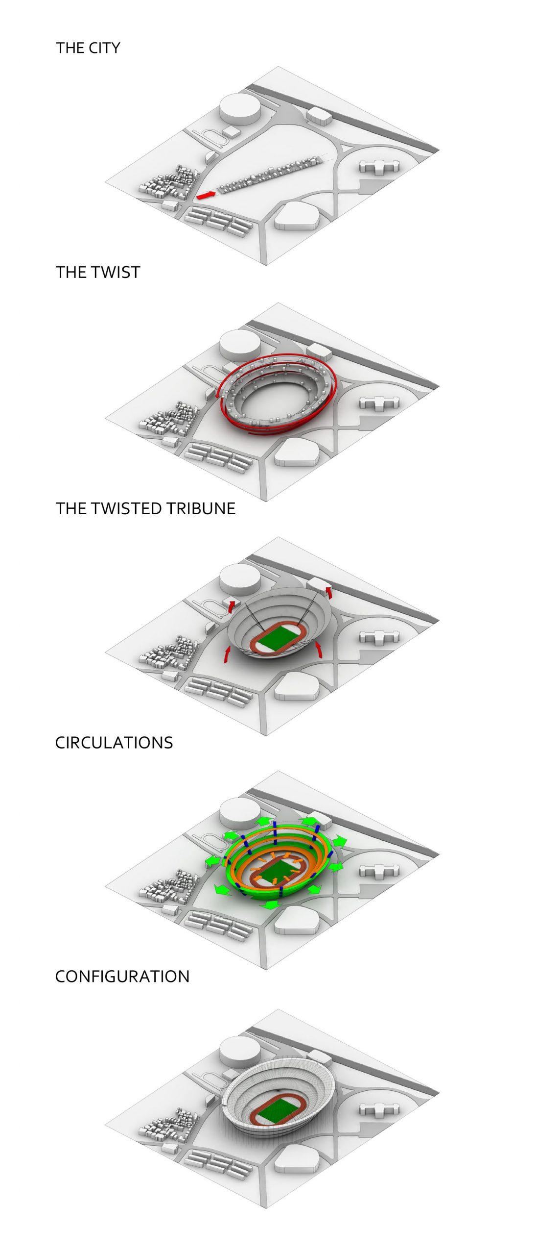 It doesn’t consumes energy, but it creates it. The large roof surface becomea solar field, generator of electricity. Rainwater is stored and reused. Energy sources are completing the needs of the stadium and of the neighborhood. The stadium adapts to new practices. The principles of saving energy and fonctional densification are the most important caracteristics of our project. The superstructure is divided into two parts: the eliptical spiral which turns and forms the stadium and an periferic exterior structure which allows the gradual insertion of facilities like : offices, apartments, amphitheatres, commercial spaces. This second structure is the support of the extension and for the integration of the stadium into the city. This structure represents also the financial support of the stadium. The investment is amortized by all the equipments contained by this structure. With our approach we can build one or more hotels, of 3,4 and 5 stars, from 250 to 1000 rooms, apartments, thousand square meters of offices and other equipments which amortize like that very fast the investment.