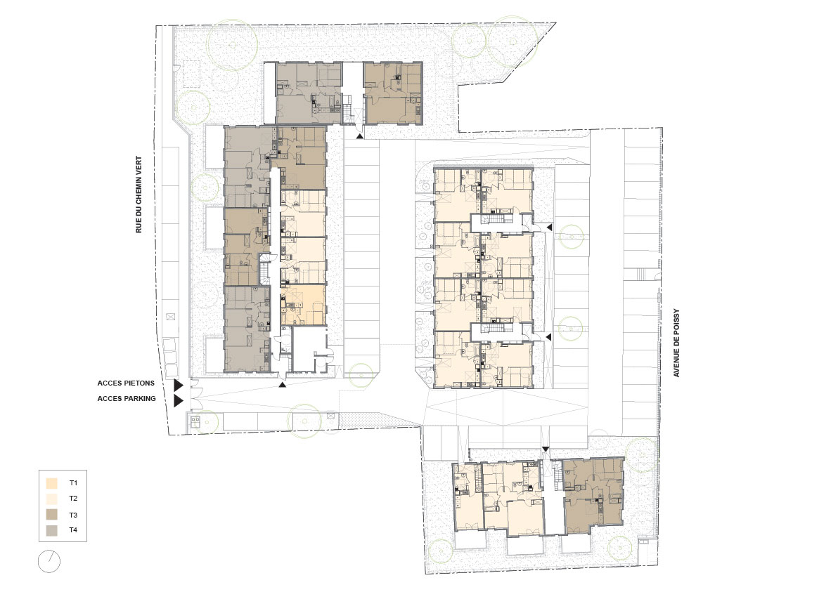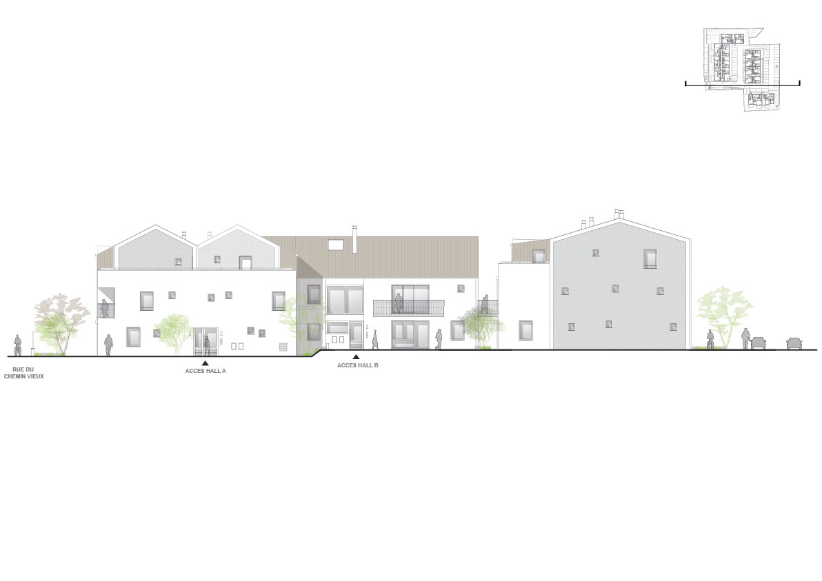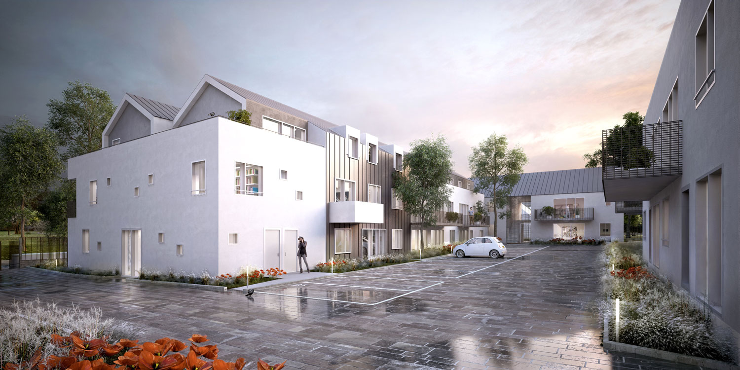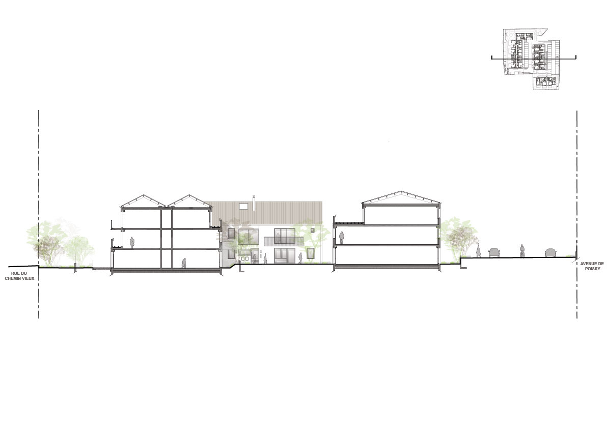 The site is situated in a suburban area at the gates of the city of Triel-sur-Seine. The immediate environment is semi-rural, and principally composed of undeveloped lands, single-family houses and traditional buildings, bordered by significant road infrastructures. Aside from creating new dwellings, the aim of this project is to invigorate the neighborhood and to reinforce its connection with the rest of the city. A way to create dynamic living areas has been to mix different types of dwellings, either collective, semi-collective or single-family housing. The design of local farmhouses, which are long-lasting cocoon-shape buildings, is the starting point of our reflection. We have reinterpreted this traditional architectural form in order to come up with a contemporary project. The project is based on the plurity of volumes and used materials. The U-shaped buildings of the project reproduce the cocoon shape of the farmhouses. Crossing entrance halls form bright openings through the buildings, giving the project its contemporary touch.
