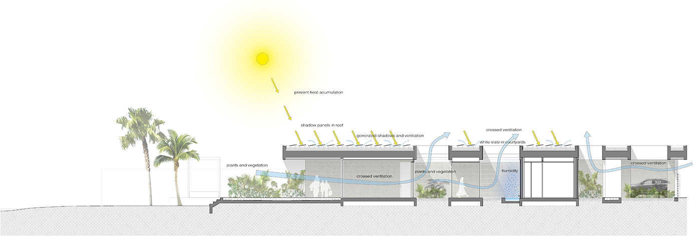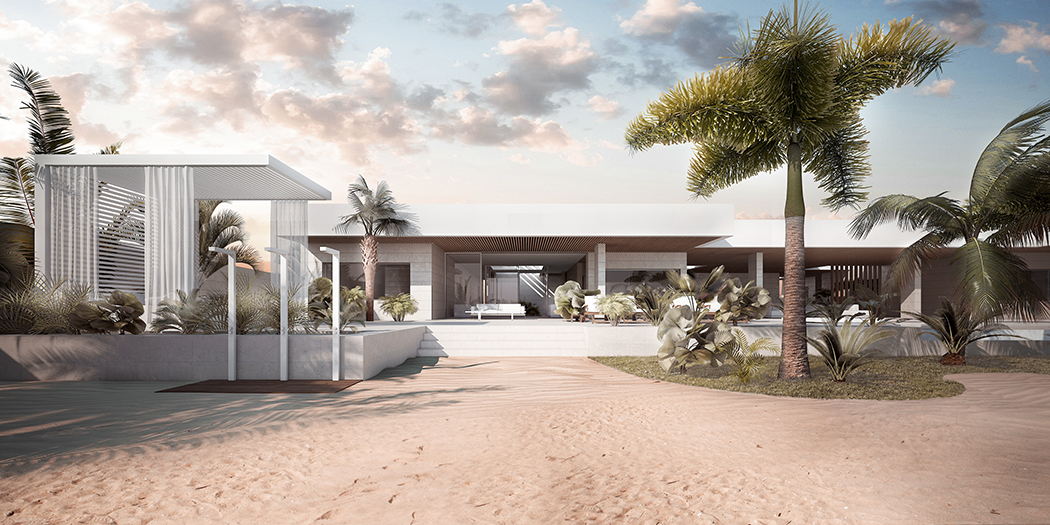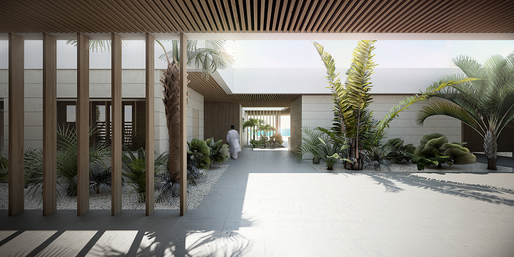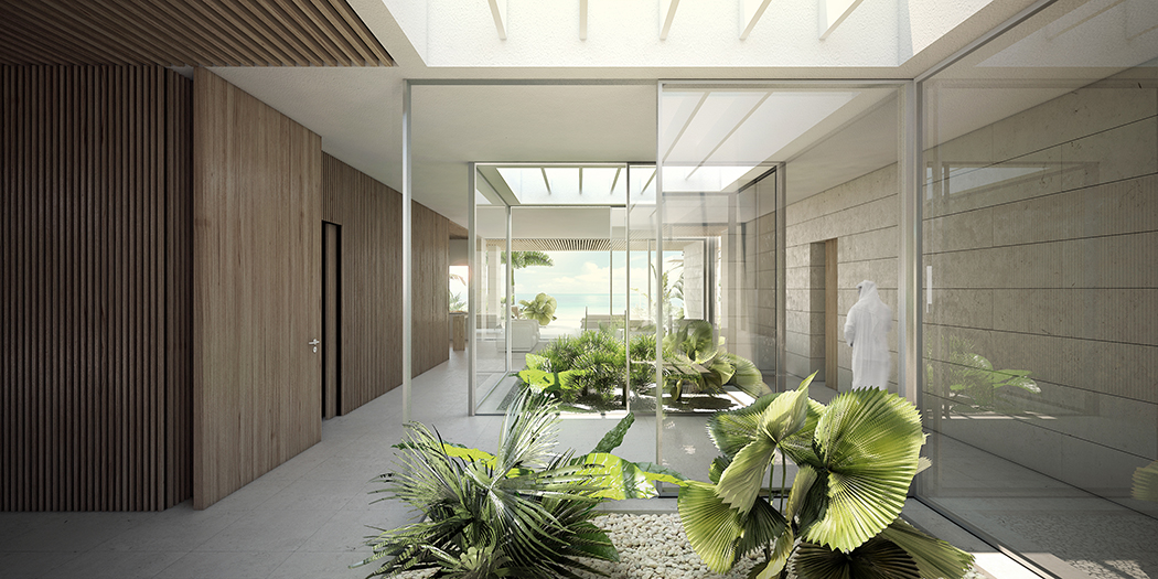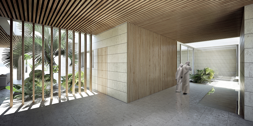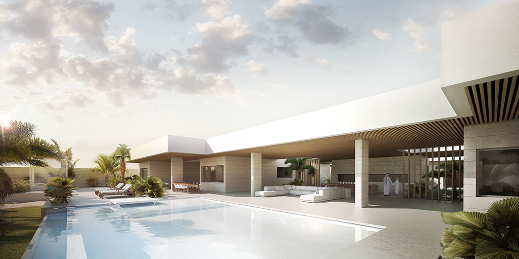 The project consists on two houses for two brothers who wanted to have their private areas but also a common area. The land is situated in front of the Durrat al Arous beach in Saudi Arabia. The climate in this area is extremely hot especially in summer. Whereupon we considered several ideas that could allow the house withstand better these extreme temperatures. The terrain has three plots, the main idea, as we had a large area, was attempting to project the two houses on one floor, each would place in one of the side plots, and the central plot would stand the common areas. Another important decision was to cover most of the central area so that would generate a large open space, protected from solar radiation. In this space area placed a barbecue area, a bar, an outside dining and an outside living area. Later we begin to locate some courtyards, indoor and outdoor, covered by slats, that not only help us to distribute the spaces, they also create a natural ventilation and cooling stays, thanks to the plants and water sheets. A white ribbon runs around the front of the house and courtyards, the rest of the facade and the flooring, is projected as a clear natural stone, so both materials will mitigate heat absorbed. The cover poses with aluminum slats that protect it from direct sunlight and prevent a source of constant heat radiation into the interior of the housing, reducing the energy consumption of air conditioners and comfort of homes increases. In front of both houses raises the open spaces, to enjoy the garden, the beach, the pool and the sun in the tempered days.