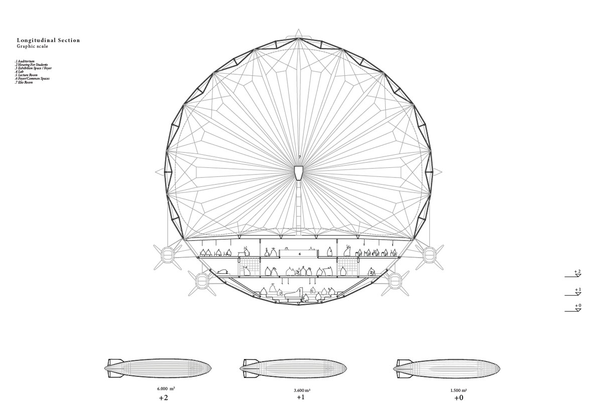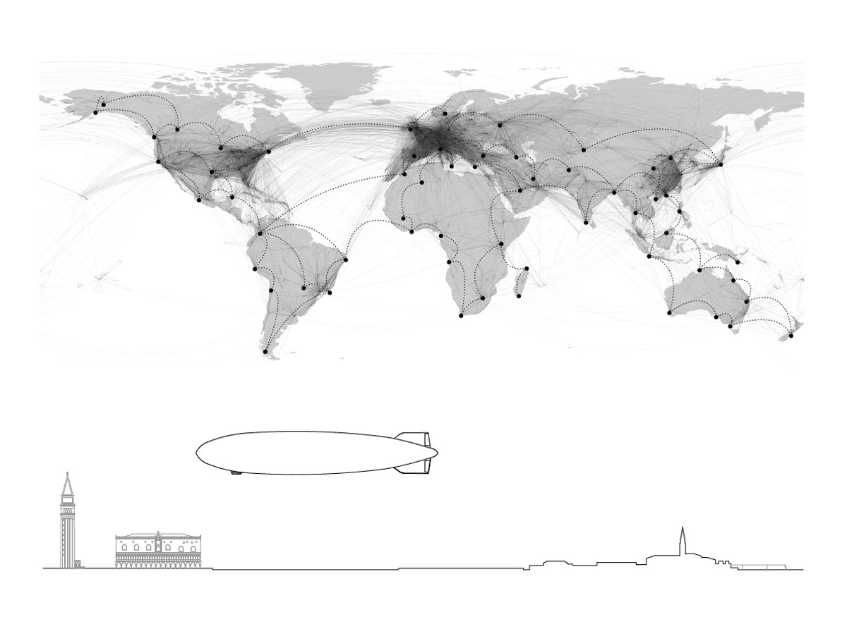 The idea is rather simple: transforming Teatro del Mondo in a Worldwide machine. The slow speed is perfect to enjoy the trip, study and experience the beauty of a global journey. We choose the “Zeppelin airship”, a huge, slow and movable element, as the strategic symbol of the idea of the unstoppable spreading of culture. It is the right way to move on from the static approach of the italian university nowadays to something new.