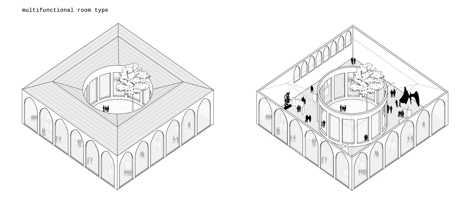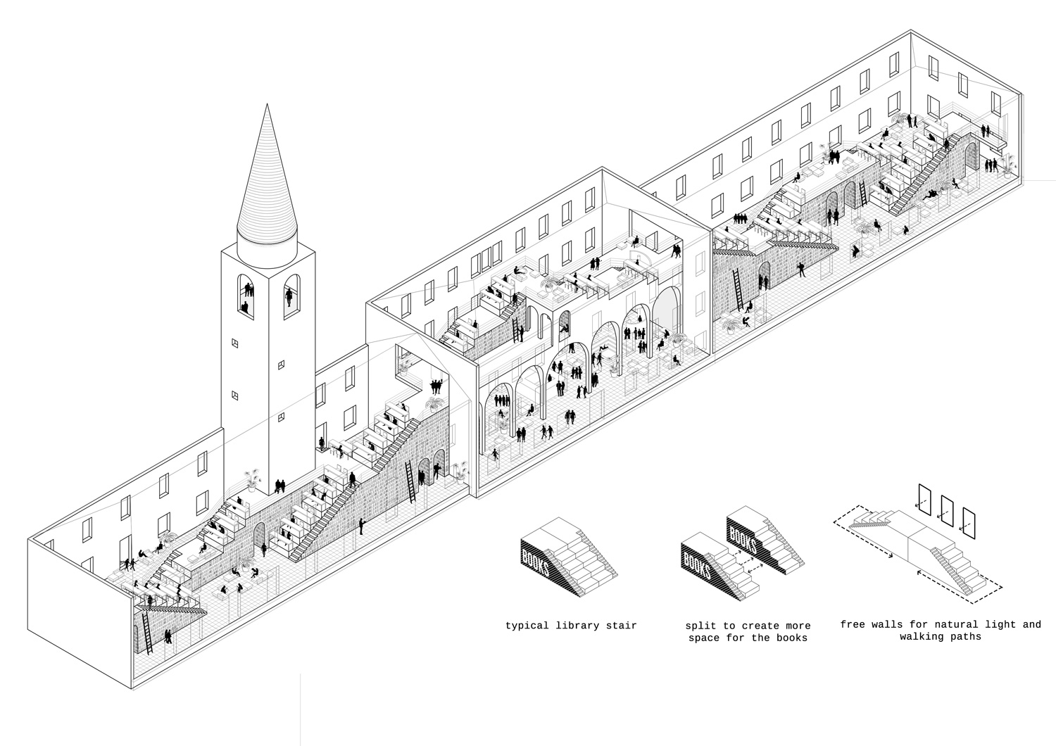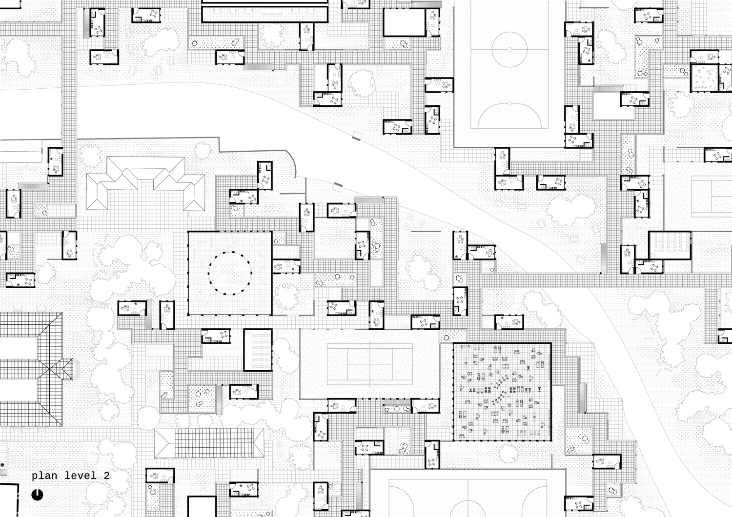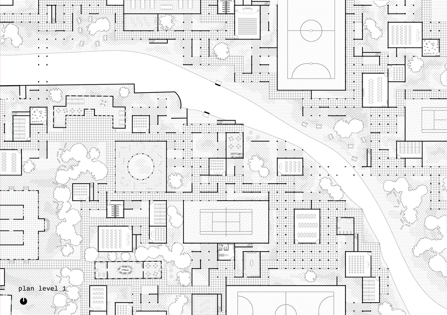 Luckily the typical internal sectorization of the universities is not, however, entirely possible to Poveglia, because of its natural island’s configuration that makes the direct relationship with the city more difficult. This is why in this case the university must also incorporate part of the functions that would normally exist in the surrounding city. In addition, the competition also requires the presence of residences in the project, which joined to the indirect relationship with the city, it means that for the most of the time, some students will spend all their time, day and night, on the island of Poveglia. So the project dialogues ideologically with Venice, and it is conformed like a real city, with its openings, its views, its chaotic appearance, but actually ordered, and especially with all its vital functions. It merges its most typical features, such as classrooms, libraries and offices, with some features characteristic of the city, such as shops, bars, restaurants, supermarkets, banks, barber shops, gyms and cultural centers, in a complete urban system.