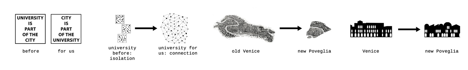 Venice is a city with a proud past, reflected in the numerous cultural activities that still pervade it, but that, in recent years, it is seeing his identity changing. It is one of the greatest architectural monuments of humanity, and as such, it would suffer in being compared with an ambitious new building, that maybe instead of help in maintaining its position as unique city in the world, would ultimately make it only more common. It is indeed a jealous place, which is not revealed immediately but in fragmented glimpses, that lives in symbiosis with the environment, and finds its strength in unity and coexistence of all its parts, resembling de facto to a single and continuous painting. Its urban grid is dense, labyrinthine, which untieds only at key points such as squares, or the canal grande. Unlike the venetian city, the universities often manage spaces and functions in a schematic and orderly way; this allows them to separate departments, libraries, residences and offices from each other, and allow them not to find a real relationship with the city. In fact, in the universities, the students could spend a lot of time in them, but they won’t live in them, or at least most of them won’t; and even if they live in the university, they stay in residential areas, often separated from the educational areas. This causes an emargination and a closure, physical and ideal, of the departments, which becomes eremitical areas, partially alive only during the opening hours, and of the residences, alive only after the working hours.