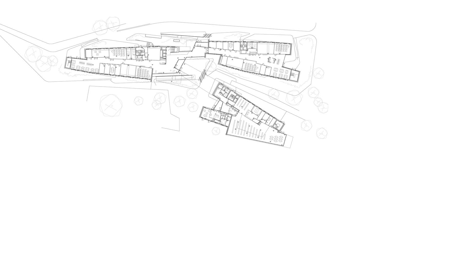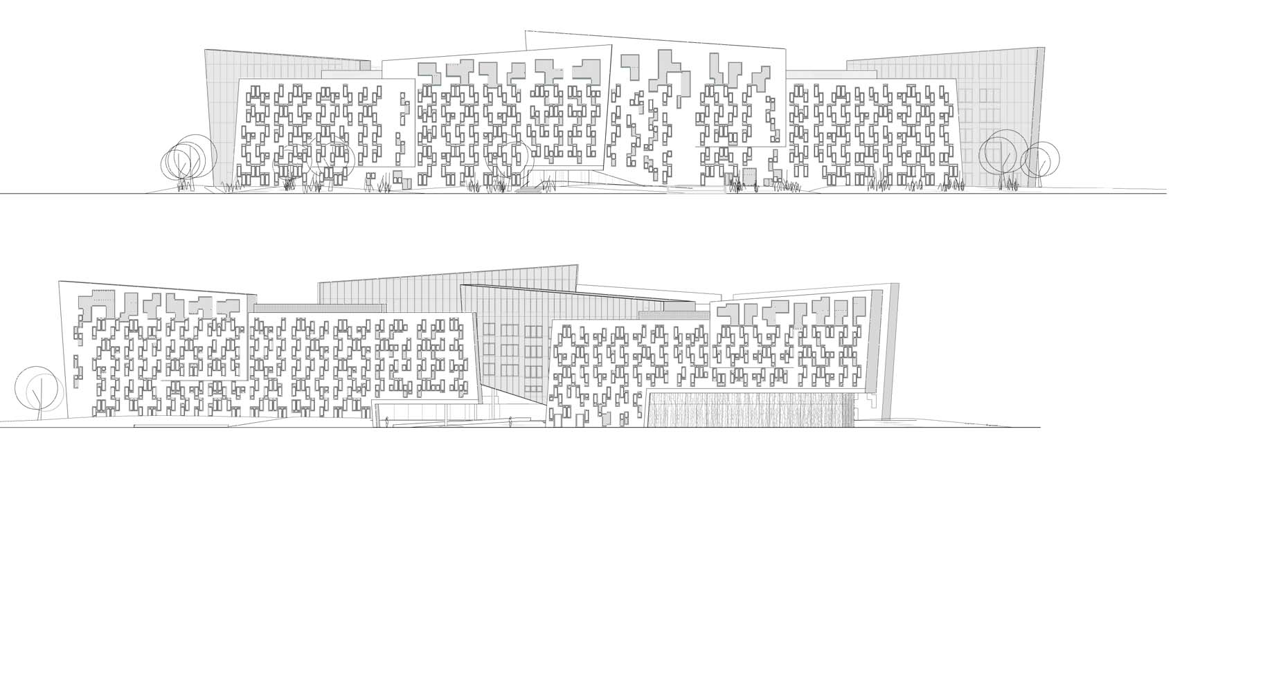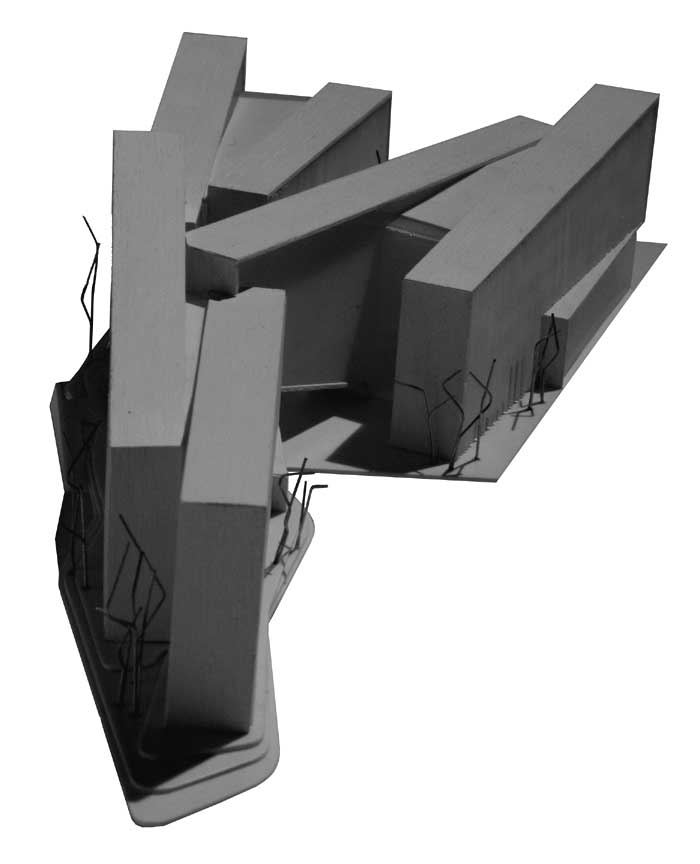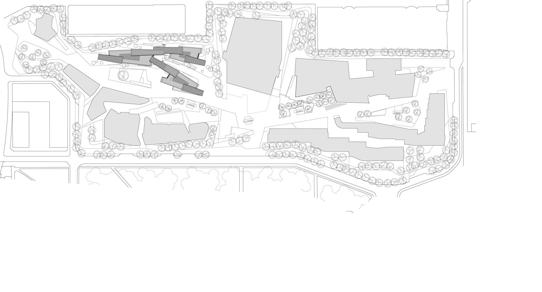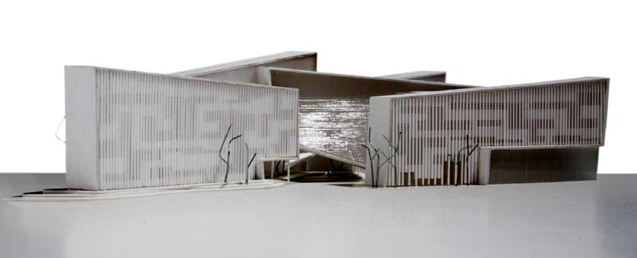 The project consists of two main buildings responding to very different programs. One of the buildings is placed in the center of the campus while the other one is on the outer part, being the university’s external image with a more public program. We think that this last one should have a more singular character, as it can be seen as the entrance hall to the university. We solved the quite systematic program of the two buildings, with a game of parallelograms, which resolves very easily the placement of the different offices and other rooms. In the institutes’ building, the game of volumes solves the connection between the two separated parts of the building proposed in the masterplan and each institutes’ program can be placed in only one level without losing the required pedestrian passage: by uplifting one of the wings we let the street pass underneath the building. In this building, the game of volumes responds to our wish of creating public spaces and paths. The main street’s façade shelters the public areas, such as the cafeteria and the library, which have an independent entrance. The wing housing the classrooms on the ground floor is lifted 1,5 m on grass mounds to give them more privacy. The vast façades are solved with 30 cm wide vertical strips that, as well as working as “brise-soleil”, create a constant change of image as the point of view is moved. The façades of the various parallelograms appear to be different even if they are more or less alike. In the other building we wanted to emphasize the entrance to the university, so the volumes are lifted up as cantilevers, allowing one to pass under the others and converting it into a glass volume, the university’s hall. The metal beams and the concrete fillings that make possible the cantilevering become the façade’s formal expression. A silk-screened glass wall covers the beams, blending them and providing the structure with an elegant quality.