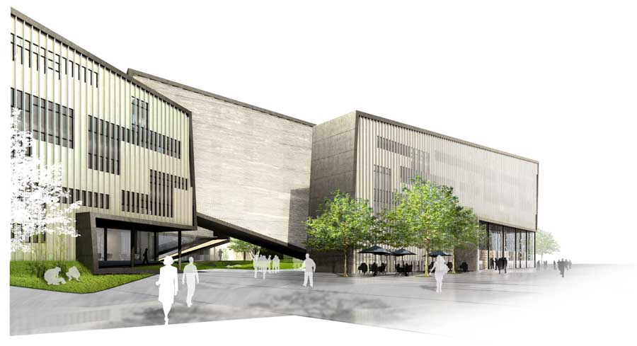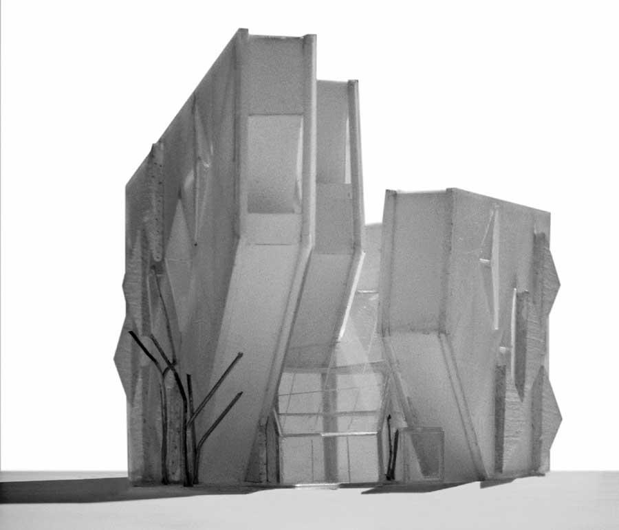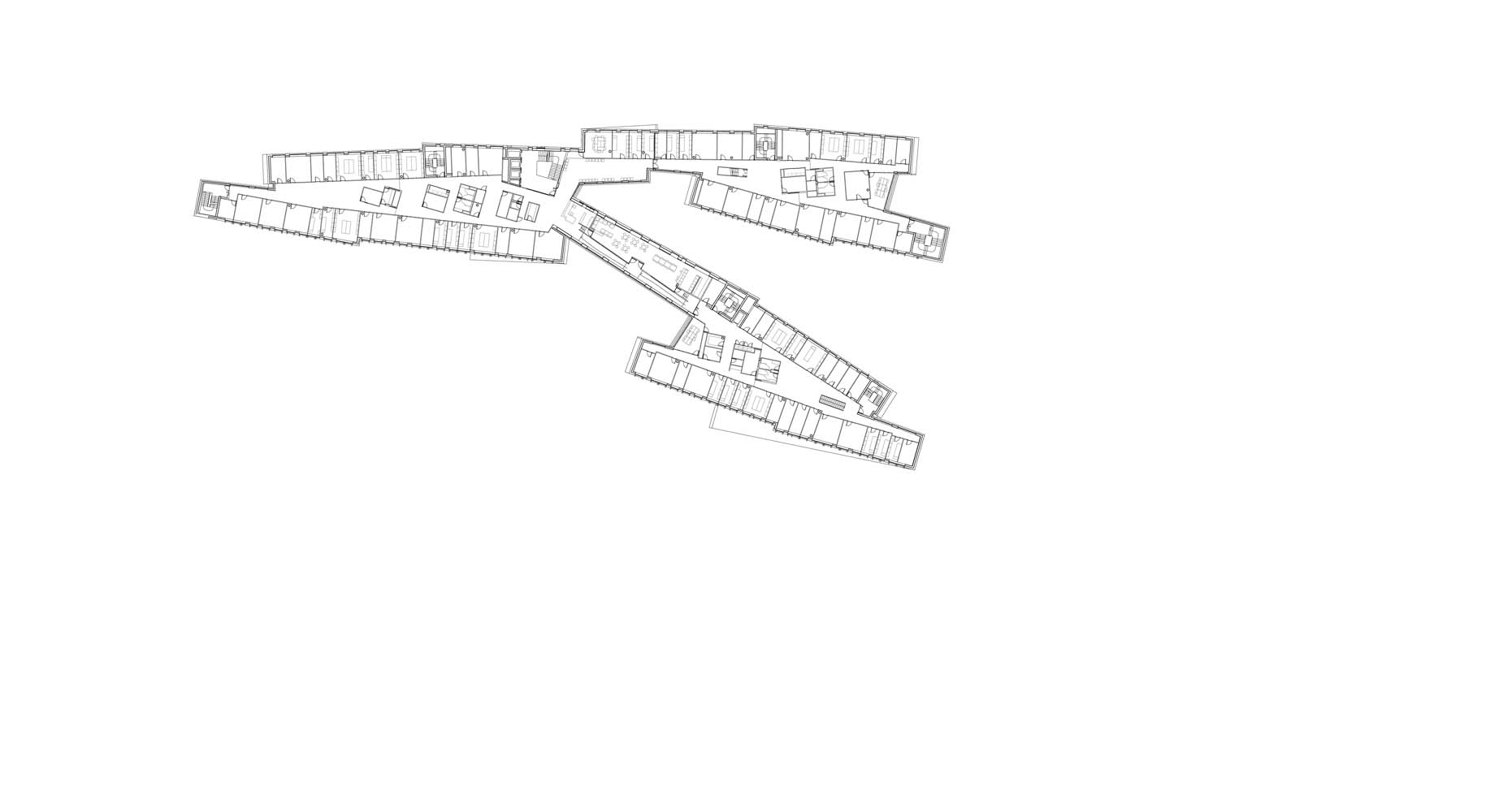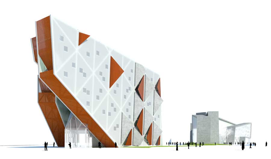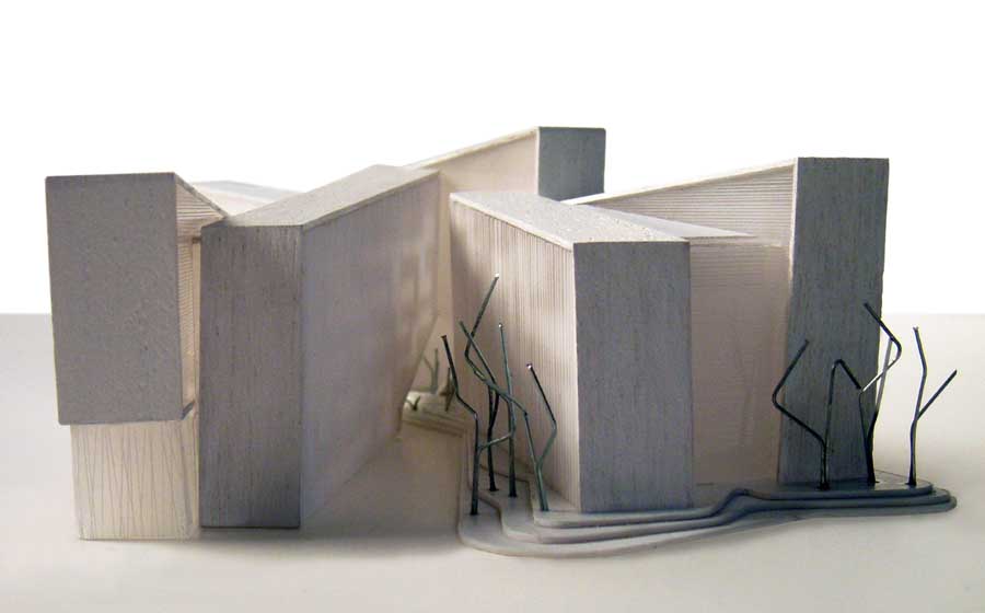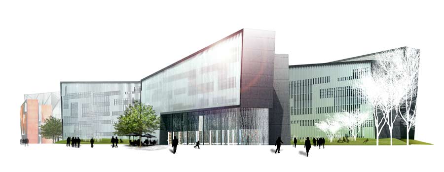 The project consists of two main buildings responding to very different programs. One of the buildings is placed in the center of the campus while the other one is on the outer part, being the university’s external image with a more public program. We think that this last one should have a more singular character, as it can be seen as the entrance hall to the university. We solved the quite systematic program of the two buildings, with a game of parallelograms, which resolves very easily the placement of the different offices and other rooms. In the institutes’ building, the game of volumes solves the connection between the two separated parts of the building proposed in the masterplan and each institutes’ program can be placed in only one level without losing the required pedestrian passage: by uplifting one of the wings we let the street pass underneath the building. In this building, the game of volumes responds to our wish of creating public spaces and paths. The main street’s façade shelters the public areas, such as the cafeteria and the library, which have an independent entrance. The wing housing the classrooms on the ground floor is lifted 1,5 m on grass mounds to give them more privacy. The vast façades are solved with 30 cm wide vertical strips that, as well as working as “brise-soleil”, create a constant change of image as the point of view is moved. The façades of the various parallelograms appear to be different even if they are more or less alike. In the other building we wanted to emphasize the entrance to the university, so the volumes are lifted up as cantilevers, allowing one to pass under the others and converting it into a glass volume, the university’s hall. The metal beams and the concrete fillings that make possible the cantilevering become the façade’s formal expression. A silk-screened glass wall covers the beams, blending them and providing the structure with an elegant quality.