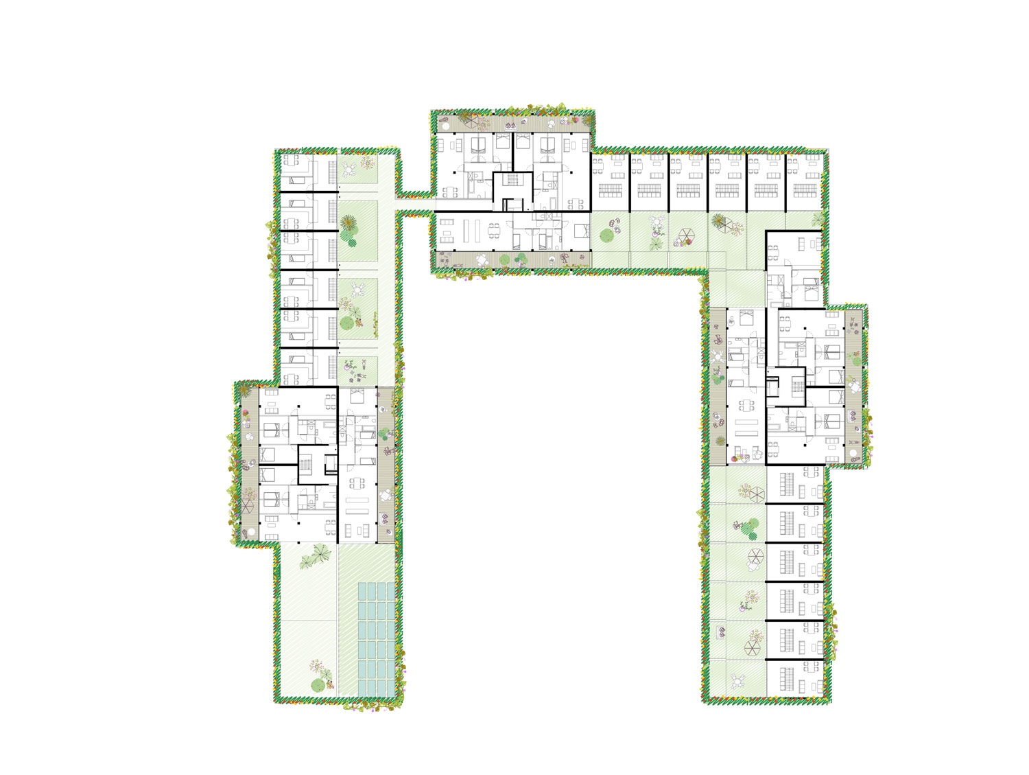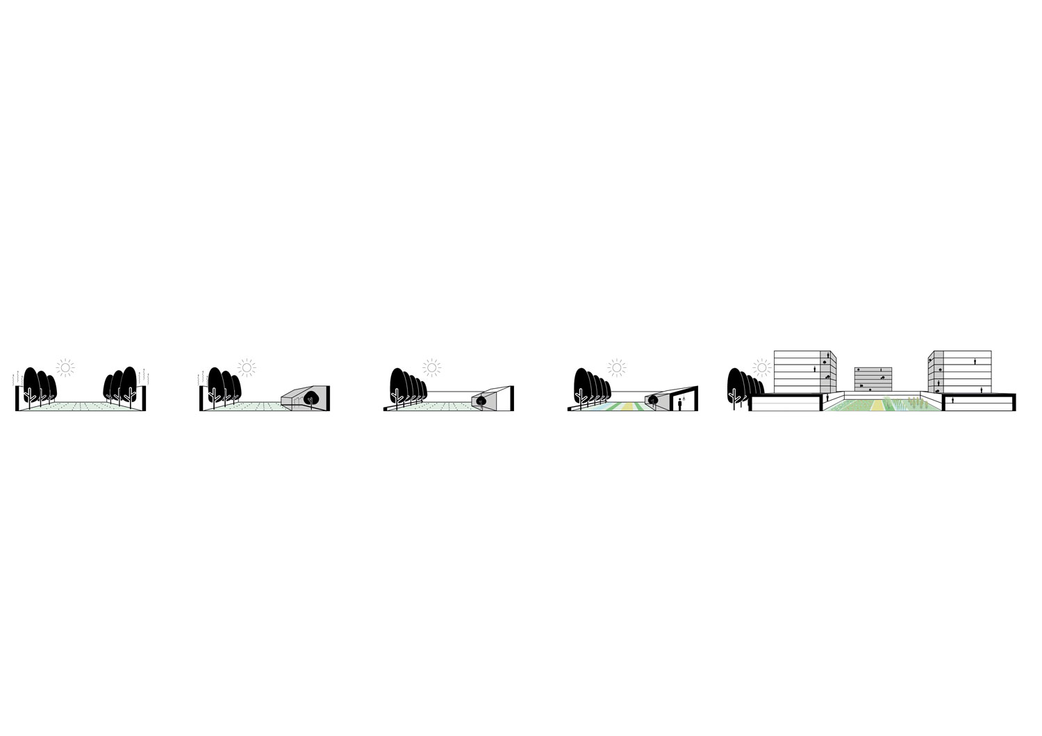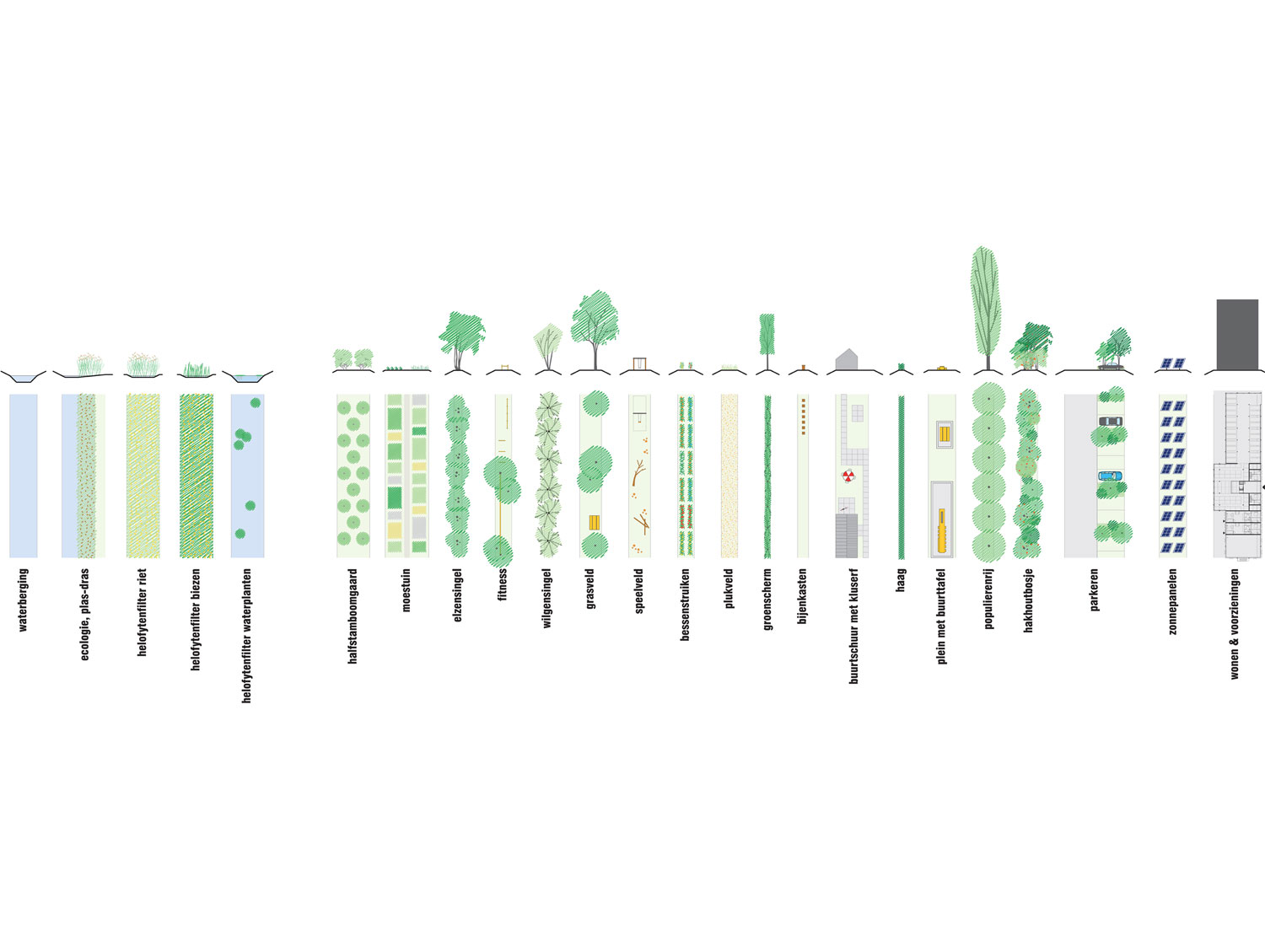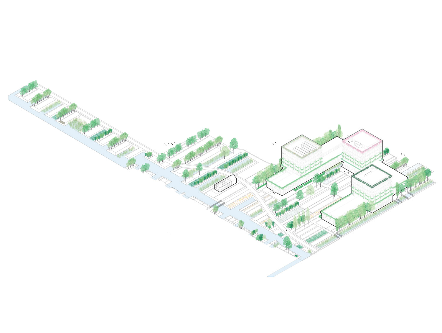 With the ‘Urban Biotope’ in The Hague we propose a new type of housing, where landscape mimics the city and urbanity is treated like a natural phenomenon. Building and park act as a single hybrid landscape. A landscape that is intensively used and programmed: it purifies water, local inhabitants grow their own food, places to work, play and sport are abundant. The park is stratified by a set of linear islands that result in a natural zoning. Closer to the buildings, the wetlands rise to turn into grass to guide to transition from public to private. The project houses a differentiated mix of typologies for urban dwellers, from social housing to spacious family houses. Located in the most urbanised country in the world, the architecture fits seamlessly in the surrounding landscape. Both the building and the landscape are designed as a closed water system with water retention on the roofs and helofytfilters in the landscape. The green living facades and roofs regulate light, air, heat and cold. The façade design merges interior with nature. Every single room has a spacious outdoor green space.