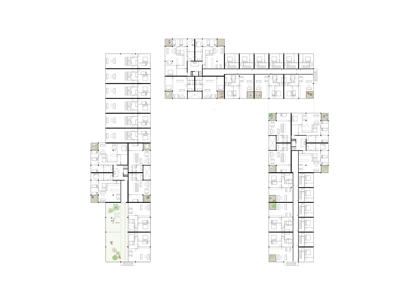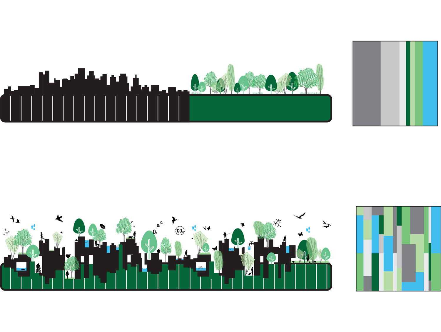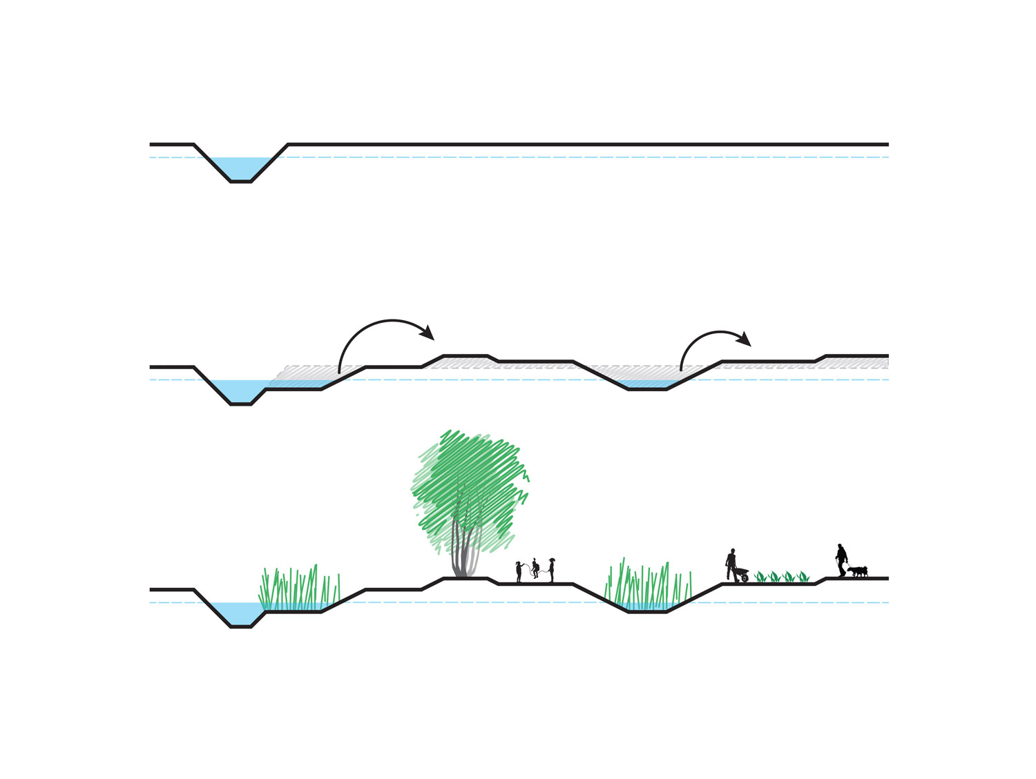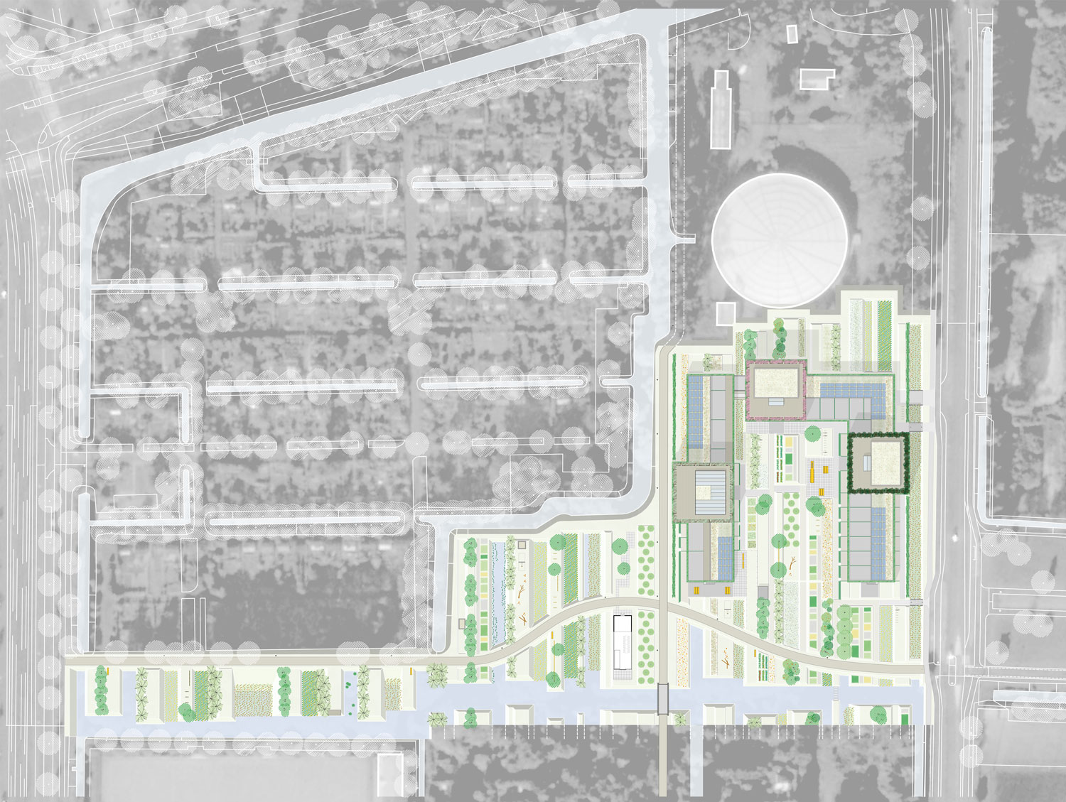 With the ‘Urban Biotope’ in The Hague we propose a new type of housing, where landscape mimics the city and urbanity is treated like a natural phenomenon. Building and park act as a single hybrid landscape. A landscape that is intensively used and programmed: it purifies water, local inhabitants grow their own food, places to work, play and sport are abundant. The park is stratified by a set of linear islands that result in a natural zoning. Closer to the buildings, the wetlands rise to turn into grass to guide to transition from public to private. The project houses a differentiated mix of typologies for urban dwellers, from social housing to spacious family houses. Located in the most urbanised country in the world, the architecture fits seamlessly in the surrounding landscape. Both the building and the landscape are designed as a closed water system with water retention on the roofs and helofytfilters in the landscape. The green living facades and roofs regulate light, air, heat and cold. The façade design merges interior with nature. Every single room has a spacious outdoor green space.