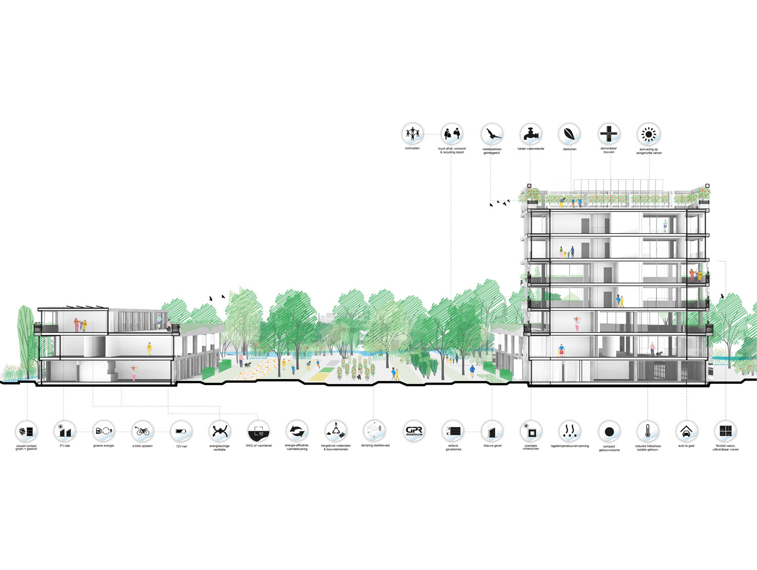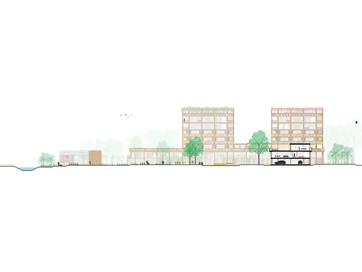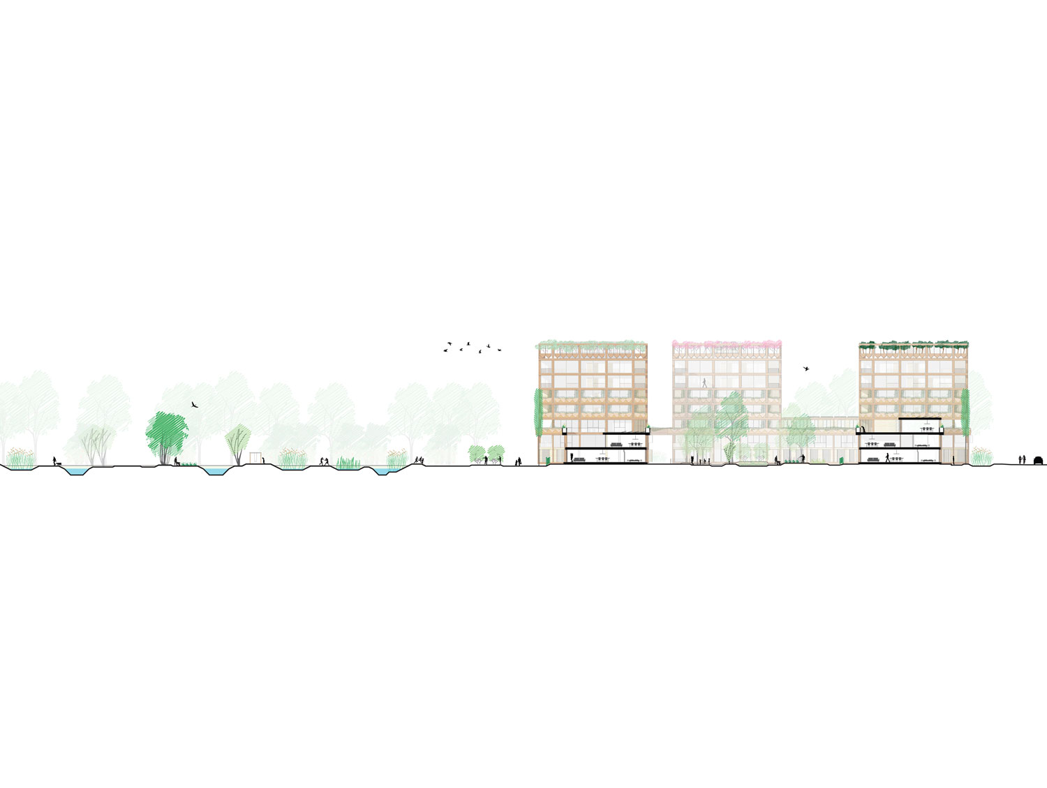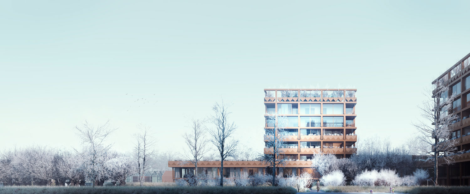 The ground floor houses offer direct contact with the park, the houses on the second floor have access to generous roof-gardens, the apartments in between have green balconies and the penthouses on top are placed in a private suburban garden. The apartments above the canopies will make use of passive solar energy for heating an each apartment has a winter garden. These semi climatized spaces function as an extension to the main living space for use in spring and summer. The wooden structural frame creates a flexible, healthy and sustainable building and it grants the building its distinctive architectural quality. The Urban Biotope combines the best of two worlds: in the middle of nature, it is as urban as an inner-city neighbourhood. Nowhere in the countryside you will find such an urbanity, nowhere in the city you’ll come across such a wild landscape.
