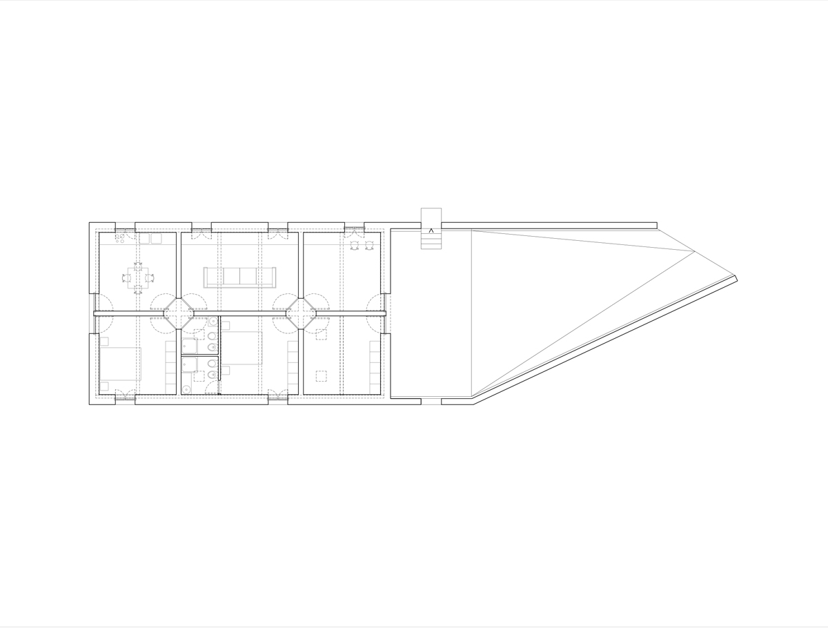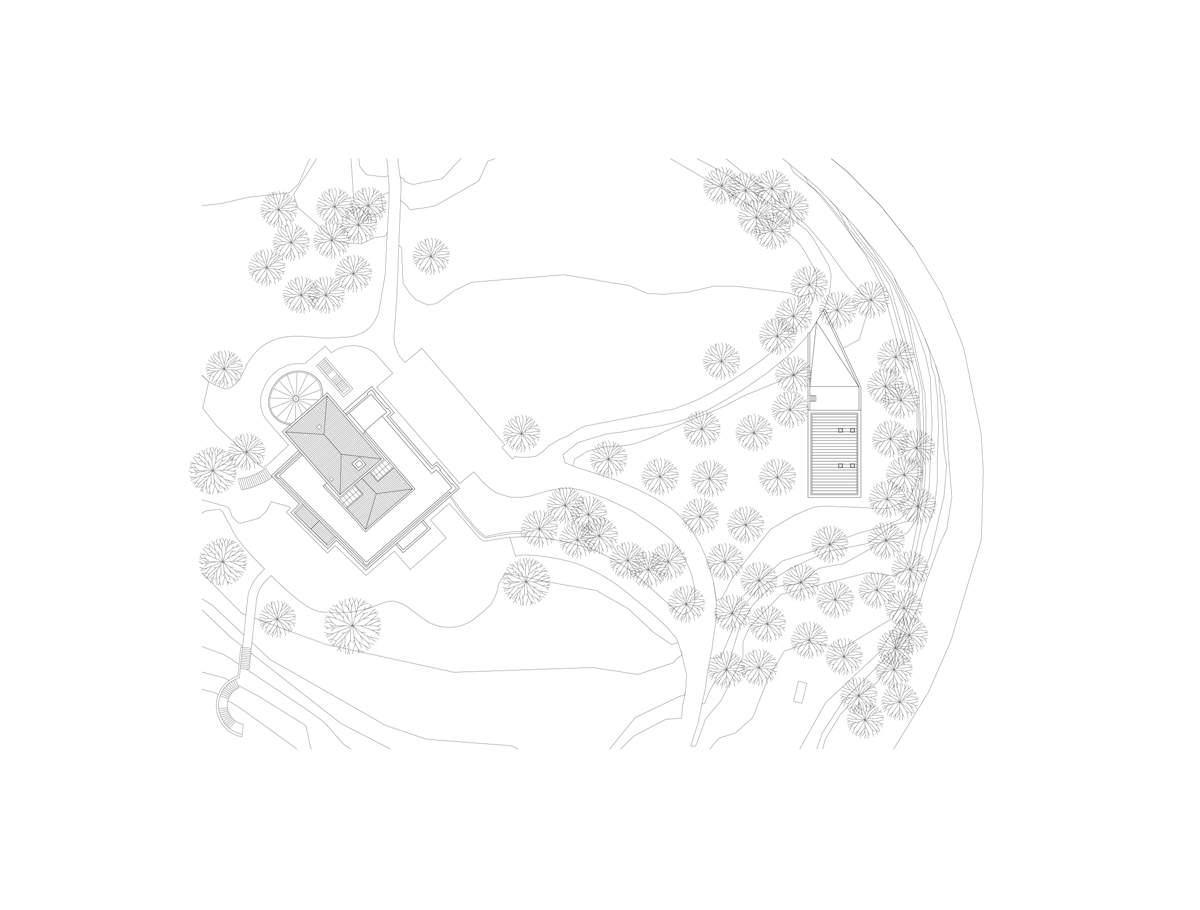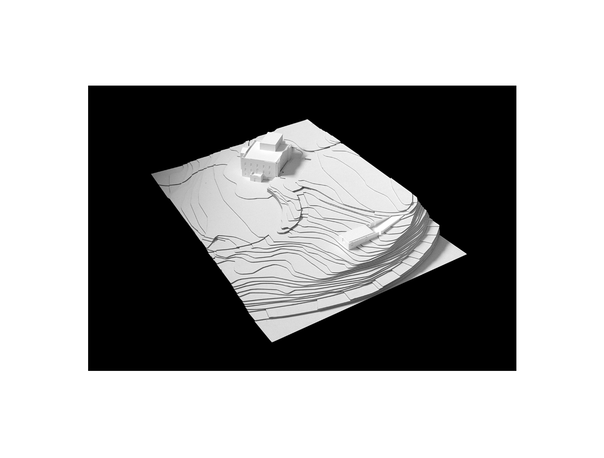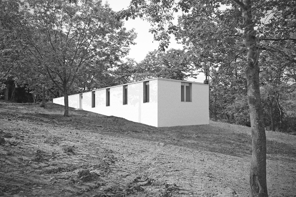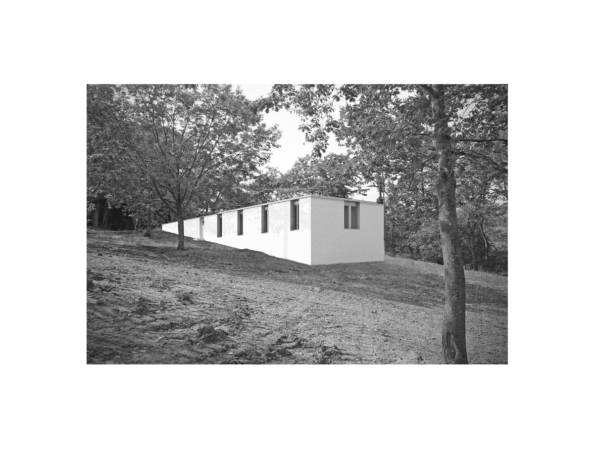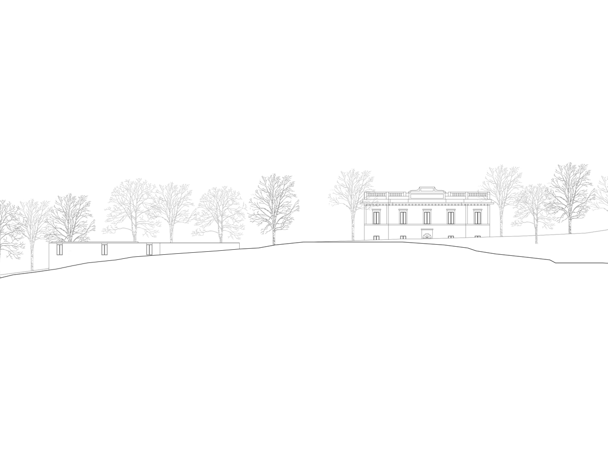 L’idea di muro abitato è il principio che ispira la casa del custode di villa Belpoggio-Baciocchi. La necessità di raccordare la forte pendenza che caratterizza l’area di progetto genera un edificio stretto tra due muri che da terrapieni di contenimento diventano patio introverso e abitazione. Come villa Baciocchi è subordinata alla più fastosa villa Bentivoglio imitandone forme e stile, anche nel progetto della casa del custode si è scelto un approccio quanto più possibile rispettoso del luogo e della storia. Questo atteggiamento trova riscontro nella pianta modulare che si nasconde nel declivio e nei prospetti che richiamano paratatticamente le proporzioni della villa, le finestre sono infatti dello stesso numero e dimensione. Nella distribuzione interna si è scelto di evitare disimpegni per ottimizzare la dimensione dei singoli ambienti. La direzionalità privilegiata è quella della zona giorno per garantire il massimo affaccio verso la villa. Simmetricamente la funzione del custodire lascia spazio alla dimensione privata della zona notte-servizi rivolta verso la campagna. Questa dualità d’affaccio è espressa nella riduzione del numero di aperture che da cinque del prospetto lato villa divengono tre scorci verso valle, nel prospetto lato campagna.