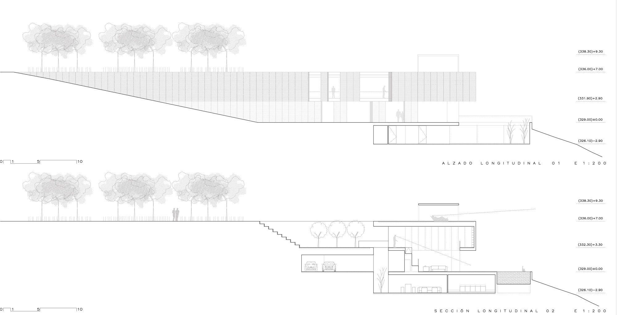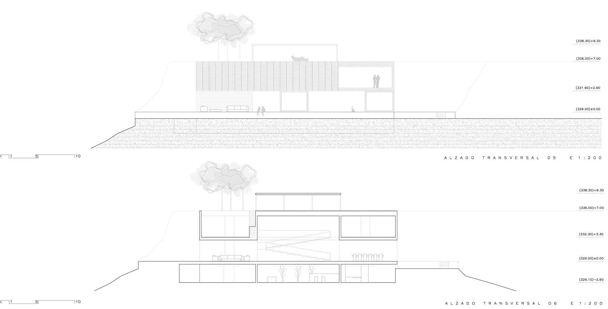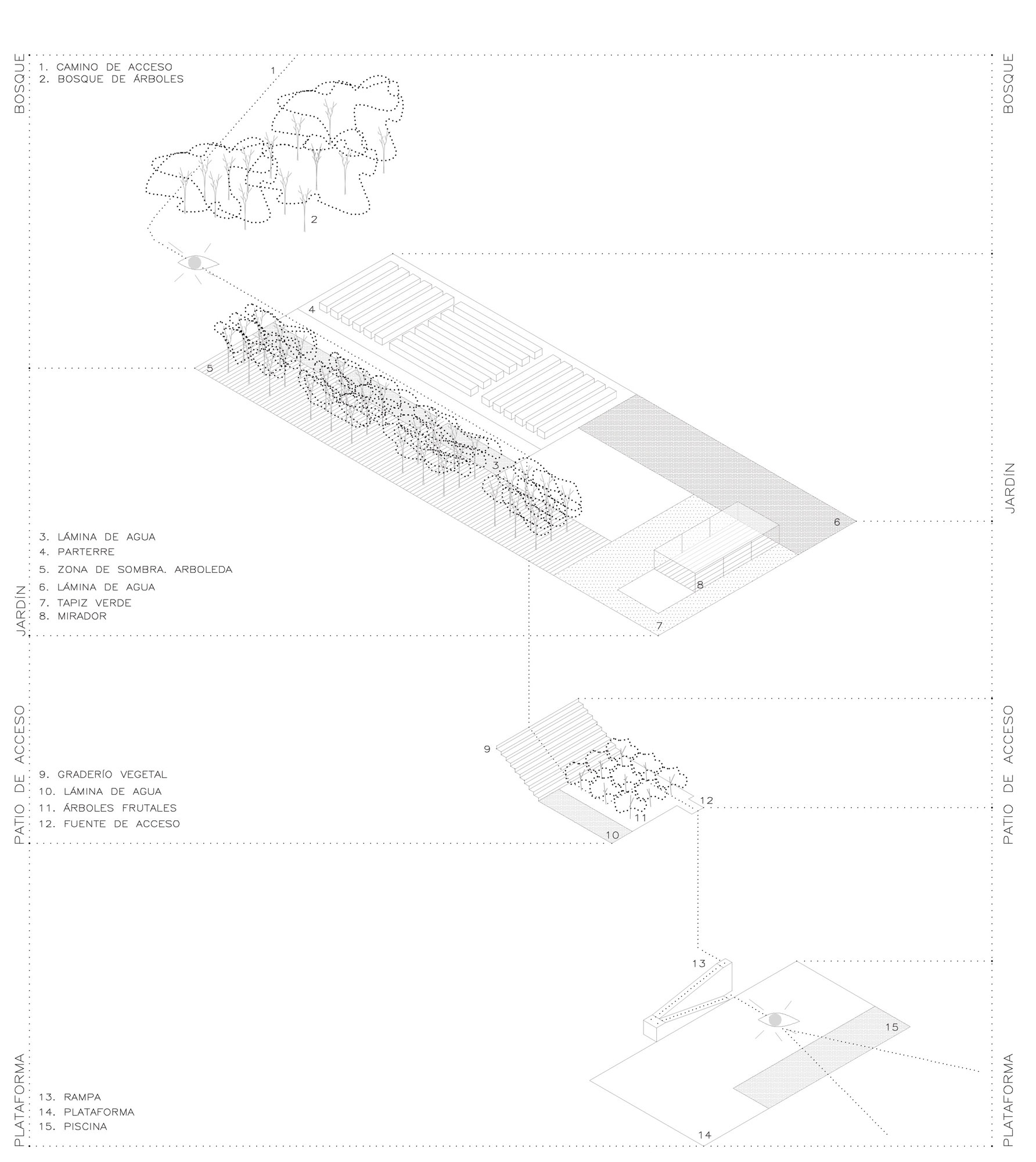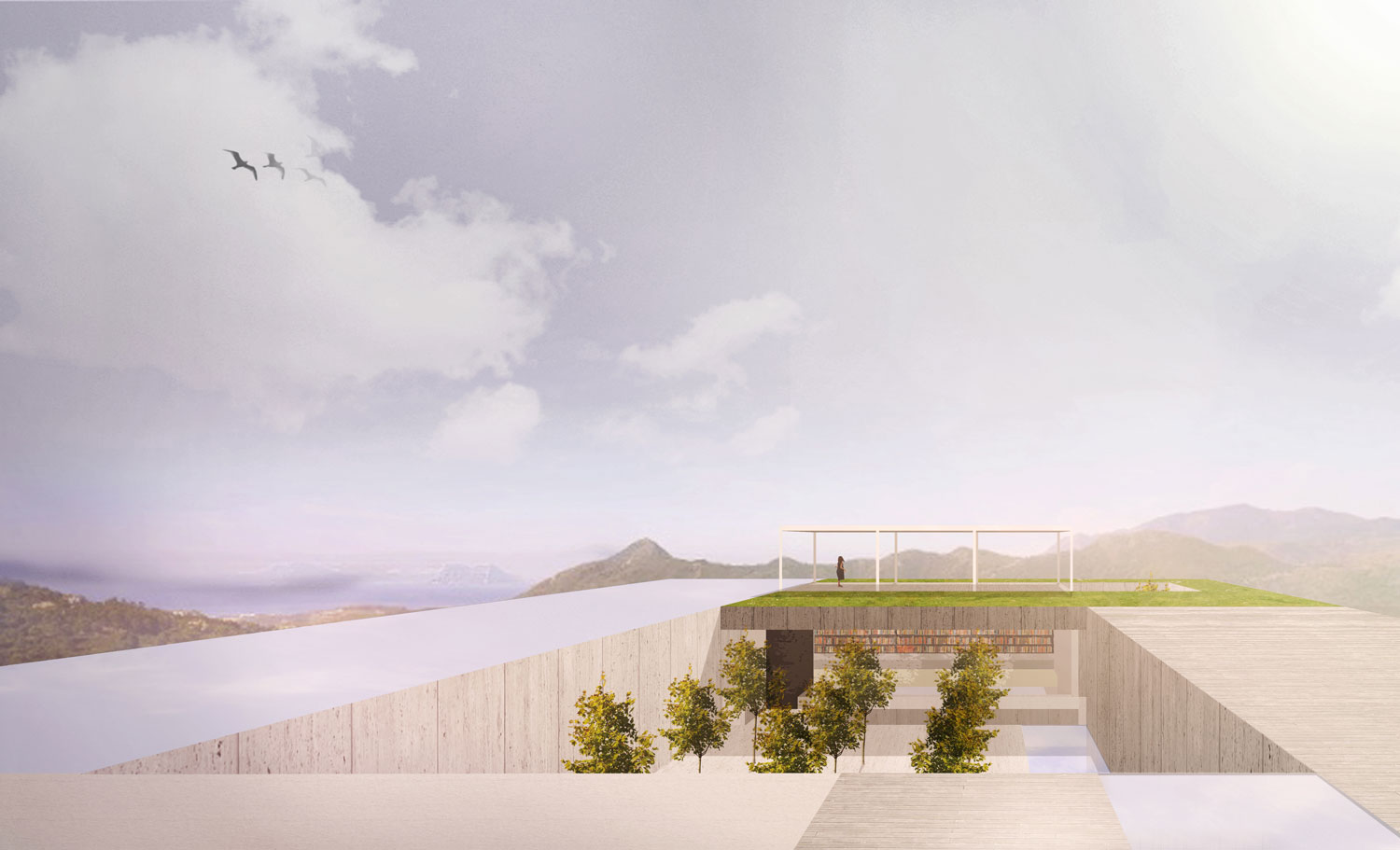 El lugar privilegiado que ocupa la parcela, permite gozar de bellísimas vistas; algunas próximas, otras más lejanas y otras que terminan en el horizonte. Mirar desde allí, se convierte en una experiencia única que debemos potenciar y a la que no debemos renunciar. La villa surge como respuesta a ese lugar sobre el que se asienta y se plantea como un recorrido a través del cual ir descubriendo ese maravilloso paisaje. Para ello, se propone invertir el orden convencional de los diferentes niveles aprovechando la marcada topografía, ocultando de este modo su volumen desde la llegada. La vivienda se dispone en sentido descendente, generando una serie de escenarios a diferentes alturas desde los que la percepción del entorno varía. El nivel de cubierta, que coincide con la cota más elevada de la parcela y por tanto con excepcionales vistas sobre el paisaje que nos rodea se transforma en un gran jardín de bienvenida que el visitante debe recorrer rodeado de elementos de agua, arboledas o pequeñas plantaciones.
