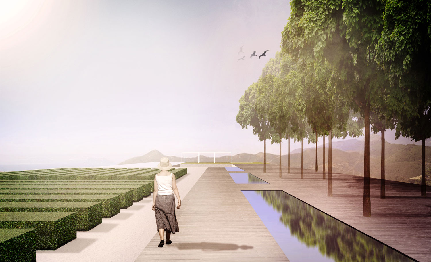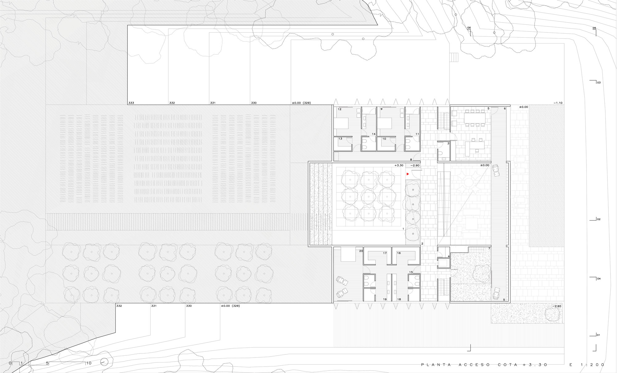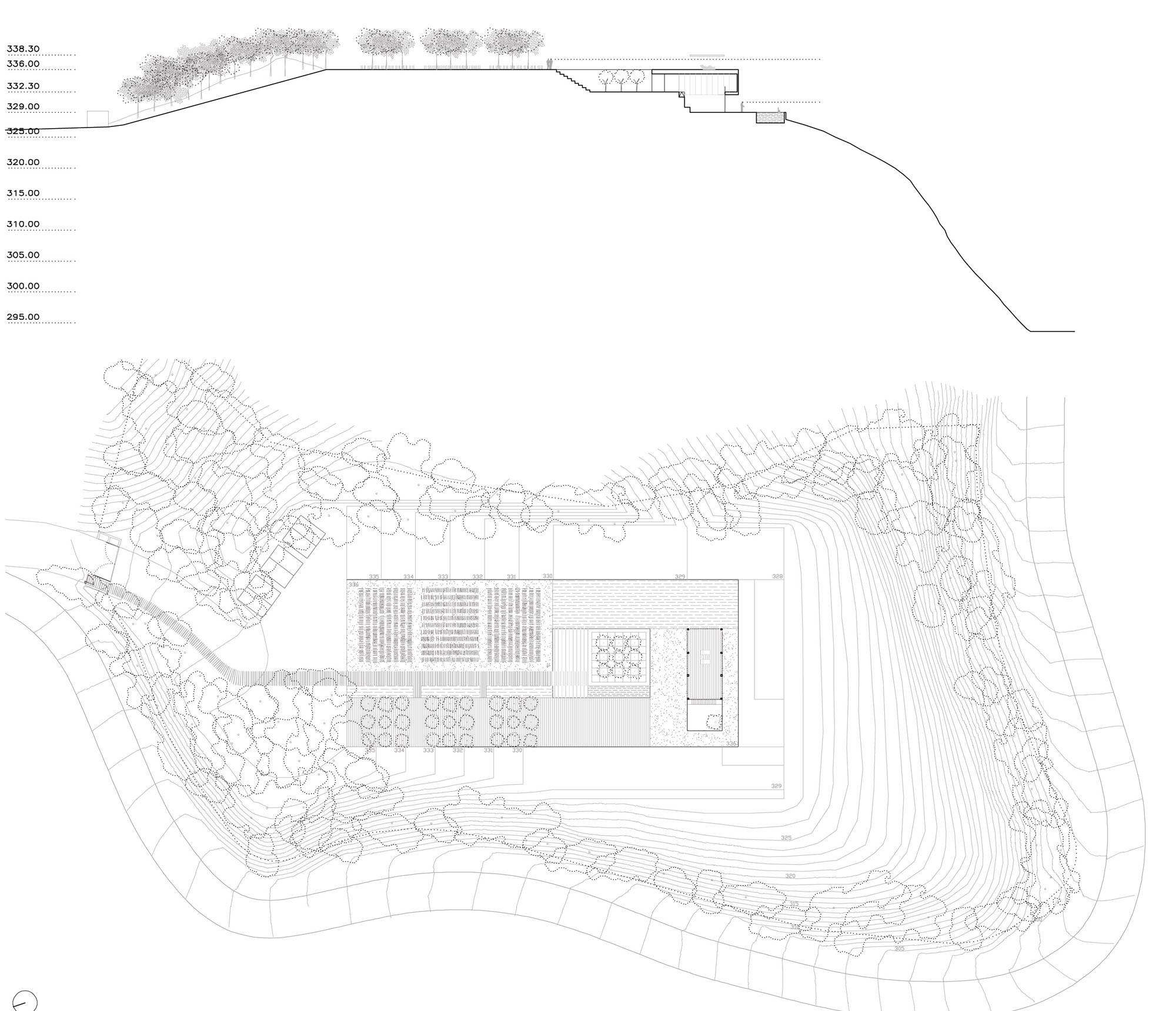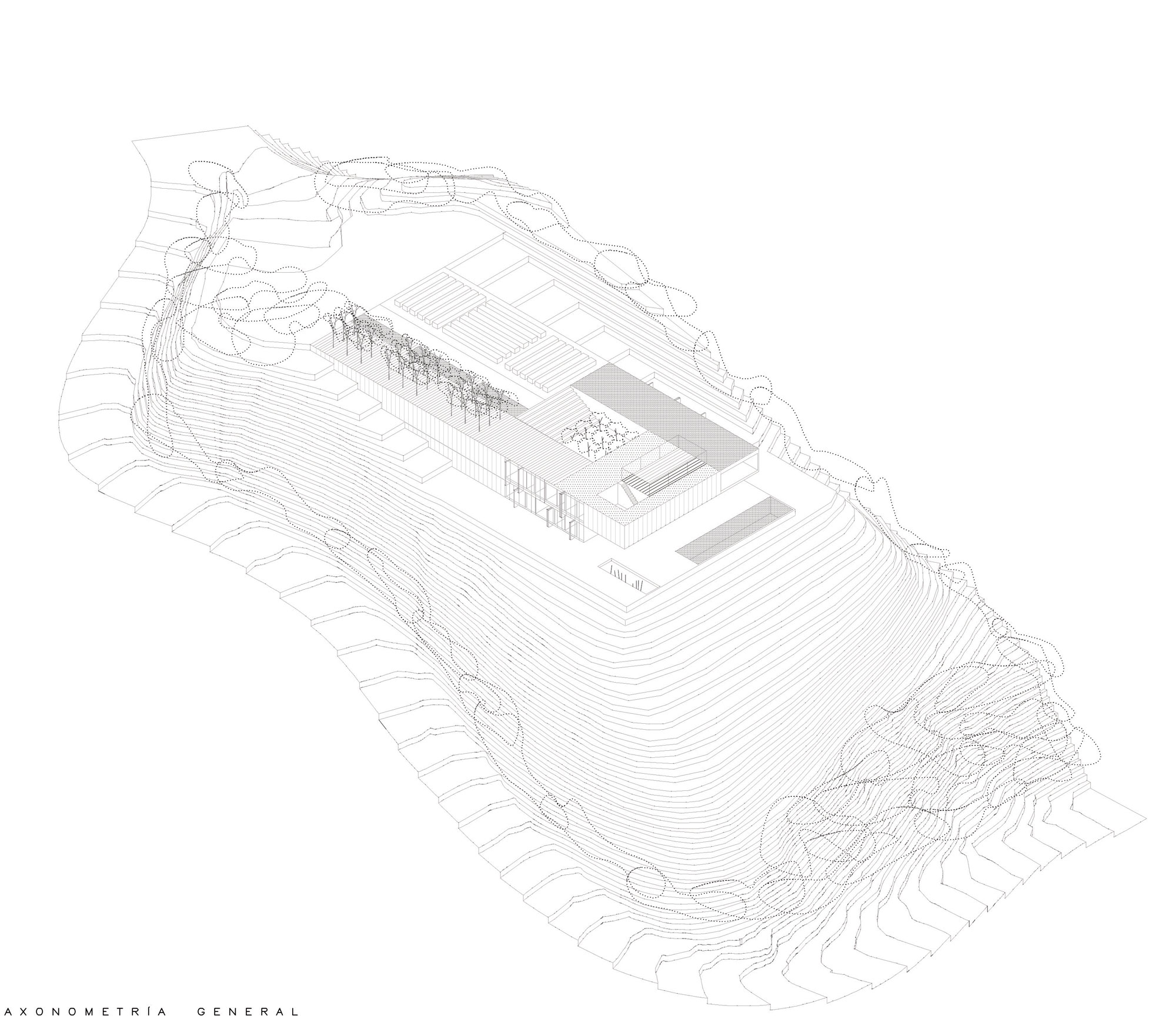 El lugar privilegiado que ocupa la parcela, permite gozar de bellísimas vistas; algunas próximas, otras más lejanas y otras que terminan en el horizonte. Mirar desde allí, se convierte en una experiencia única que debemos potenciar y a la que no debemos renunciar. La villa surge como respuesta a ese lugar sobre el que se asienta y se plantea como un recorrido a través del cual ir descubriendo ese maravilloso paisaje. Para ello, se propone invertir el orden convencional de los diferentes niveles aprovechando la marcada topografía, ocultando de este modo su volumen desde la llegada. La vivienda se dispone en sentido descendente, generando una serie de escenarios a diferentes alturas desde los que la percepción del entorno varía. El nivel de cubierta, que coincide con la cota más elevada de la parcela y por tanto con excepcionales vistas sobre el paisaje que nos rodea se transforma en un gran jardín de bienvenida que el visitante debe recorrer rodeado de elementos de agua, arboledas o pequeñas plantaciones.