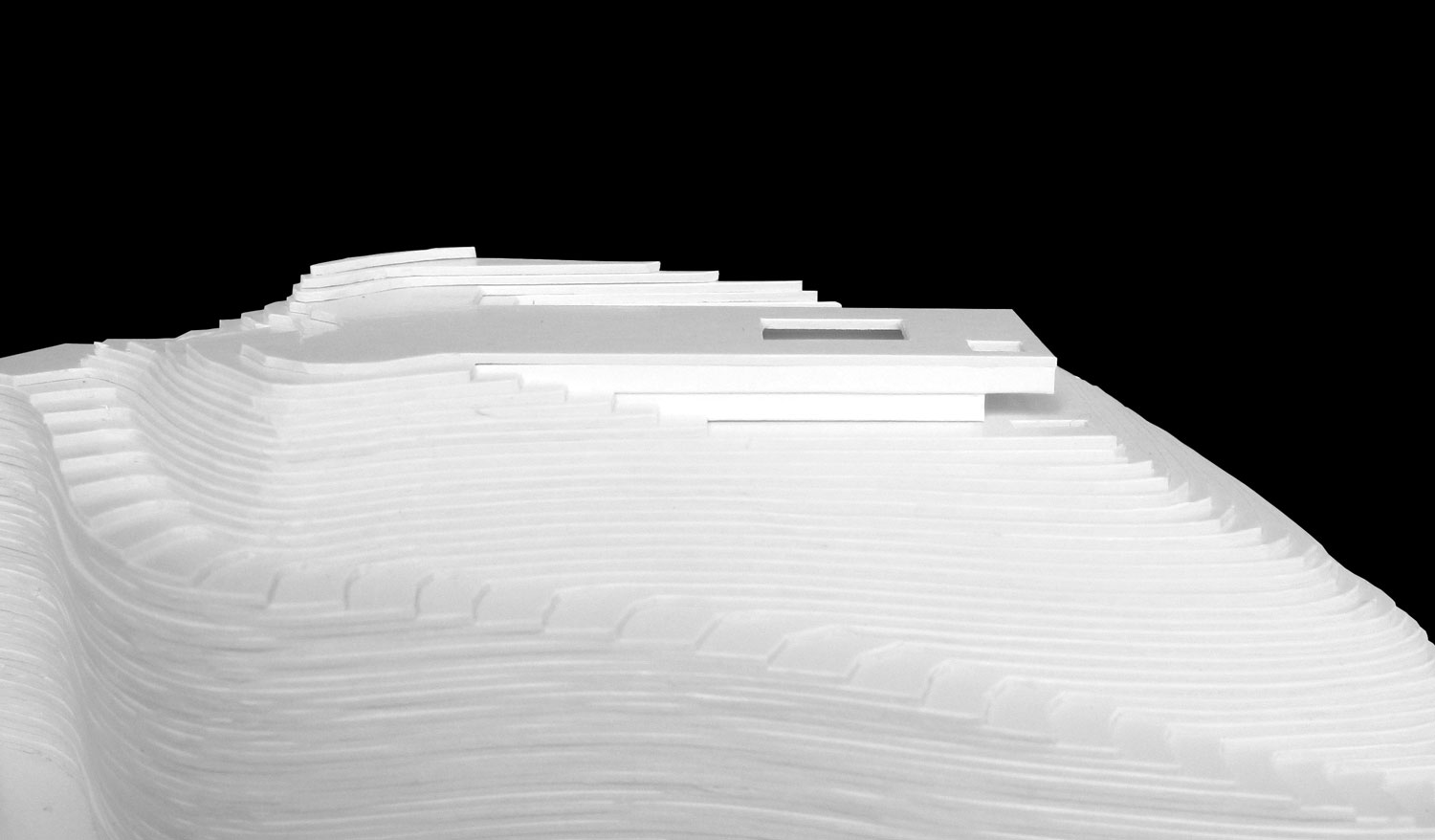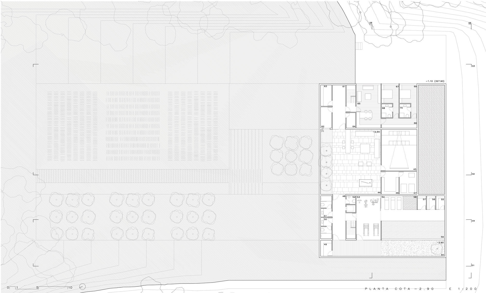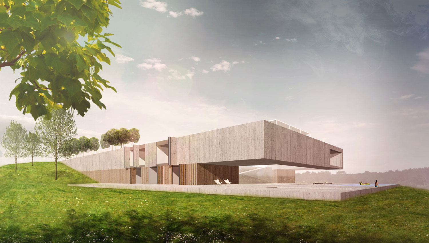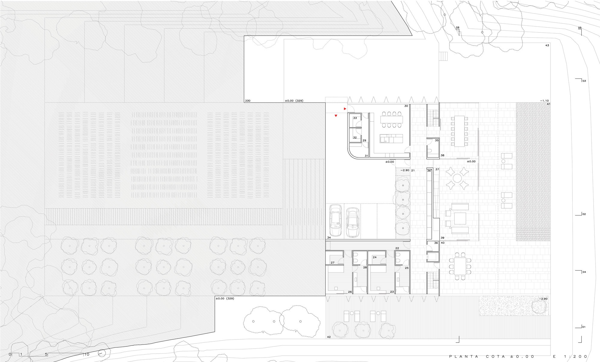 El lugar privilegiado que ocupa la parcela, permite gozar de bellísimas vistas; algunas próximas, otras más lejanas y otras que terminan en el horizonte. Mirar desde allí, se convierte en una experiencia única que debemos potenciar y a la que no debemos renunciar. La villa surge como respuesta a ese lugar sobre el que se asienta y se plantea como un recorrido a través del cual ir descubriendo ese maravilloso paisaje. Para ello, se propone invertir el orden convencional de los diferentes niveles aprovechando la marcada topografía, ocultando de este modo su volumen desde la llegada. La vivienda se dispone en sentido descendente, generando una serie de escenarios a diferentes alturas desde los que la percepción del entorno varía. El nivel de cubierta, que coincide con la cota más elevada de la parcela y por tanto con excepcionales vistas sobre el paisaje que nos rodea se transforma en un gran jardín de bienvenida que el visitante debe recorrer rodeado de elementos de agua, arboledas o pequeñas plantaciones.