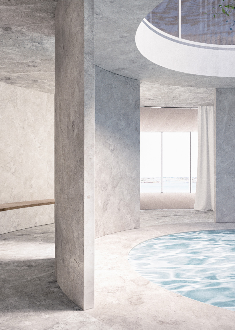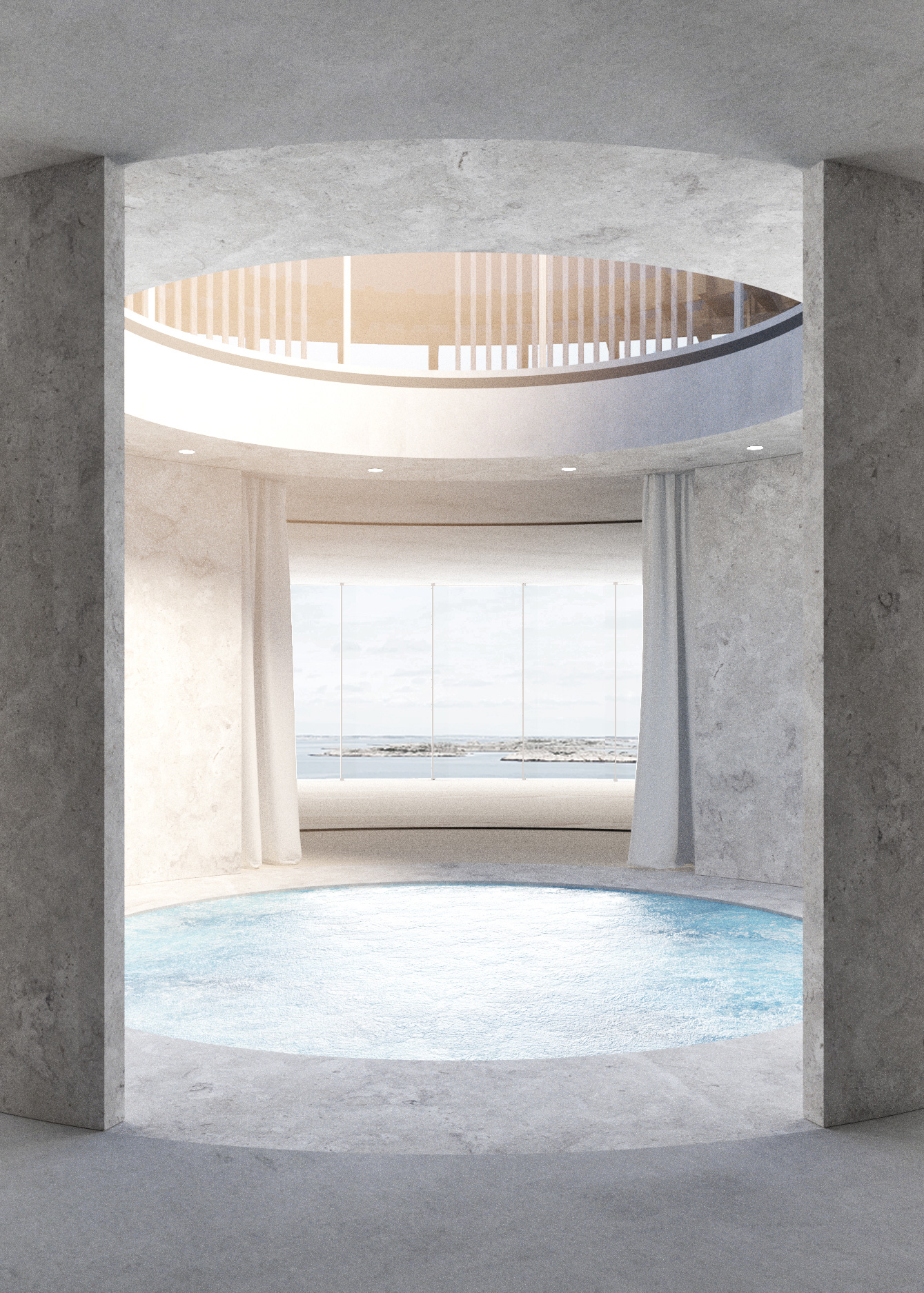 In the center of the upper level lies a courtyard, a secluded and wind-protected space with a circular water mirror, which forms a transparent roof and a visual connection to a spa on the lower level. This level is partially built into the adjacent cliffs and its interior is fronted by limestone assorted by wooden and fabric elements.