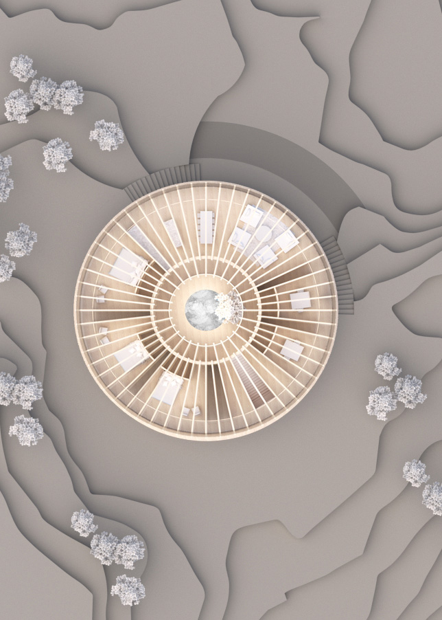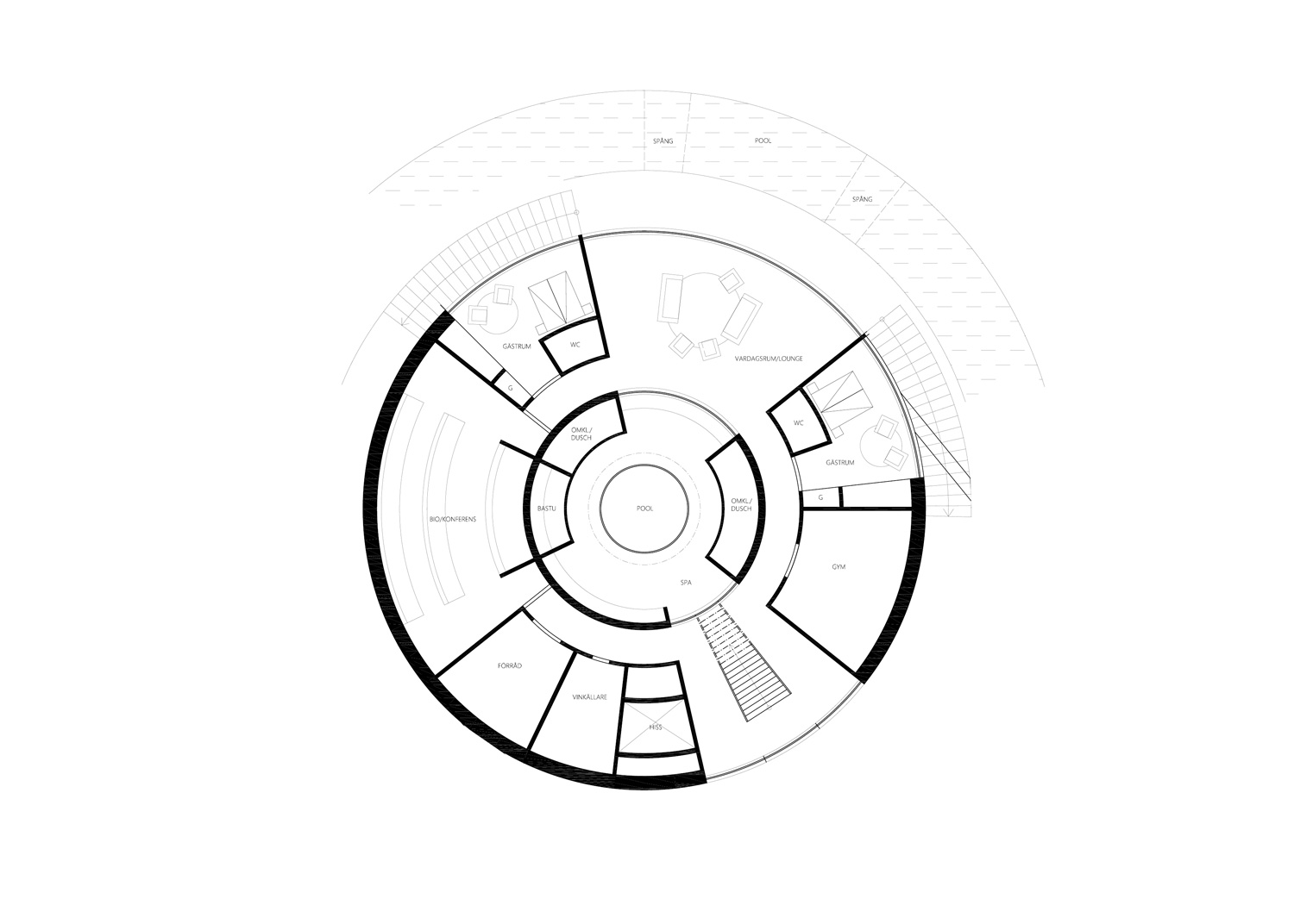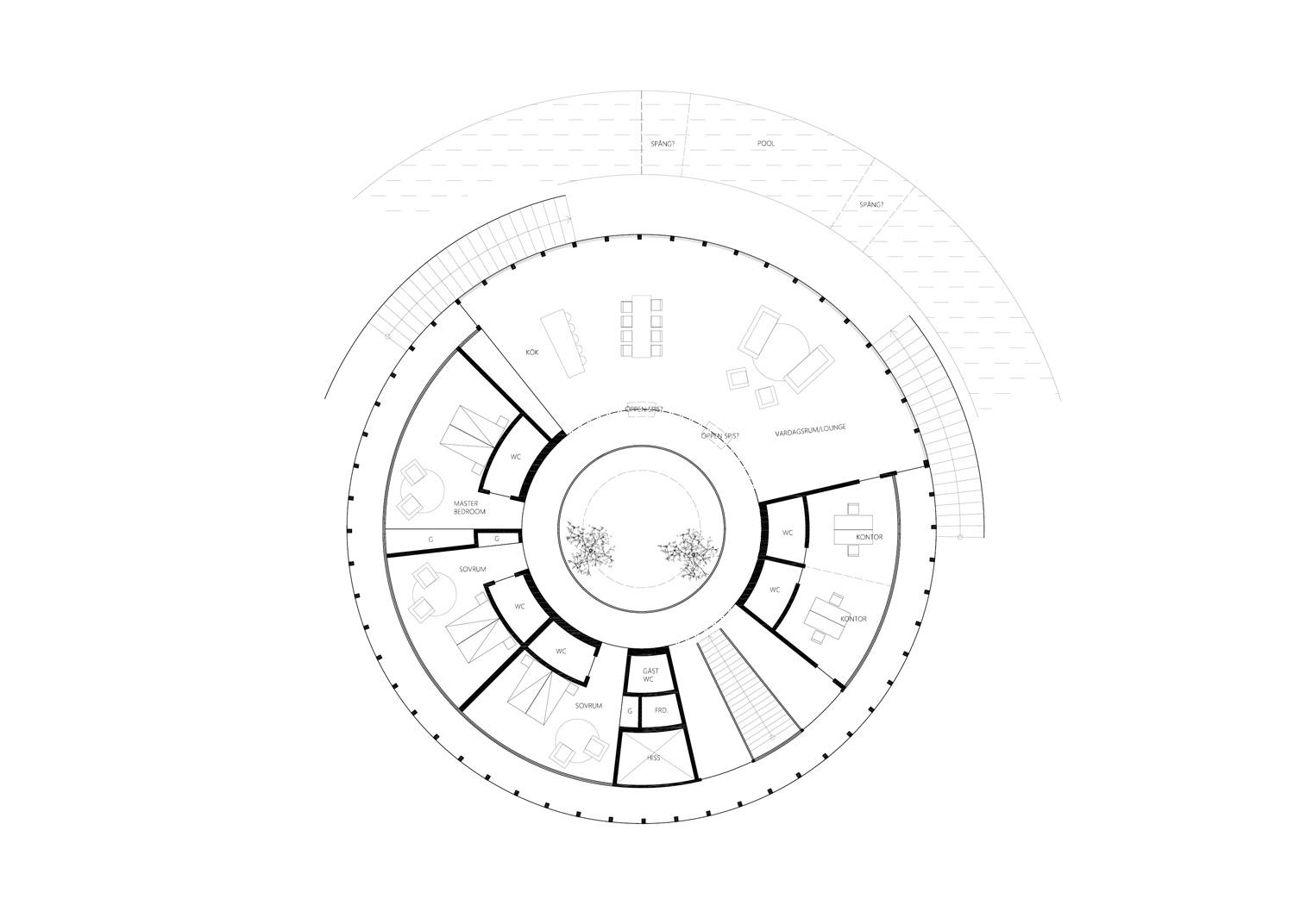 The circular shape of the building eliminates any rear sides and creates a radial sequence of rooms, each with its own unique outlook, reached from an inner circular communication line. Because of the sloping site the main entrance to the building is situated on the upper level, where the living areas, kitchen, bedrooms and offices are located.