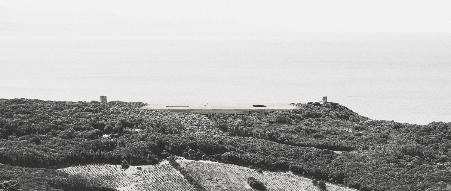 The linear chain of a wine production for the traditional regional Muscat lies as a lowered bridge in the tension between the two ruins of former windmills, which shape the landscape of Morsiglia.