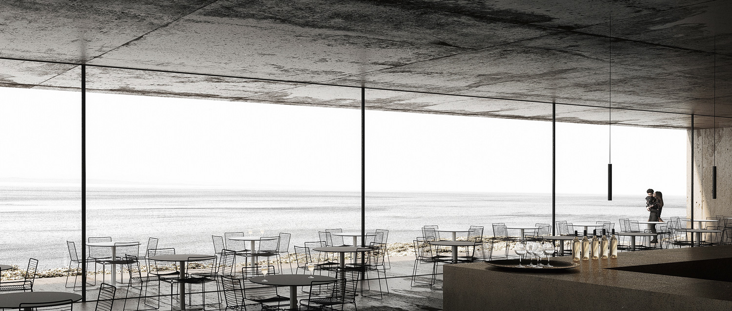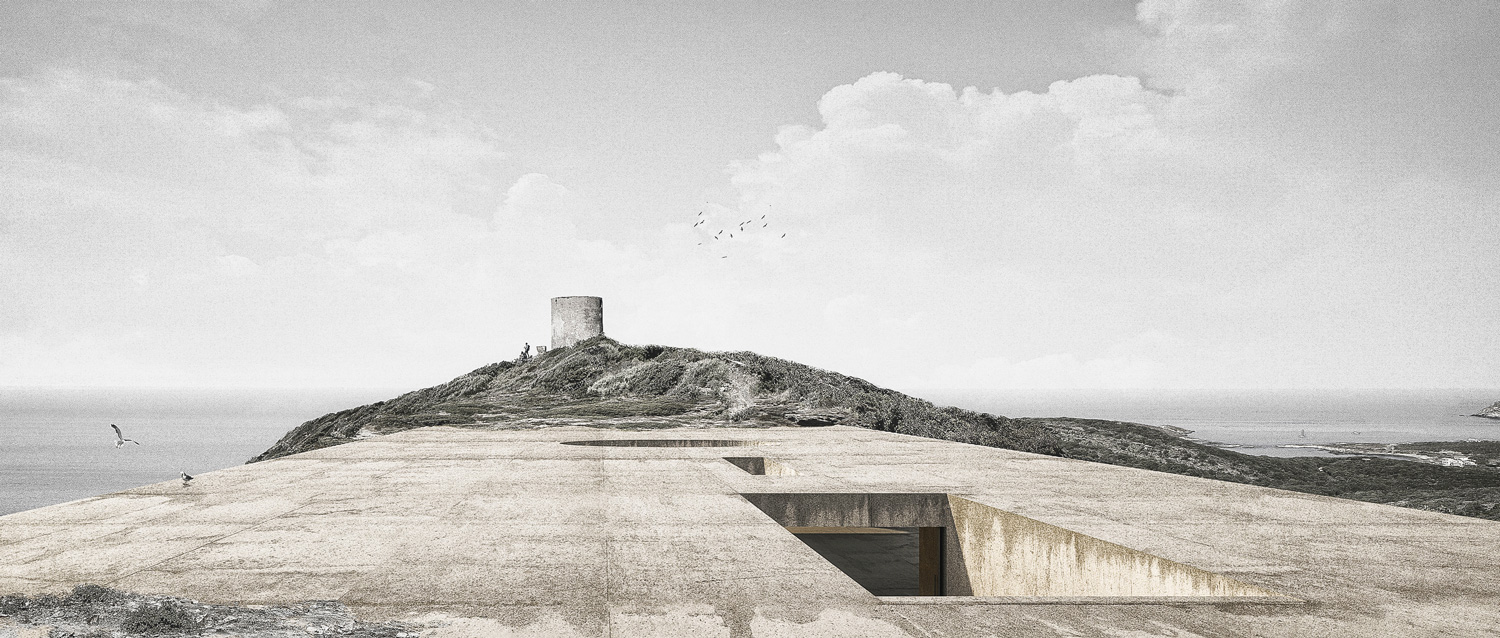 The mountain range of Monte Grosso leads the visitor along a long-distance hiking trail through a typical macchia forest to the newly created plateau. As if by chance, an open staircase opens into the foyer of an open visitor level below. Two large openings are oriented to both the land and sea side. The shop and restaurant area are assigned to them.
