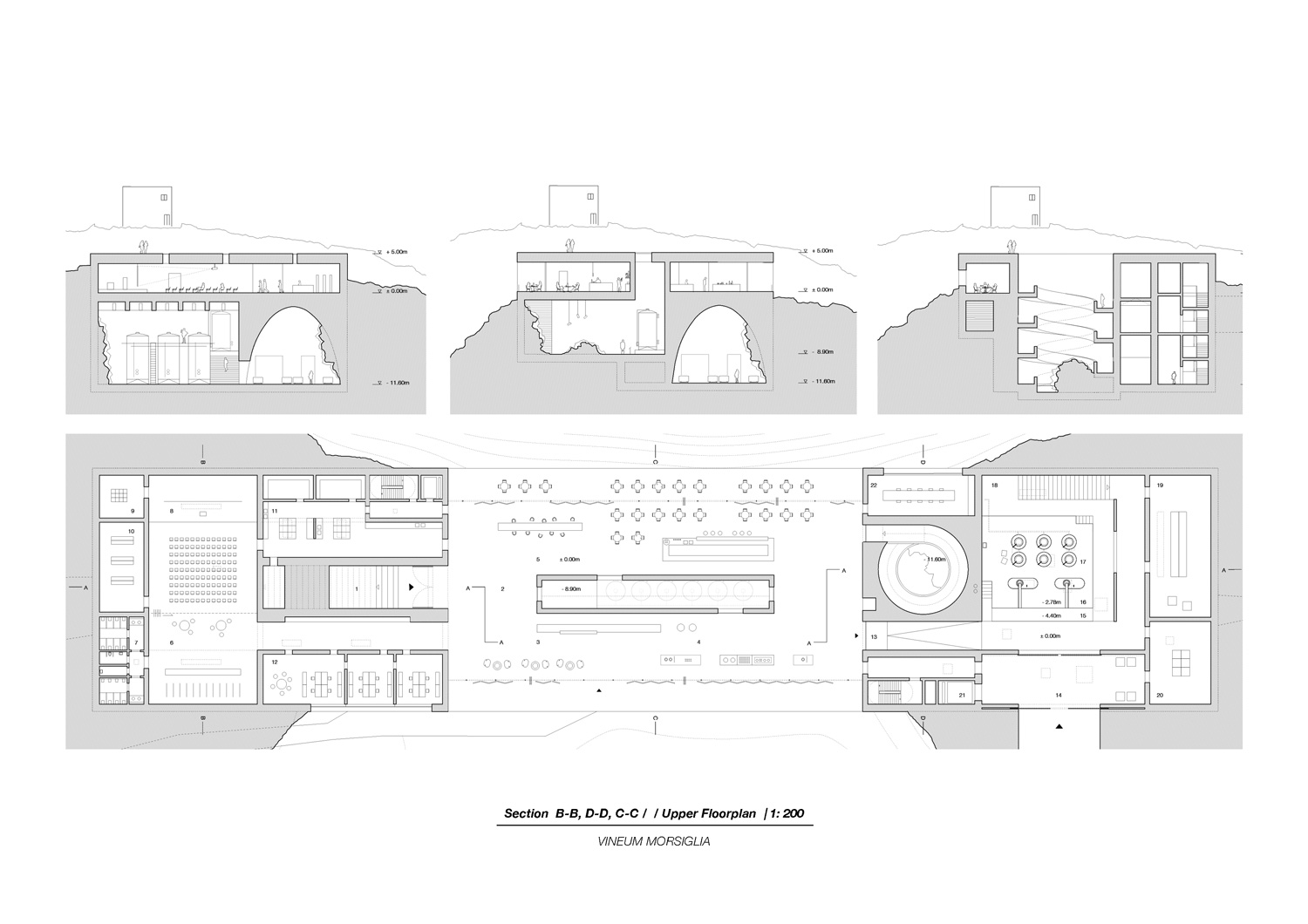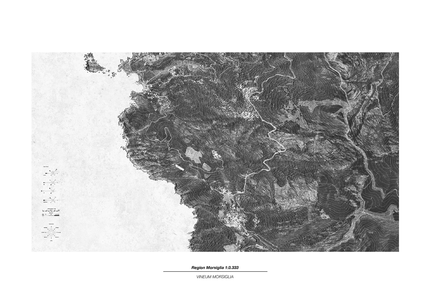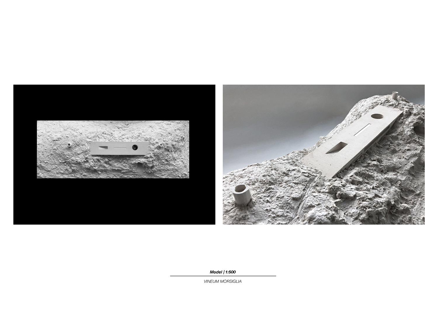 ☉ Vineum Morsiglia is an academic project by Jannis Petereit designed in 2020. It is located in Corsica France in a seaside setting. Its scale is medium with a surface of 7.000 sqm. Key materials are concrete and stone.
