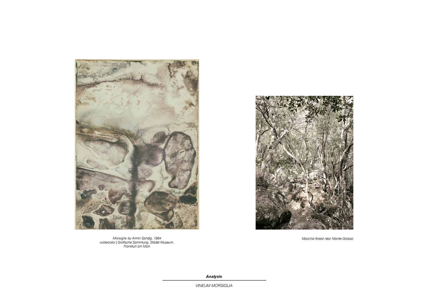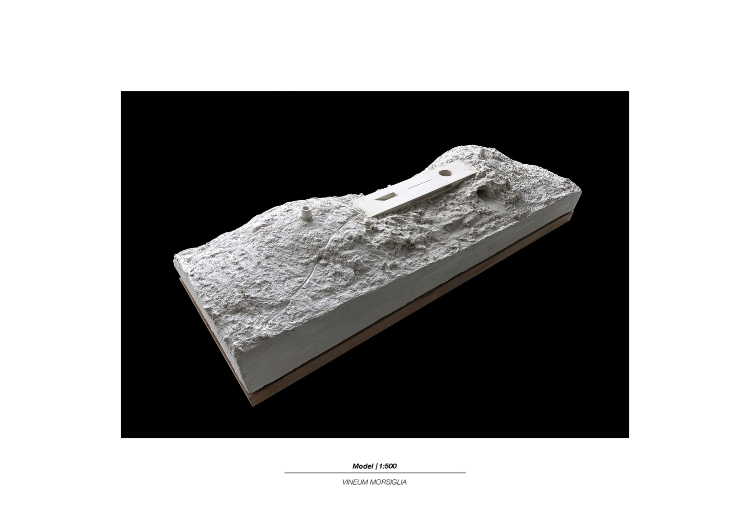 The yellowish slate is decisive for the cultivation of the Muscat du Cap Corse. The proposed architecture represents an equilibrium, which shows the terroire on the surface in equal parts and forms a physical connection with the rock in the production and exhibition areas. The confluence of millennia-old rock and new, smooth concrete, like Armin Sandig’s watercolor «Morsiglia», creates a contrast that allows the rock to emerge in a special way, makes it tangible, and locates the Vineum in its context.
