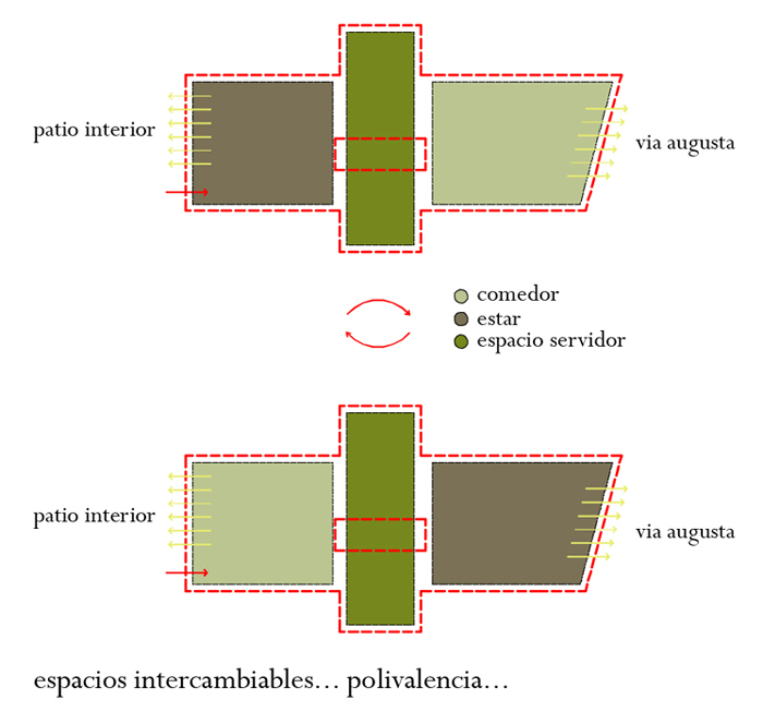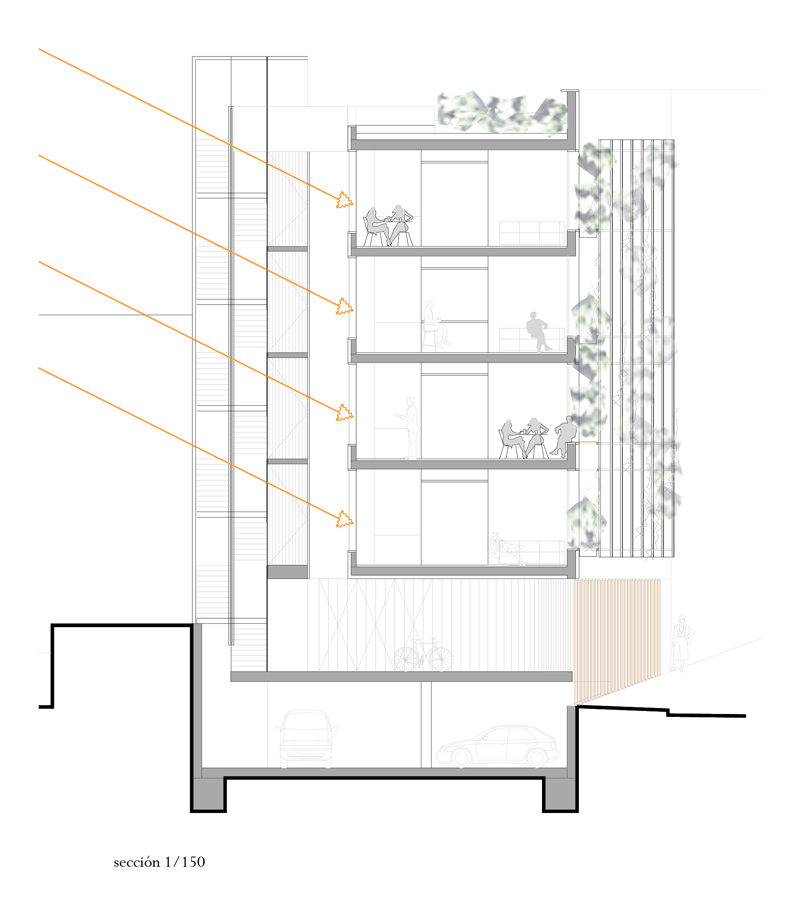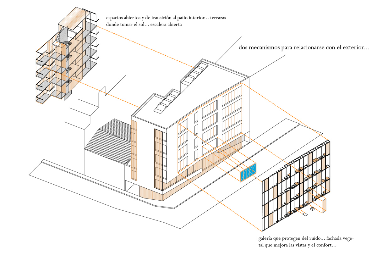 Dos fachadas son dos caras de la misma realidad… la fachada Noreste, a la Vía Augusta, actúa como cojín acústico; una galería plantada que genera paisaje artificial para tapar las vistas a Vía Augusta… la fachada suroeste, al patio interior, es un espacio soleado que sirve de acceso y de ocio en cada vivienda; se gana un espacio exterior. La planta baja es una prolongación del espacio público… un vestíbulo-porche con patios ajardinados… un aparcamiento de bicicletas en la entrada… la compacidad permite liberar la planta baja para colocar todos los trasteros de las viviendas… en el sótano se ubica el aparcamiento para nueve coches y cuatro motos… desde la calle todo ventila y todo se ilumina… los vecinos cruzan el edificio para llegar al patio posterior y descubrir una escalera abierta… un recorrido al aire libre y al sol hasta la puerta de casa. El confort y la sostenibilidad… ajustando las dimensiones de las ventanas, con las fachadas proyectadas, vidrios y aislamientos, el edificio tiene una C en demanda de calefacción y de refrigeración (y cumple con la HE-1)… con biomasa la etiqueta final que conseguiría en calefacción sería la A, y es probable que la etiqueta final fuera una B, ya que pesa más la calefacción (un 75%) que la refrigeración (un 25%)… se centralizan los servicios para mejorar su rendimiento y mantenimiento… la ventilación está asegurada gracias a la doble fachada y las estancias interiores se reducen al mínimo… la orientación permite disfrutar del sol en varias horas del día.