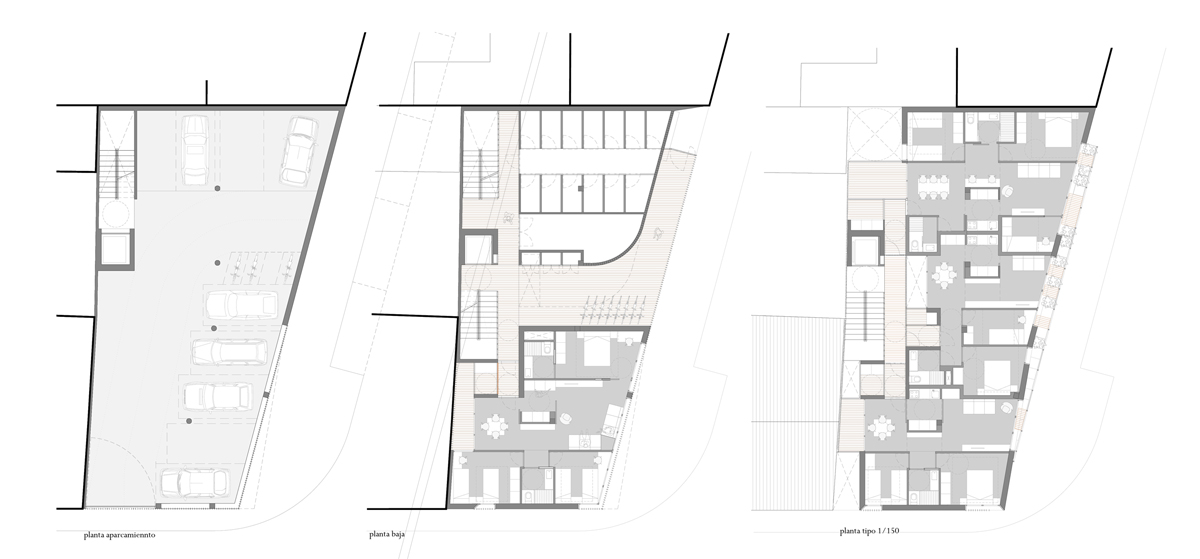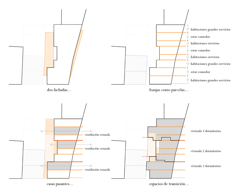 Sarrià es una villa de campos y huertas, de mercados y conventos, de callejones y placitas… la Vía Augusta abre una herida en el barrio y se convierte en un límite… las aceras se tienen que repoblar, se tienen que devolver al pueblo. El solar ocupa una situación contradictoria… La fachada principal mira hacia Vía Augusta y da la espalda al barrio… la fachada larga, con más superficie, está orientada a Noreste, con poco sol… el edificio es pequeño y se enfrenta a una gran infraestructura… el volumen pertenece al entorno histórico de Sarrià a pesar de encontrarse en un límite… las viviendas tienen que aprovechar el silencio y la naturaleza pero se construyen al lado de uno de los principales accesos a Barcelona. El objetivo del proyecto es conseguir la máxima calidad, confort y polivalencia en las viviendas… hará falta leer las leyes del pueblo y buscar la forma de dejar entrar al sol (al sol, solet)… como en las casas del Sarrià antiguo, la relación entre el interior y el exterior se produce a través de filtros; la verdadera arquitectura sostenible… se tiene que conseguir abrir al máximo las viviendas hacia el patio interior, la fachada más soleada. El espacio es reducido y hay que aprovecharlo al máximo; cada cosa en su lugar… ordenando las piezas y jugando con los espacios intersticiales se puede ganar un espacio vital… el solar se fragmenta en franjas como las parcelas del casco antiguo de Sarrià… una casa pasante… se abren las vistas del interior hacia la calle, convirtiendo el edificio en transparente… convirtiendo las dos fachadas en jardines… en la parte delantera, la calle donde colocar los tiestos; en la parte trasera, el jardín donde sentarse y tomar el sol. Las viviendas son un espacio reducido, pero lleno de complejidad y riqueza… una cancela que resguarda la privacidad… un lavadero, un espacio intermedio donde tender la ropa… un comedor soleado con una terraza al sol… una cocina que hace de articulación de la vivienda y se puede cruzar… un lugar de encuentro con una mesita para leer o estudiar… dos o tres dormitorios tranquilos y un baño… una sala de estar diáfana y una galería-jardín de invierno que extiende la sala hacia el exterior.