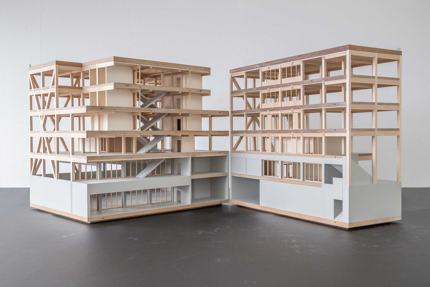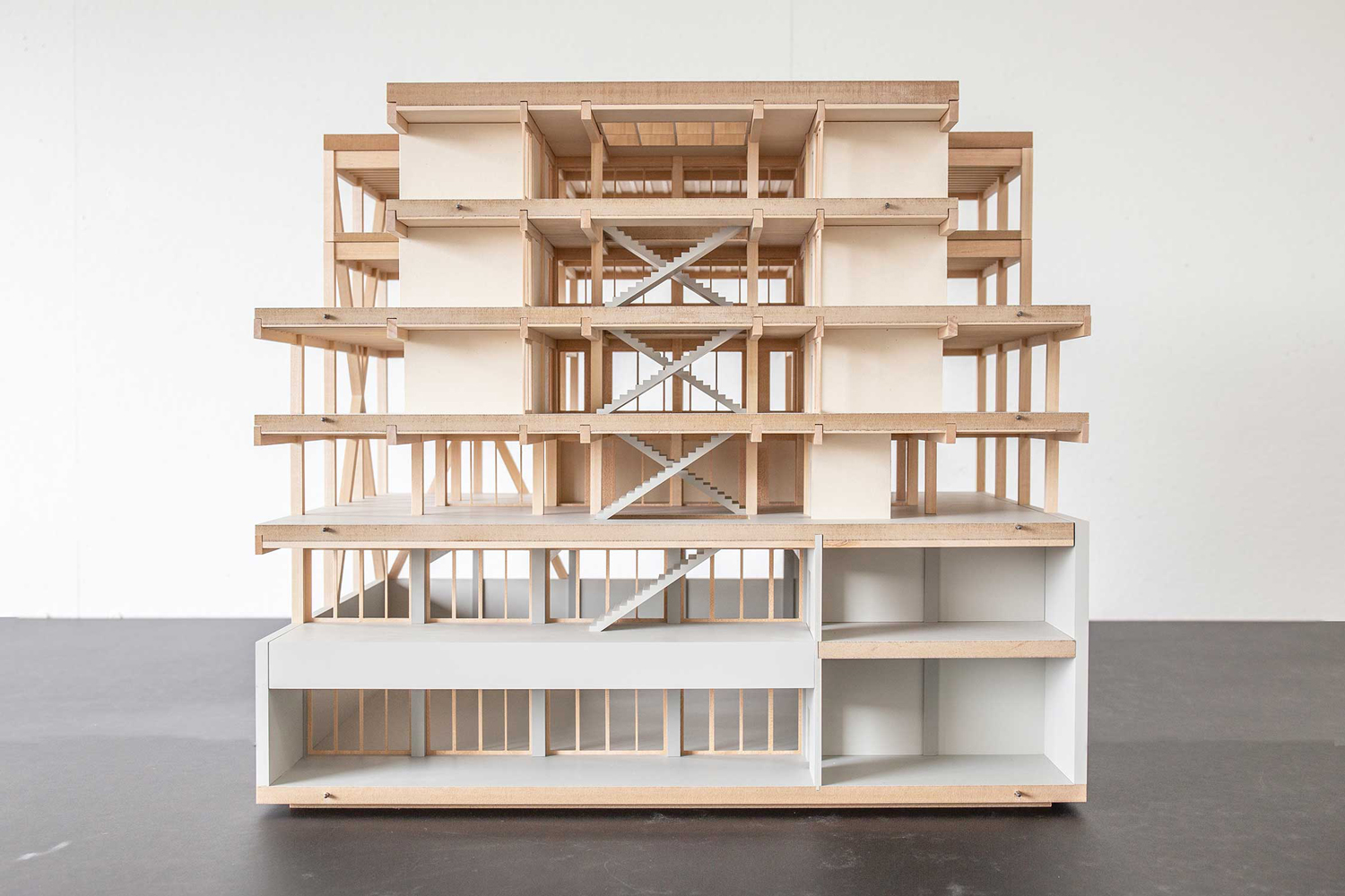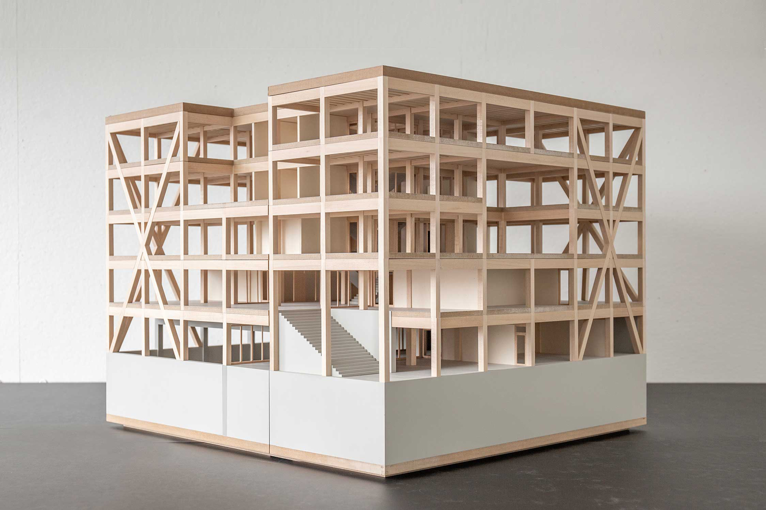 Die klare strukturelle Gliederung des Baukörpers und die Materialisierung der Fassadenhaut prägen den Ausdruck des neuen Schulhauses. Es entsteht ein spannungsvoller Baukörper mit individuellem Charakter einer kreativen Lernwerkstatt. Für das neue Schulhaus wurde ein konsequentes Holzskelett-Tragwerkskonzept ausgearbeitet. Der Holz-Skelettbau wurde so ausgelegt, dass keine inneren Tragwände notwendig sind. Die statische Struktur ermöglicht eine maximale Flexibilität für innenräumliche Umstellungen die jederzeit problemlos realisierbar sind. Die Bauweise reagiert so auf die sich stetig verändernden Bedürfnisse und die damit verbundene Veränderbarkeit der Raumkonstellationen. Der reduzierte Wandanteil verleiht dem Schulhaus seine innere Leichtigkeit und Transparenz.