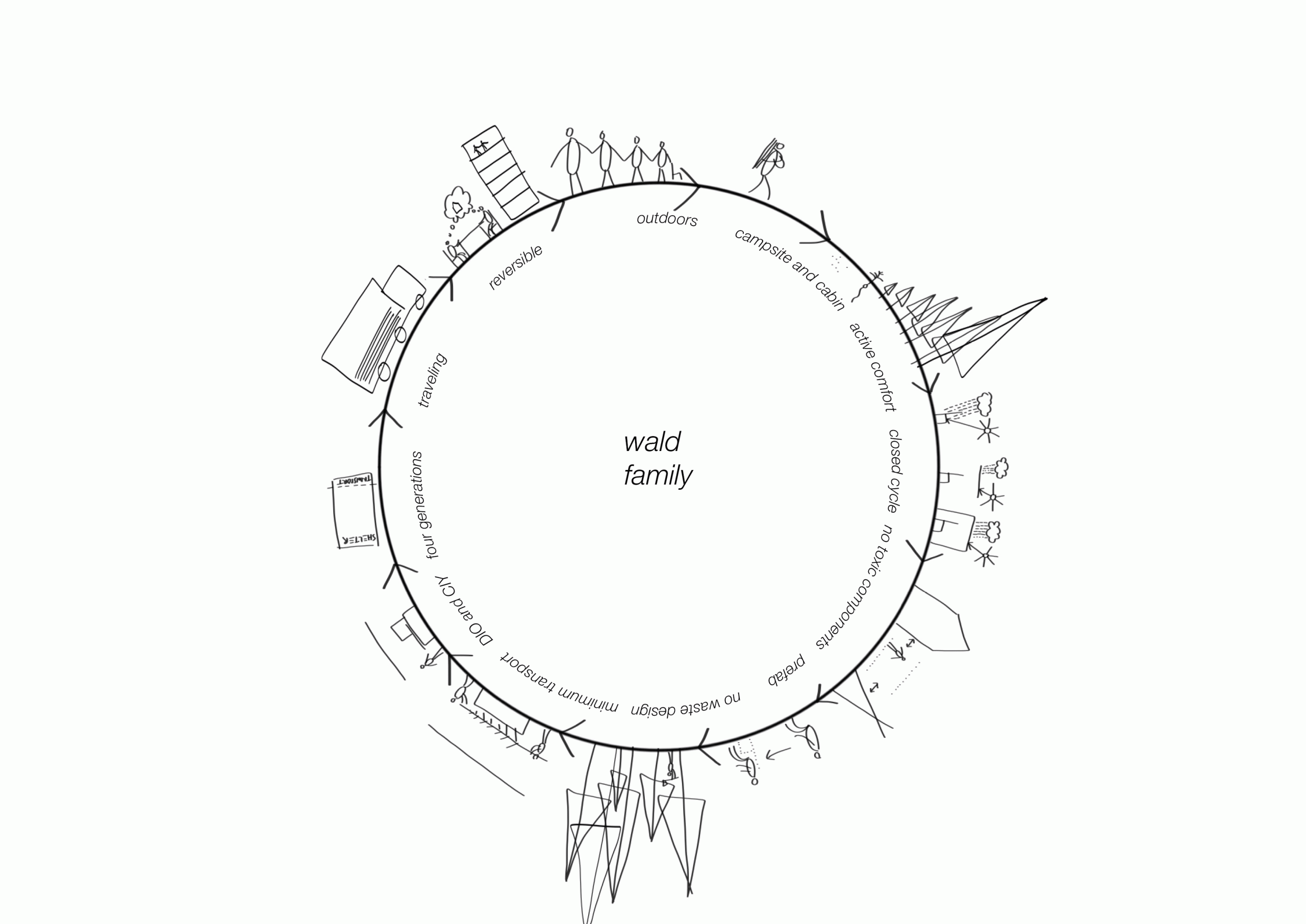 Aixoplucs is about making lasting, reversible, ambulant, biodegradable, self-built shelters, in collaboration with manufacturers from all over, using their local resources (techniques, tools and materials), producing no waste and no packaging. Wald is the german word for forest. Prefab villages for abandoned camping sites and other lost locations. An open system meant to build a whole fabricated + self-build community, where neighbors assemble their own dwellings. This is a rambling family, it can settle wherever these kind of panels are made. The first installment will be placed in an abandoned mediterranean camping. Its empty trailers and mobile homes will be used for communal purposes. A new off-the-grid community.