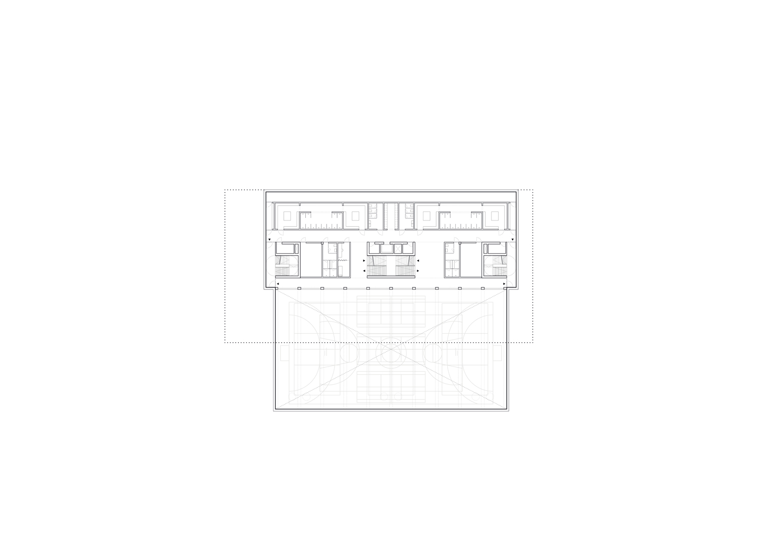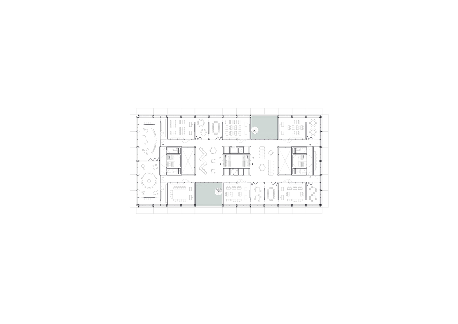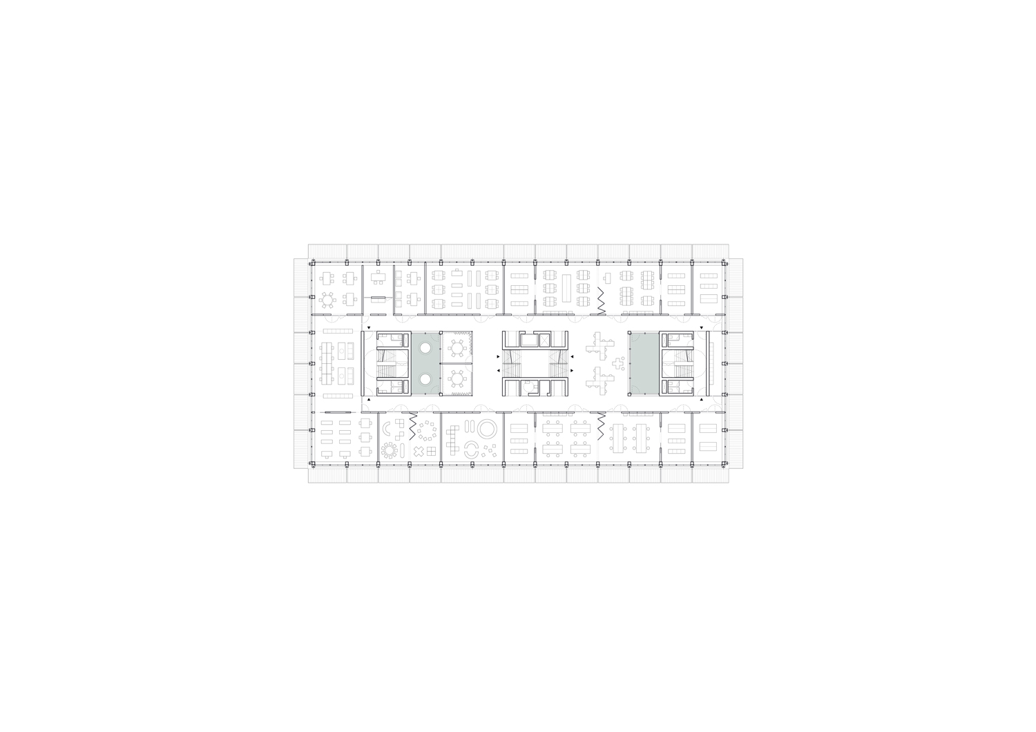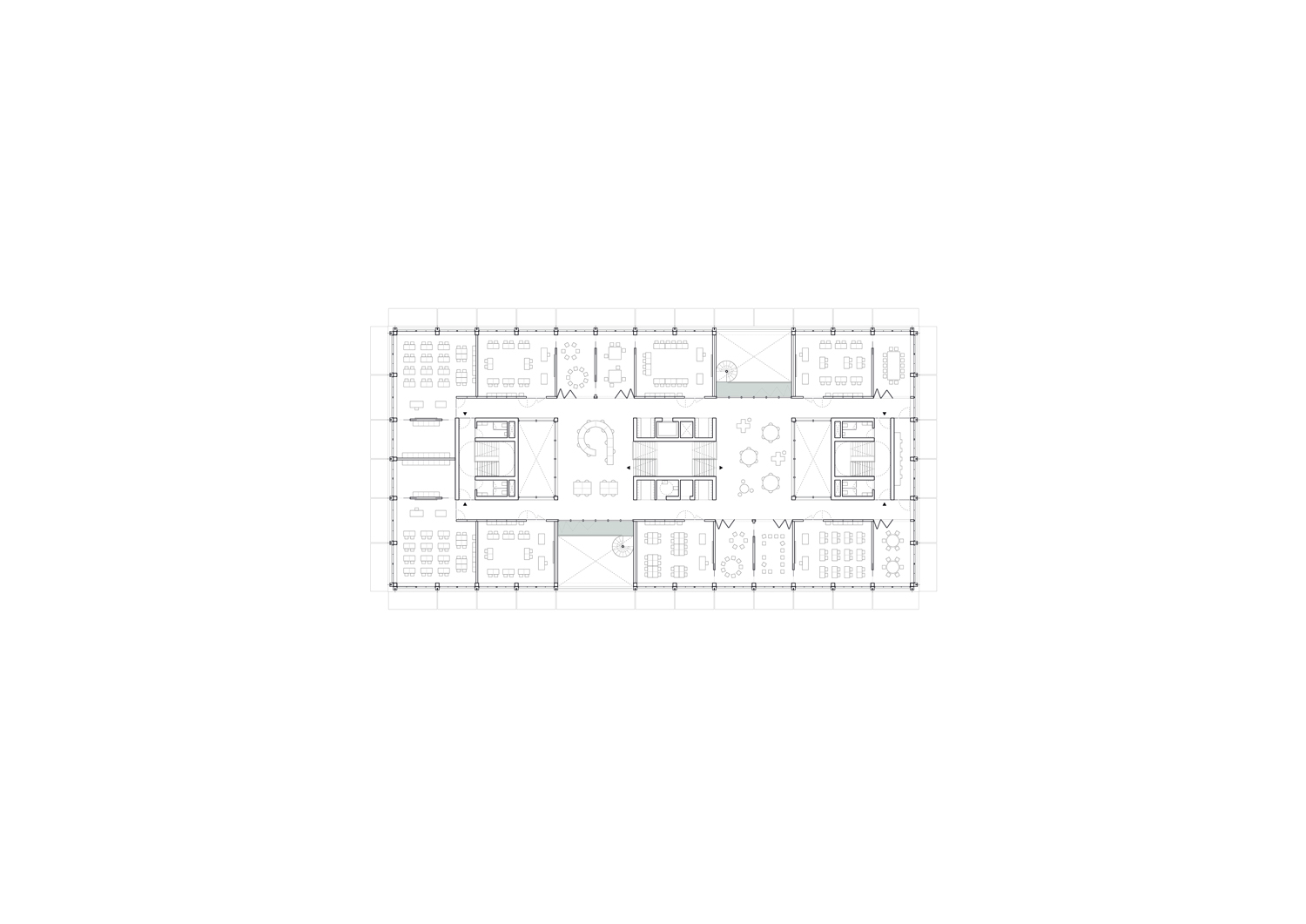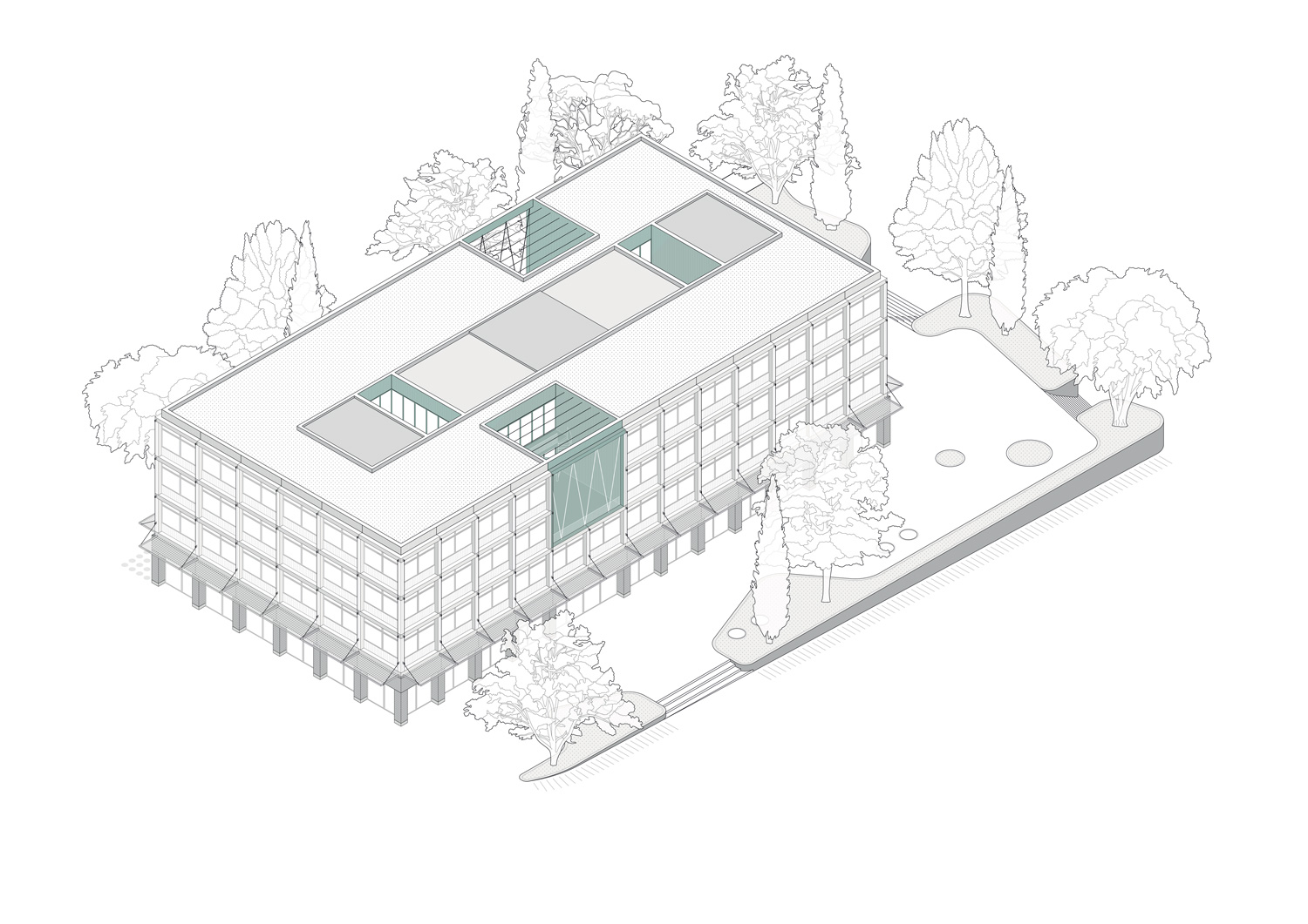 Interior configuration is clear and systematic. Two side bands group the teaching spaces. This allows all classrooms to approach the perimeter and be naturally illuminated. The central band, where services, communications and intermediate spaces are located, is completely released. The introduction of large terraces allows these spaces to have direct contact with the outside. This approach provides great flexibility, since it allows generating more compartmentalized and independent configurations while incorporating the intermediate spaces into the teaching environments. This aims to promote socialization and spontaneous encounters, events that help to weave an interpersonal network, in favor of the common versus the individual.