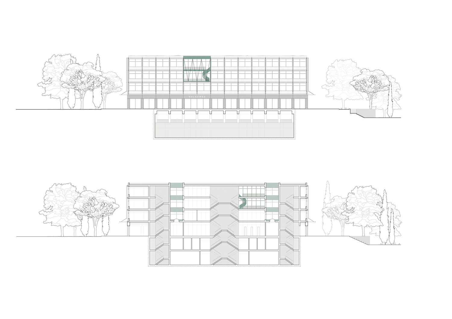 The project aims to reaffirm the innovative concepts proposed in the future development of the Walkeweg neighborhood. The design strategy opts for compactness. This approach offers larger recreational spaces, where rest, activities and events become frequent activities for the community. In turn, transparency and permeability are enhanced, not only on the ground floor but also on the landscaped terraces. These elements are responsible for fragmenting the volume and filling the project with life.
