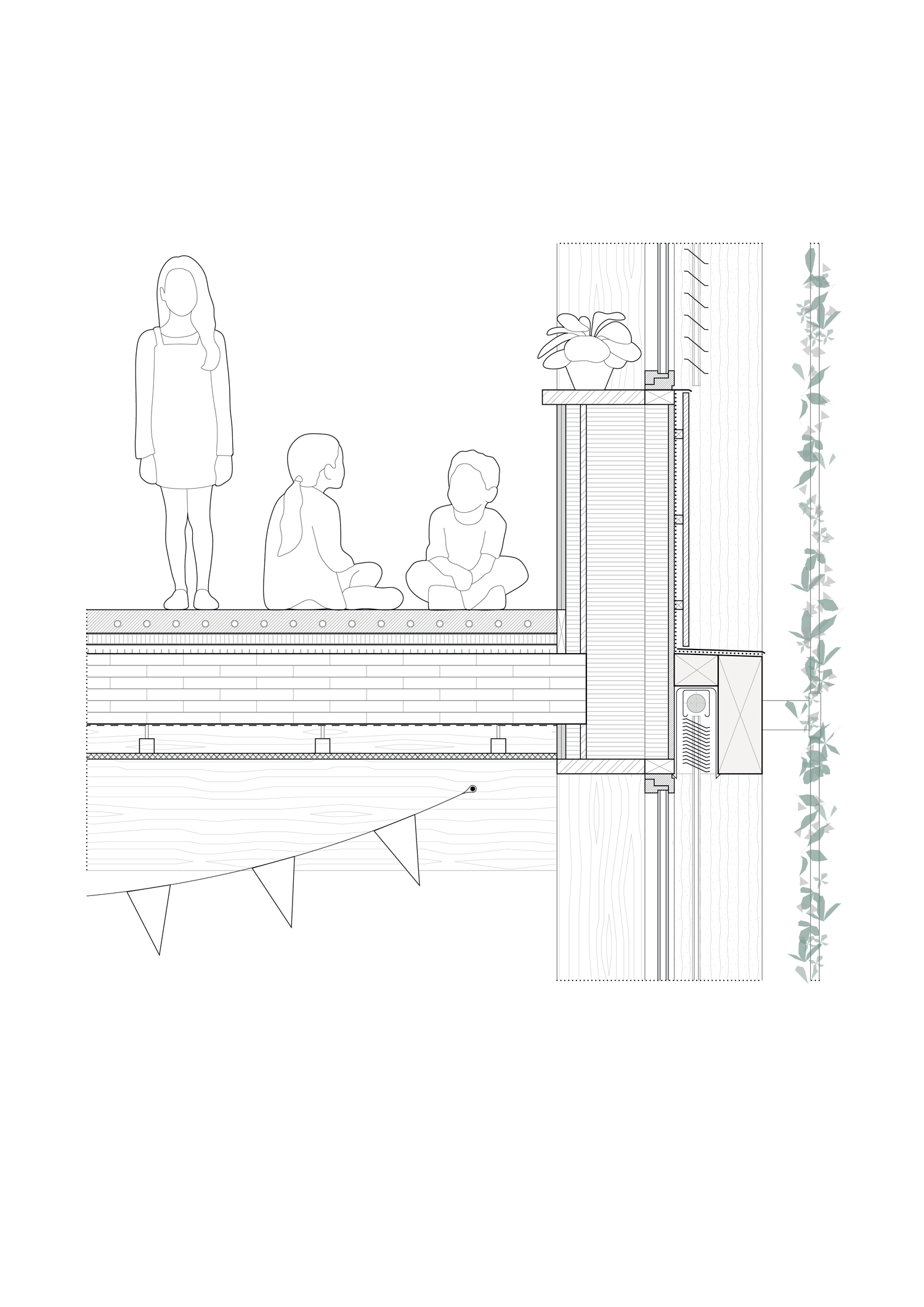 The new school aspires to become an example of sustainability and pays special attention to the climate aspect. The project is covered with a vegetal veil that incorporates bio-habitability into the teaching spaces, something that not only has a very positive impact on the thermal comfort of the building, but also on the sensory and perceptual development of children. Constructively, longitudinal pots are projected above the ground floor structure. From this point, the vegetation is born and grows by the braces that surround the volume. This creates cool, shaded spaces around the perimeter, helping to blur the physical boundary between interior and exterior.