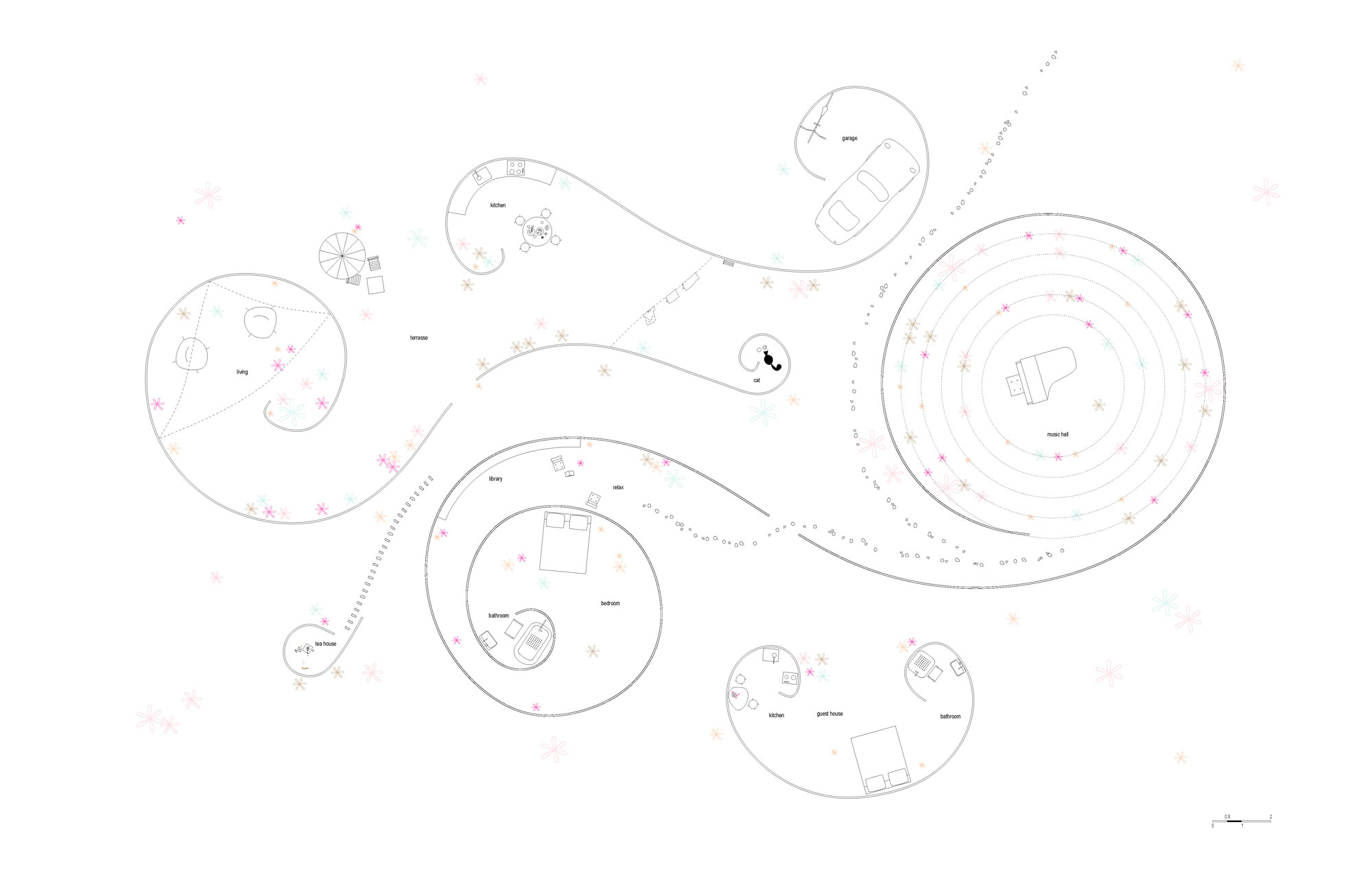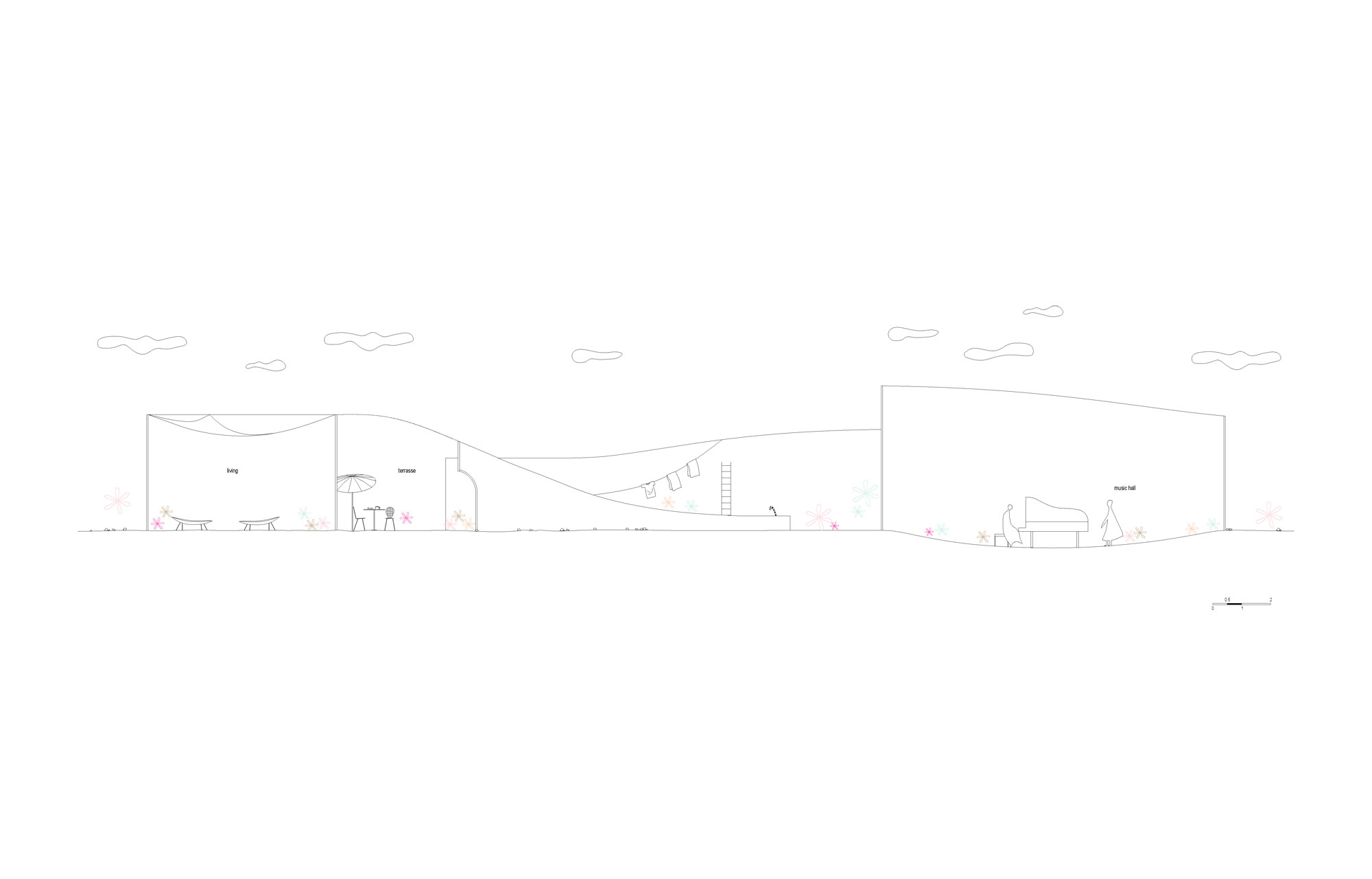 The theme of the competition is “a house for two artists”. It’s upon a time two Musicians and a cat called «Maru» living in this House … The house is gently laid in a prairie. Spaces are defined by walls that wind and unwind, go up and down, creating fluidity and dynamism. The house is truly airy and breezy. Nature, Music and Architecture become one.