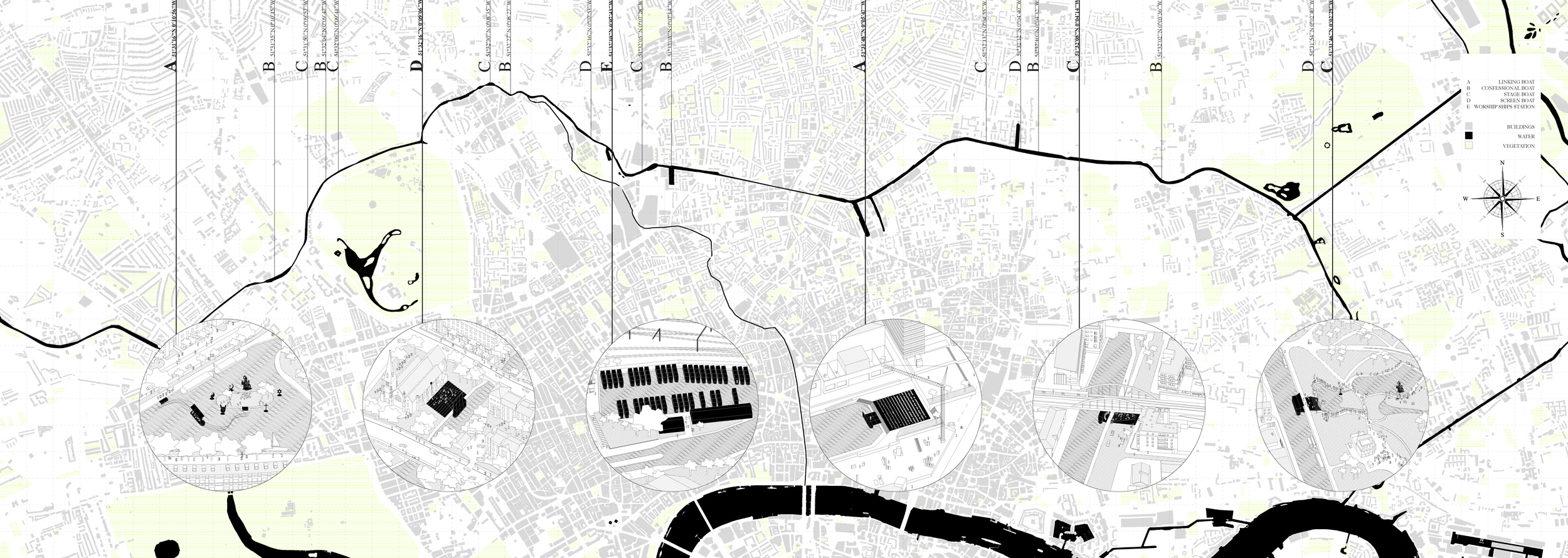 Transforming no-places into new public spaces. Working on a city means taking into consideration the issues of a possible future without coming down to an attitude of specific and individual construction. The aim is to link the territories together, revealing their own identities, trying to use the “already-there”, the mutable and the forgotten. The city will then become a web of relationships rather than a collection of objects. The banks of the Regent’s canal are composed of compact urban densities, sequenced by open landscape structures. It is an environment that conveys urban and non-urban, pastoral and non-pastoral elements. The suggested creation of a new place of worship in London is based on a diagnosis of the current condition of the banks of this canal. The thinking process leads to a citywide project rather than an immediate response from a signal building. From Limehouse Basin overlooking the River Thames in the East to Paddington Branch in the West, 21 sites were selected to represent a range of possibilities.